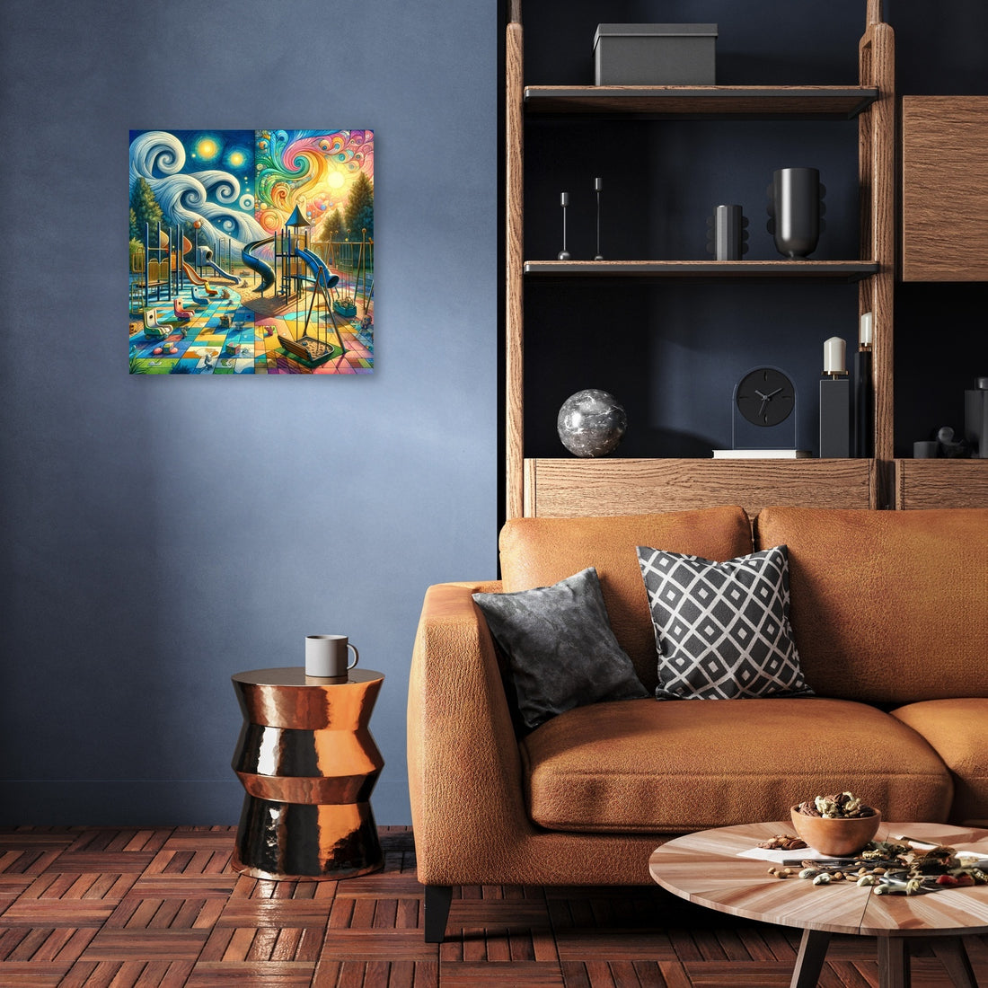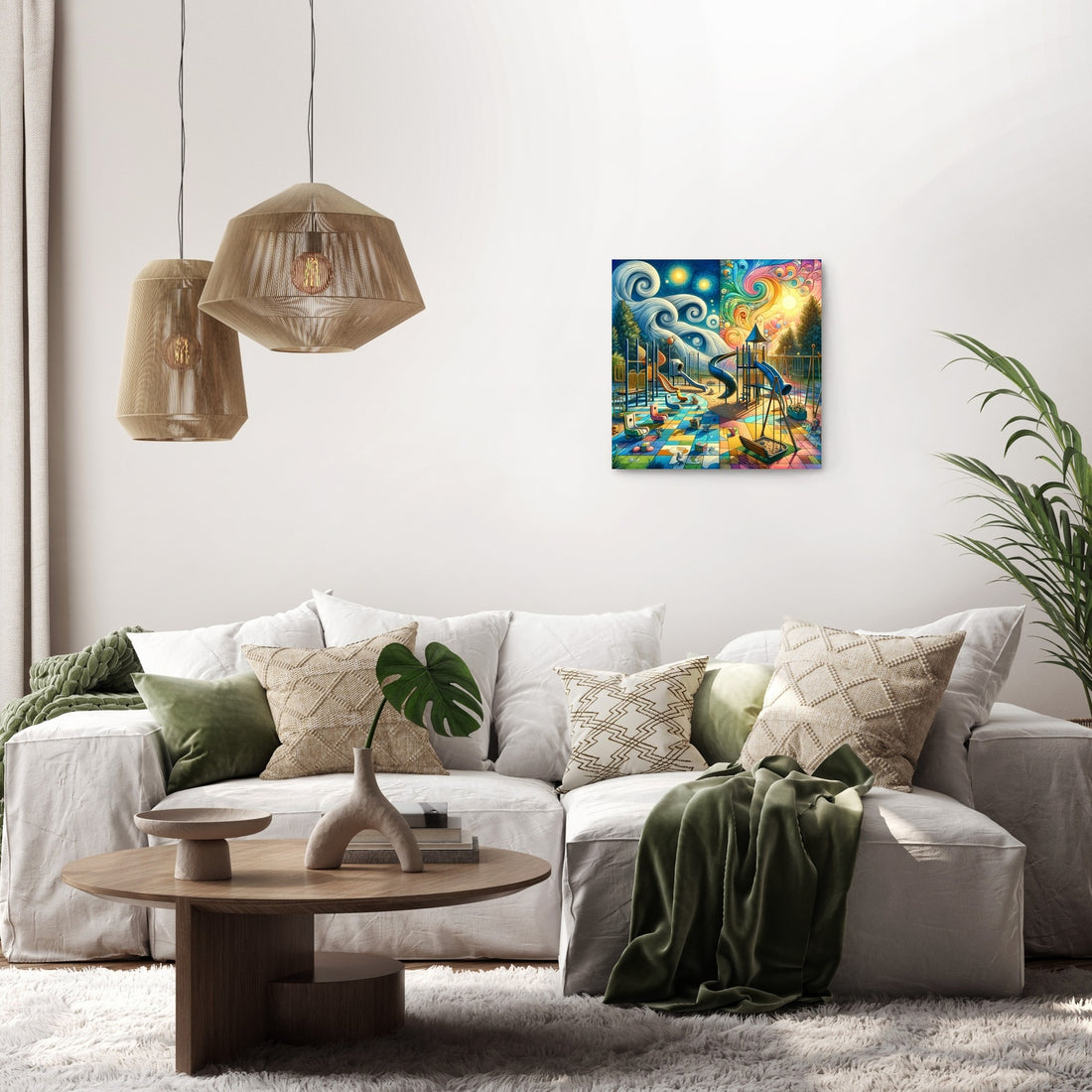 Upgrade your environment with our high-quality wall art that masterfully combines a child-friendly art playground with refined artistic style. Picture a setting where a lively playground merges with artistic finesse. Here, a slide takes on the swirls of a Van Gogh masterpiece, swings mimic the surreal flow of Dali's melting clocks, and a sandbox echoes Seurat's pointillism sparkle. The playground structures are infused with Mondrian's vivid colors, and the ground transforms into a canvas reflecting Chagall's whimsical symbols.