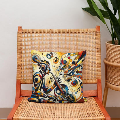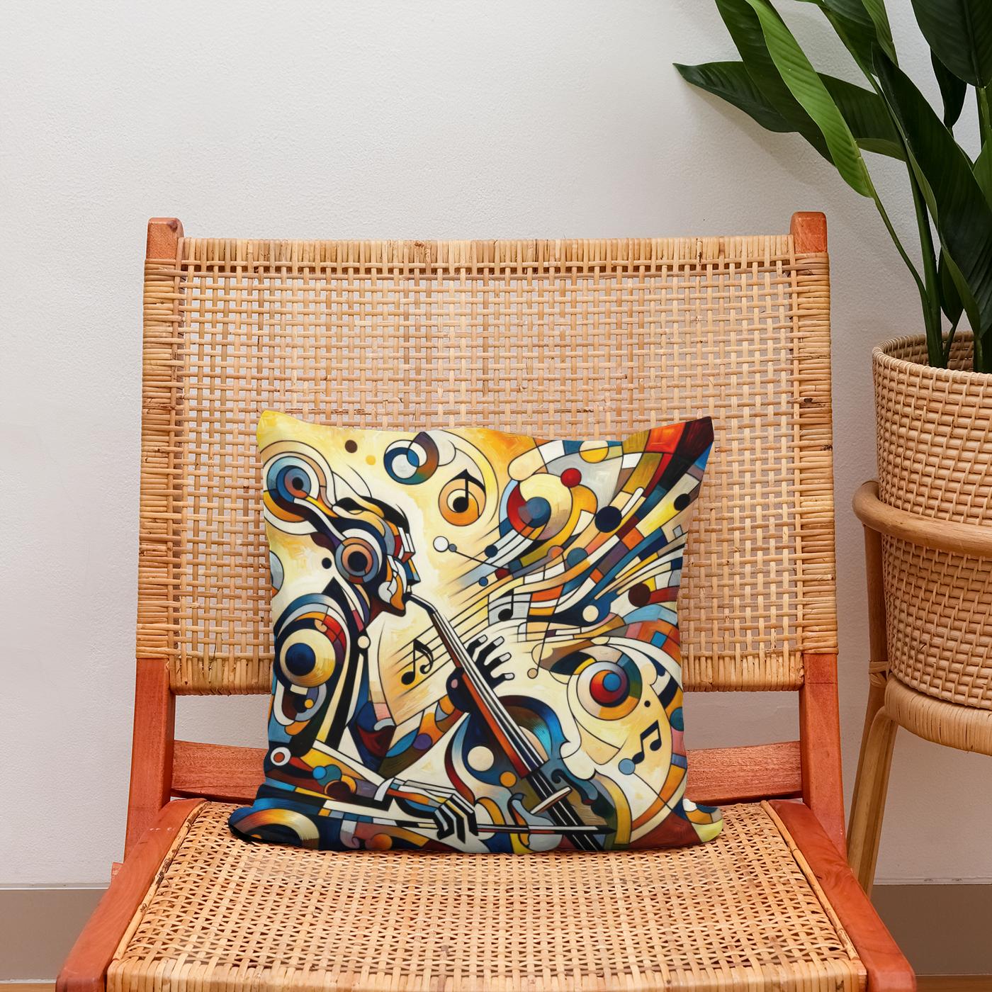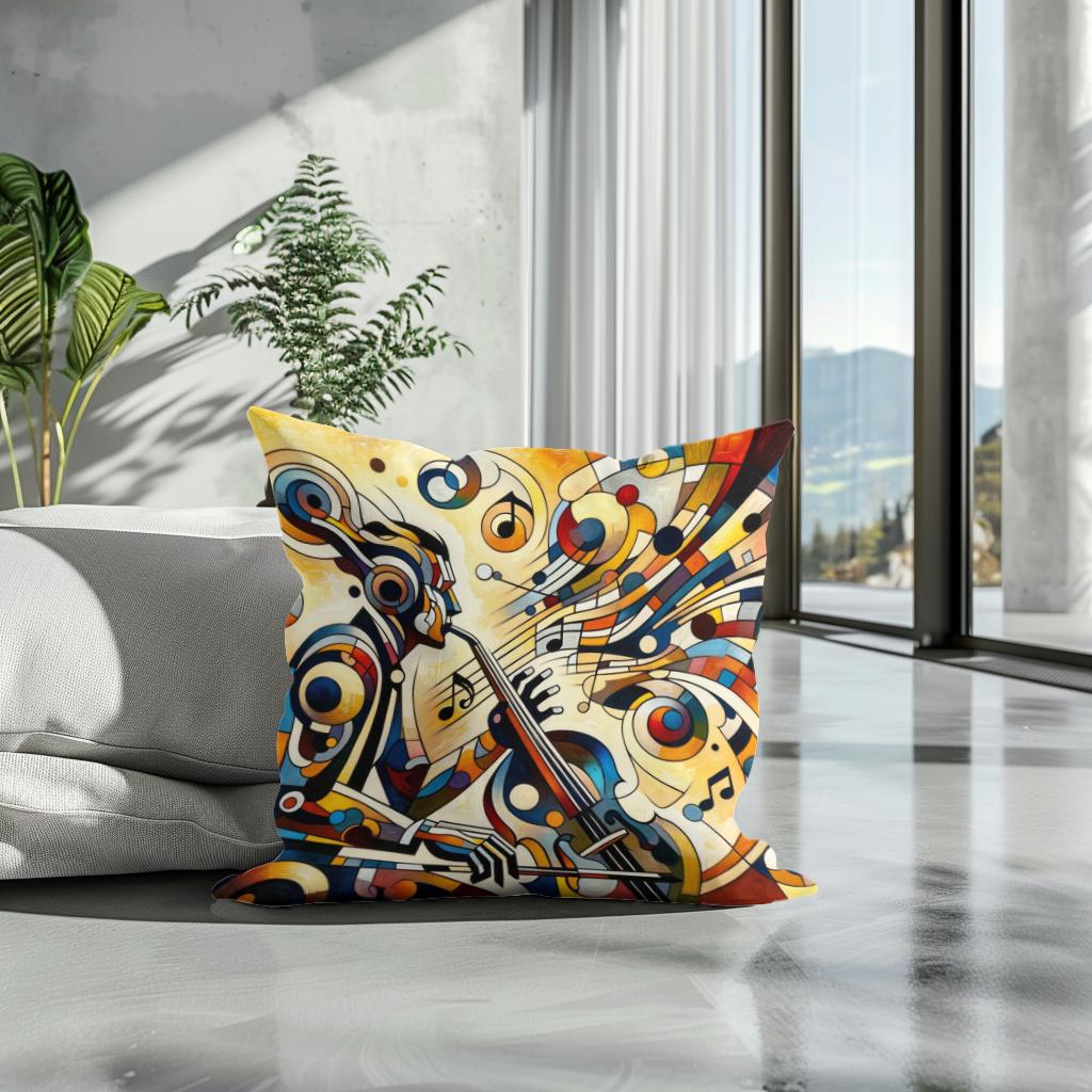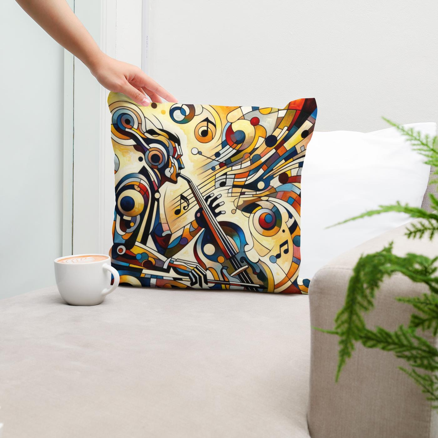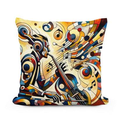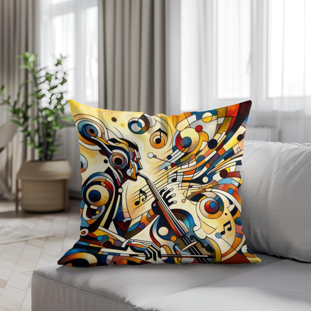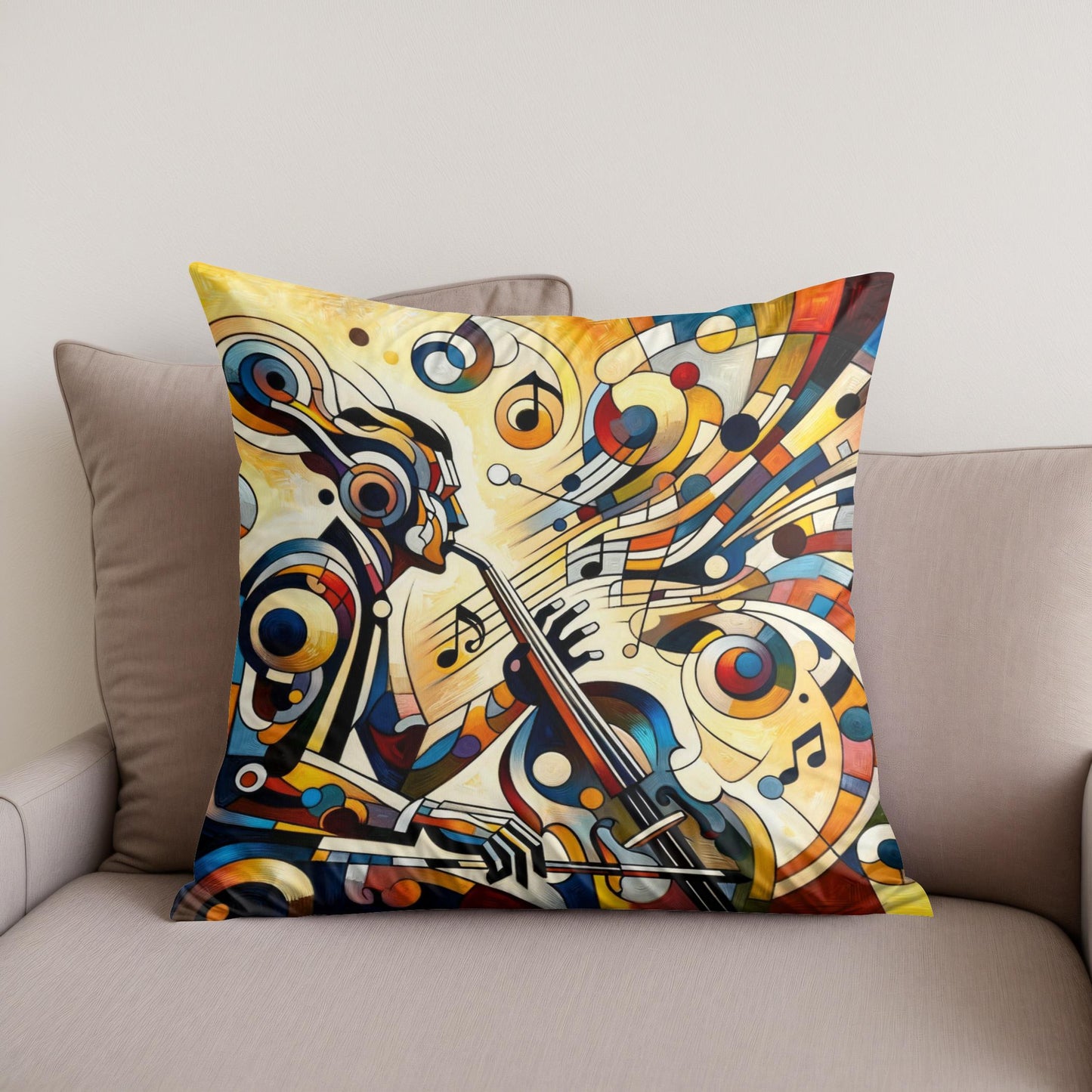 Adorn your home with the vibrancy of music captured on this exquisite printed cotton pillow. The design features an abstract, cubist-inspired depiction of a figure playing the violin, surrounded by a swirling ensemble of musical notes and brightly coloured motifs. Evocative of dynamic sound and movement, this pillow is perfect for adding a touch of artistic flair and liveliness to any room. Ideal for music lovers and art aficionados alike.