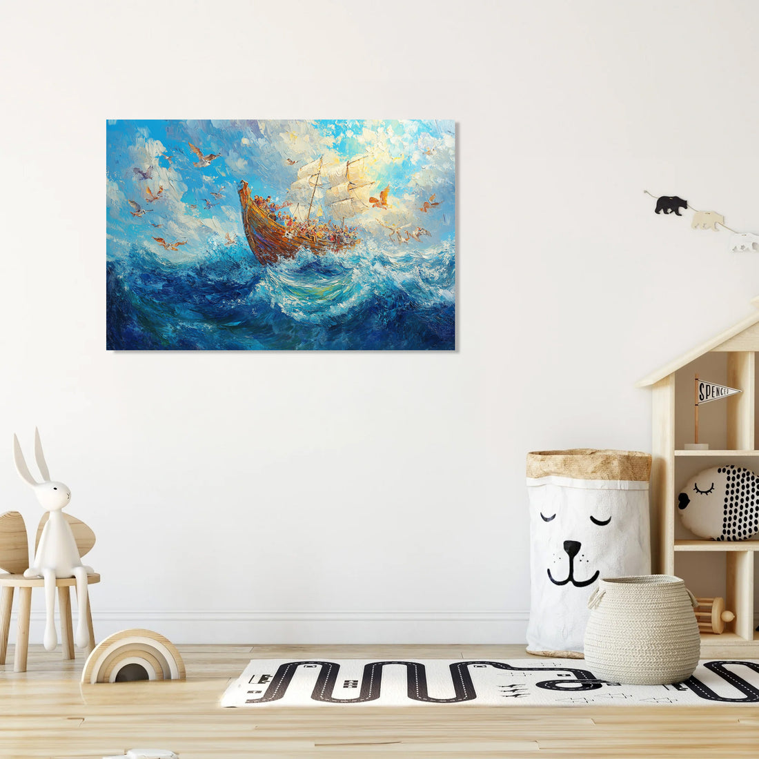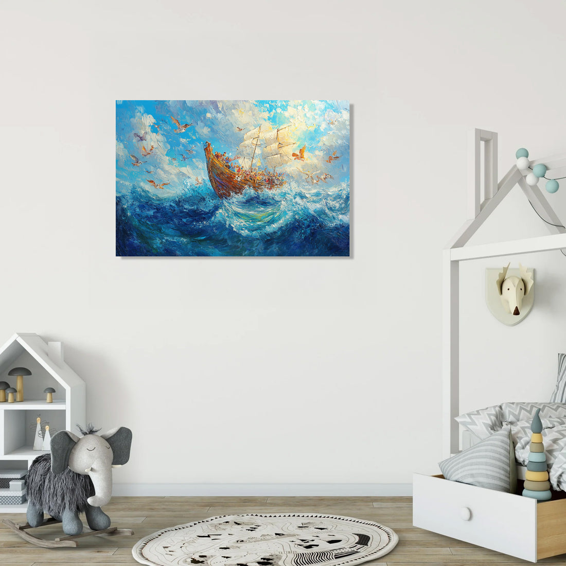This delightful Impressionist artwork depicts an ark brimming with cheerful animals, set against a backdrop of a serene blue sky with fluffy clouds. The visible brush strokes bring life to the playful waves and the joyful expressions of the animal passengers. A perfect addition to any child's room, this painting creates a whimsical and imaginative atmosphere, inviting young minds to dream and explore. Its vibrant colours and lively composition effortlessly enhance the decor, sparking joy and wonder.