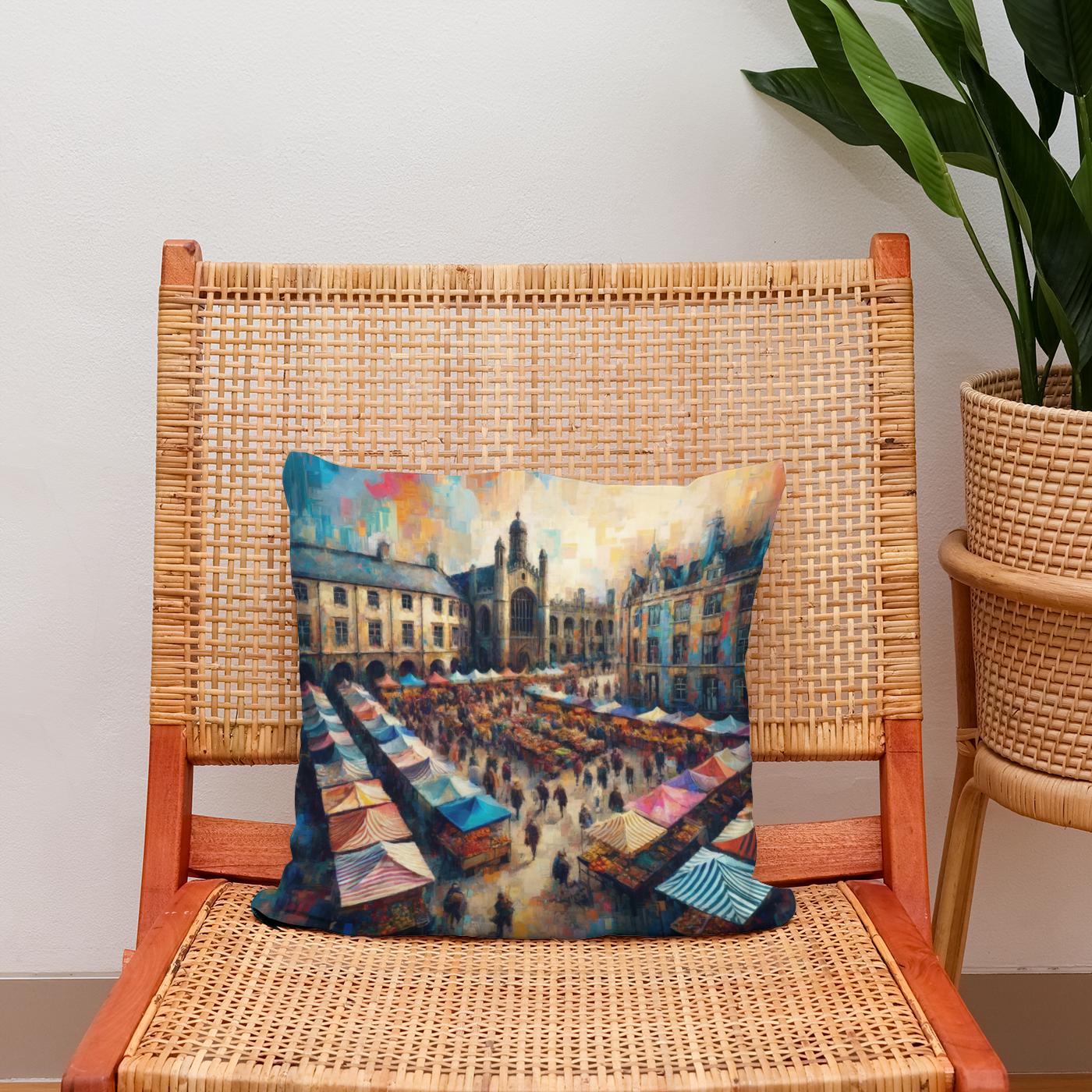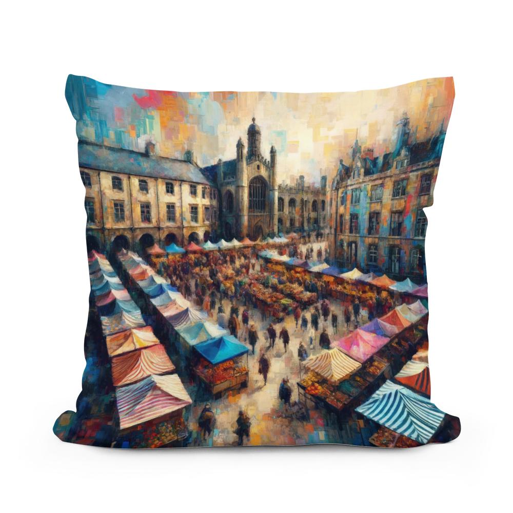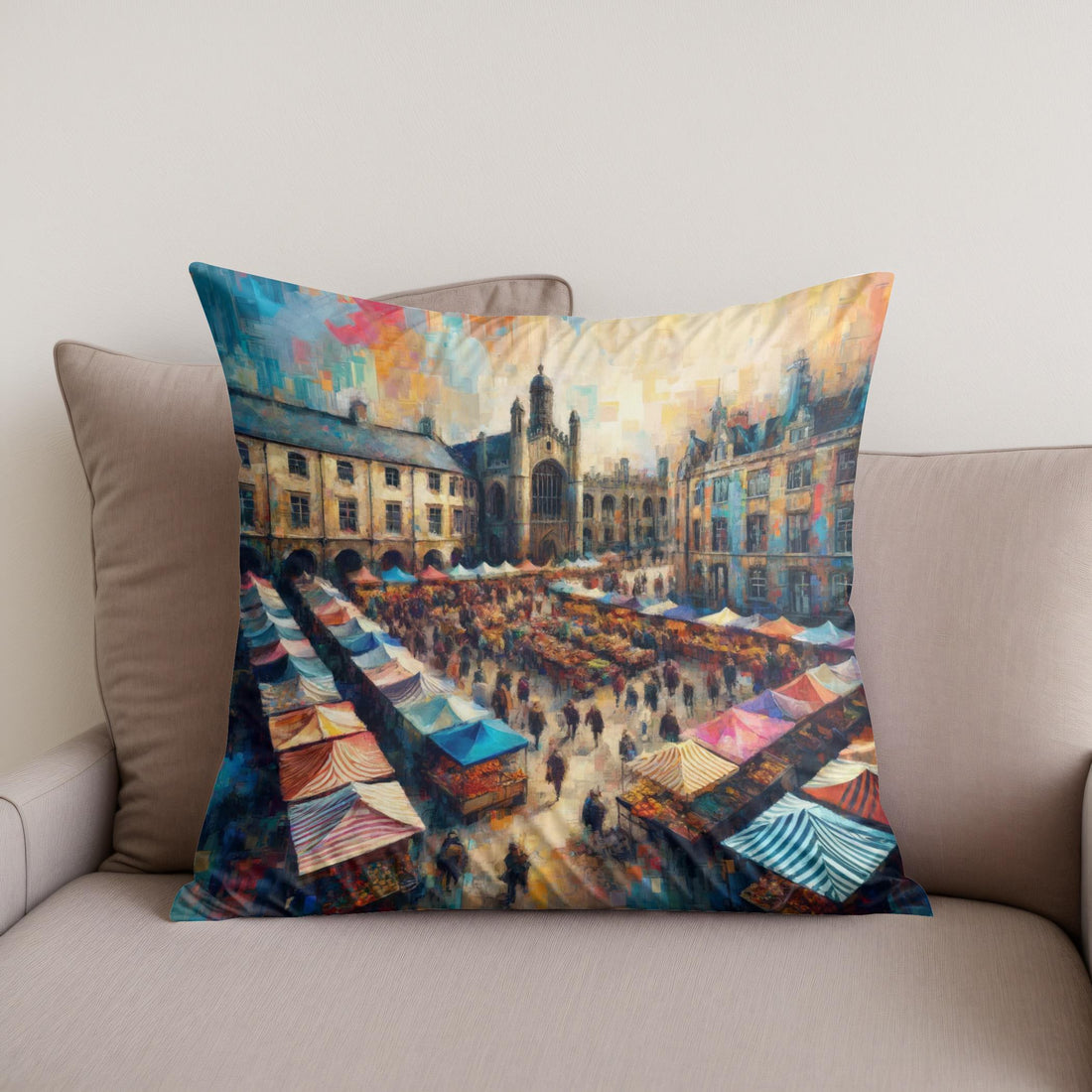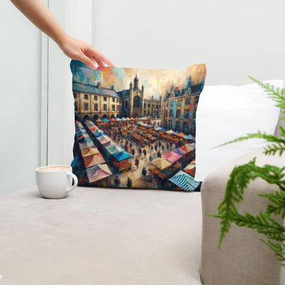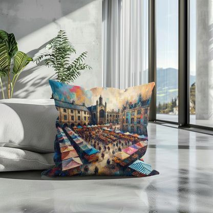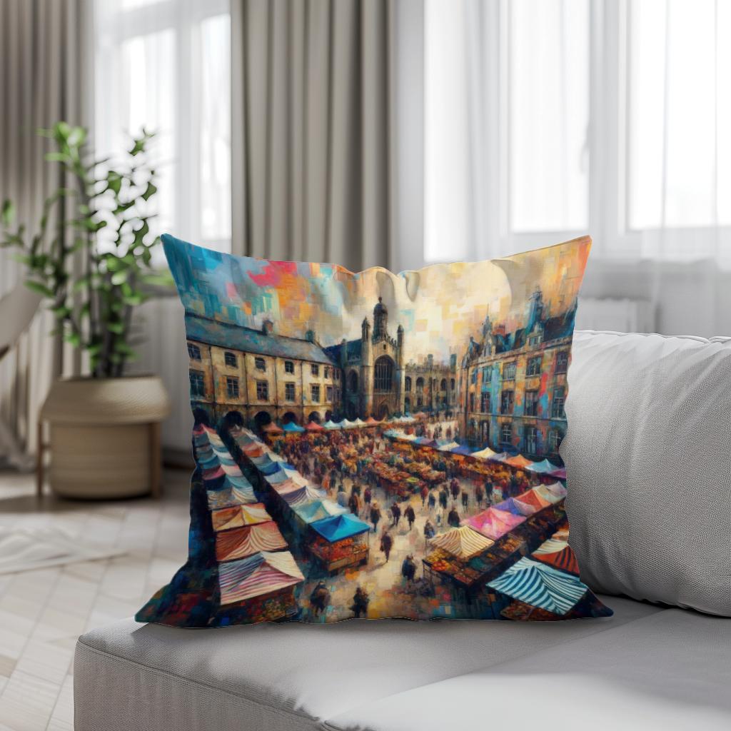 Adorn your home with the vivid splendour of a bustling market square, captured in a stunning impressionistic style on this cotton cushion. The lively scene depicts colourful market stalls under striped canopies, thronged with figures and set against the grand backdrop of historical buildings, evoking the charm of an old town square. This cushion offers a picturesque and artistic addition to any room, inviting the viewer to lose themselves in the dynamic, lively atmosphere of an open market.