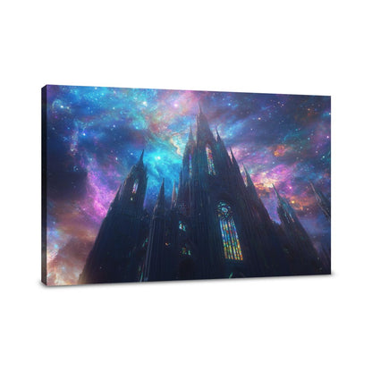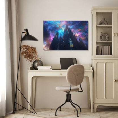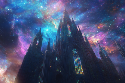 This image captures the awe-inspiring beauty of Neo-Gothic cathedrals floating amidst the stars, with their stained glass windows reflecting cosmic light. The rich interplay of colours—deep blues, purples, and shimmering golds—evokes a sense of peace and wonder. Perfect as wall art for both home and office, it adds a touch of the sublime, enhancing any space with its celestial elegance and inviting viewers to lose themselves in its otherworldly charm.