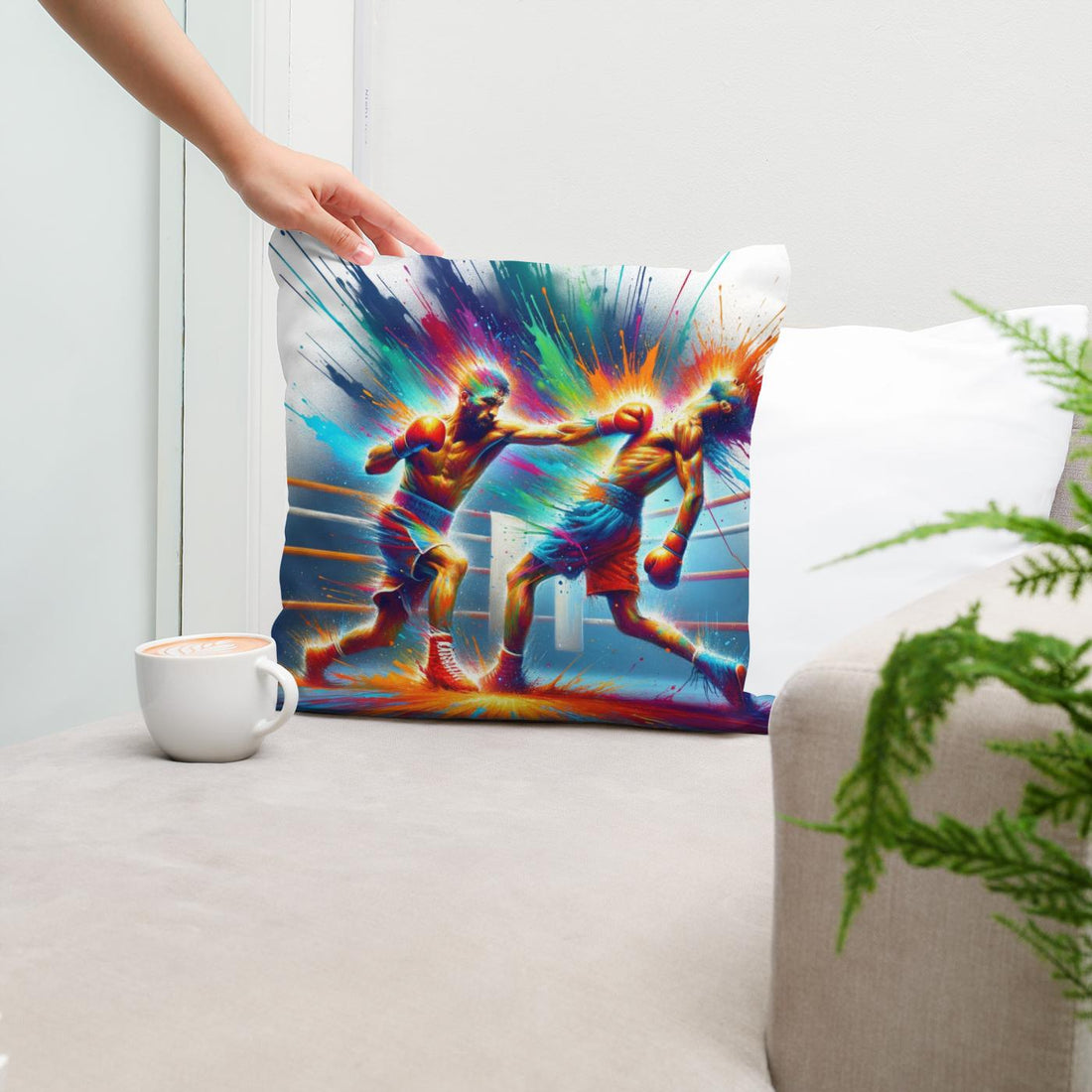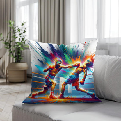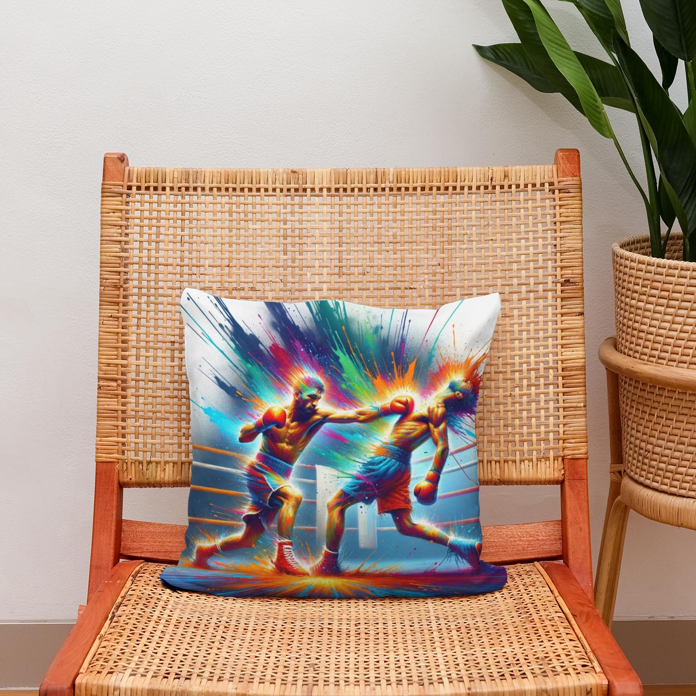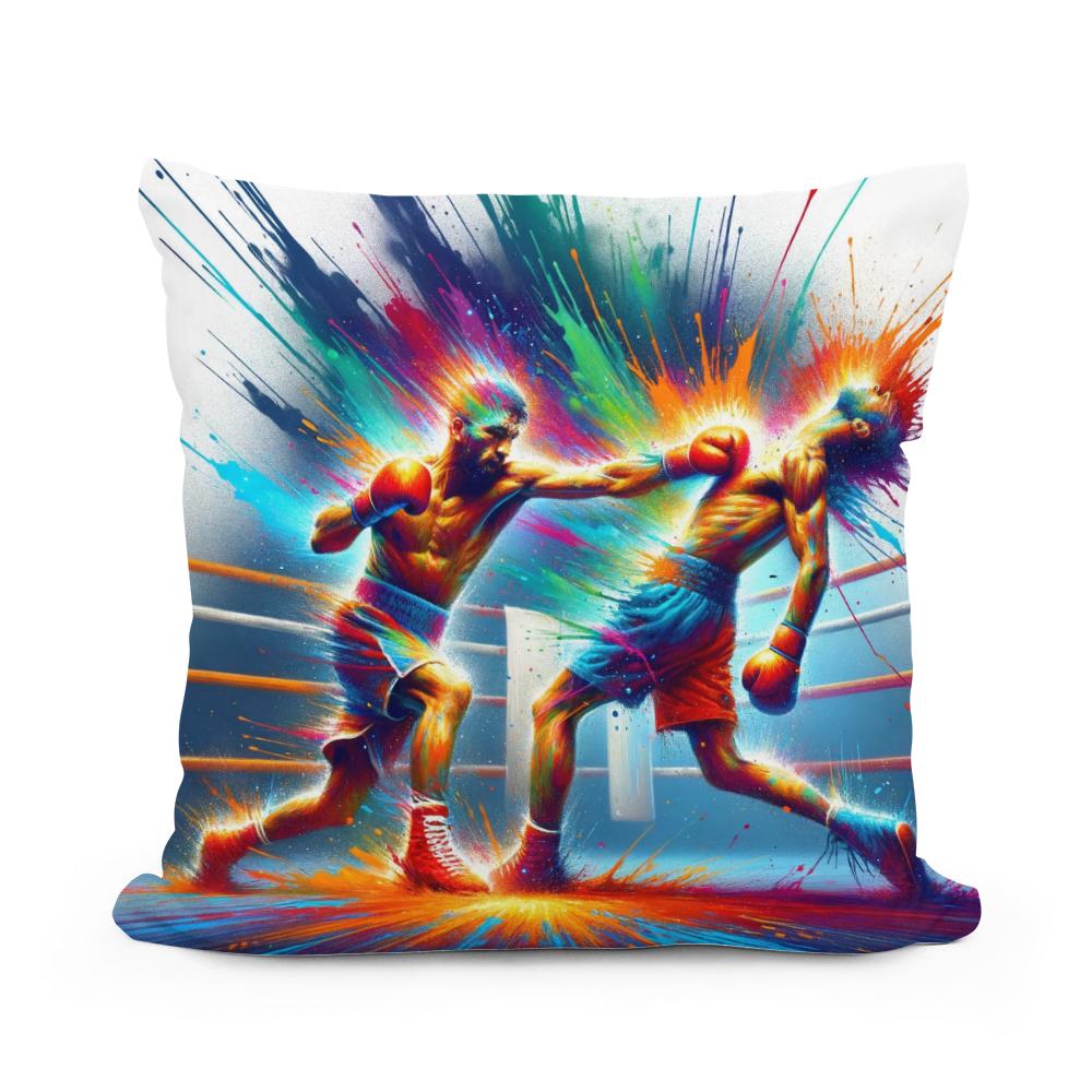 This vivid cotton cushion features an electric depiction of two boxers in a dynamic clash, surrounded by a vibrant burst of colours. The fighters, poised with intensity, are rendered in a vivid, almost neon palette that captures the explosive energy and movement of the boxing ring. This striking design is not only an eye-catching addition to any room but also a celebration of athletic prowess and artistic flair. Perfect for adding a splash of colour and drama to your decor.