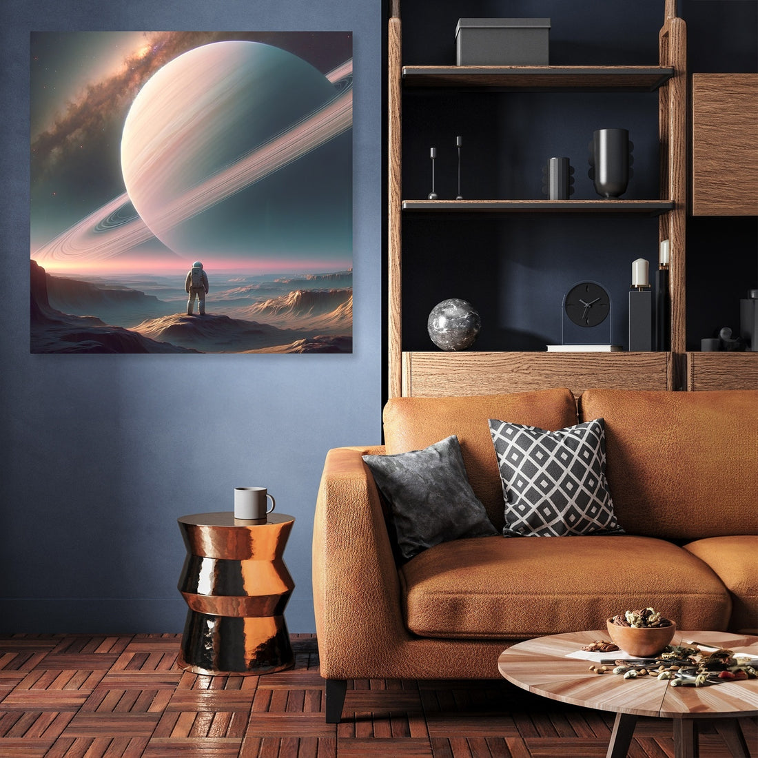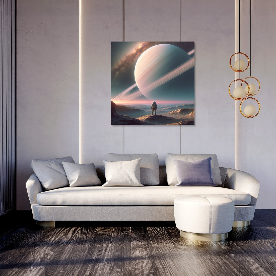 Elevate your space with the captivating ‘Cosmic Voyager Canvas’. This artwork depicts a lone cosmonaut standing on the edge of a vast crater on an alien planet, gazing up at a giant ringed planet. The cosmonaut's suit reflects the pastel hues of the swirling nebula above, while the rocky landscape is bathed in the gentle light of a distant star. The scene evokes a sense of scale, mystery, and serene beauty.