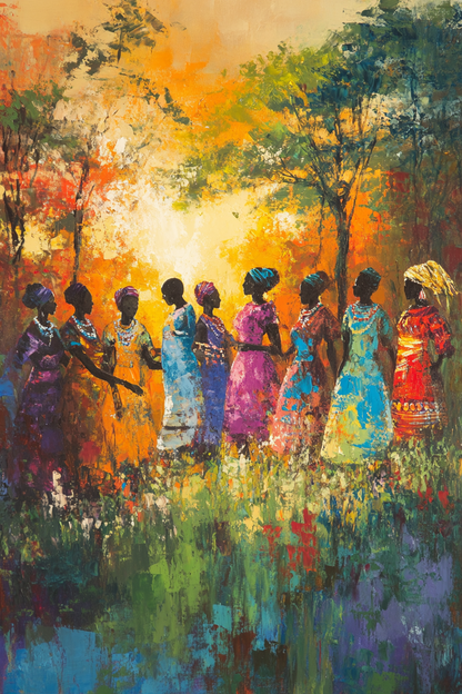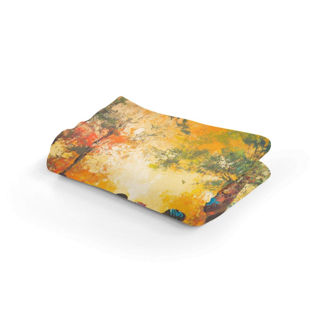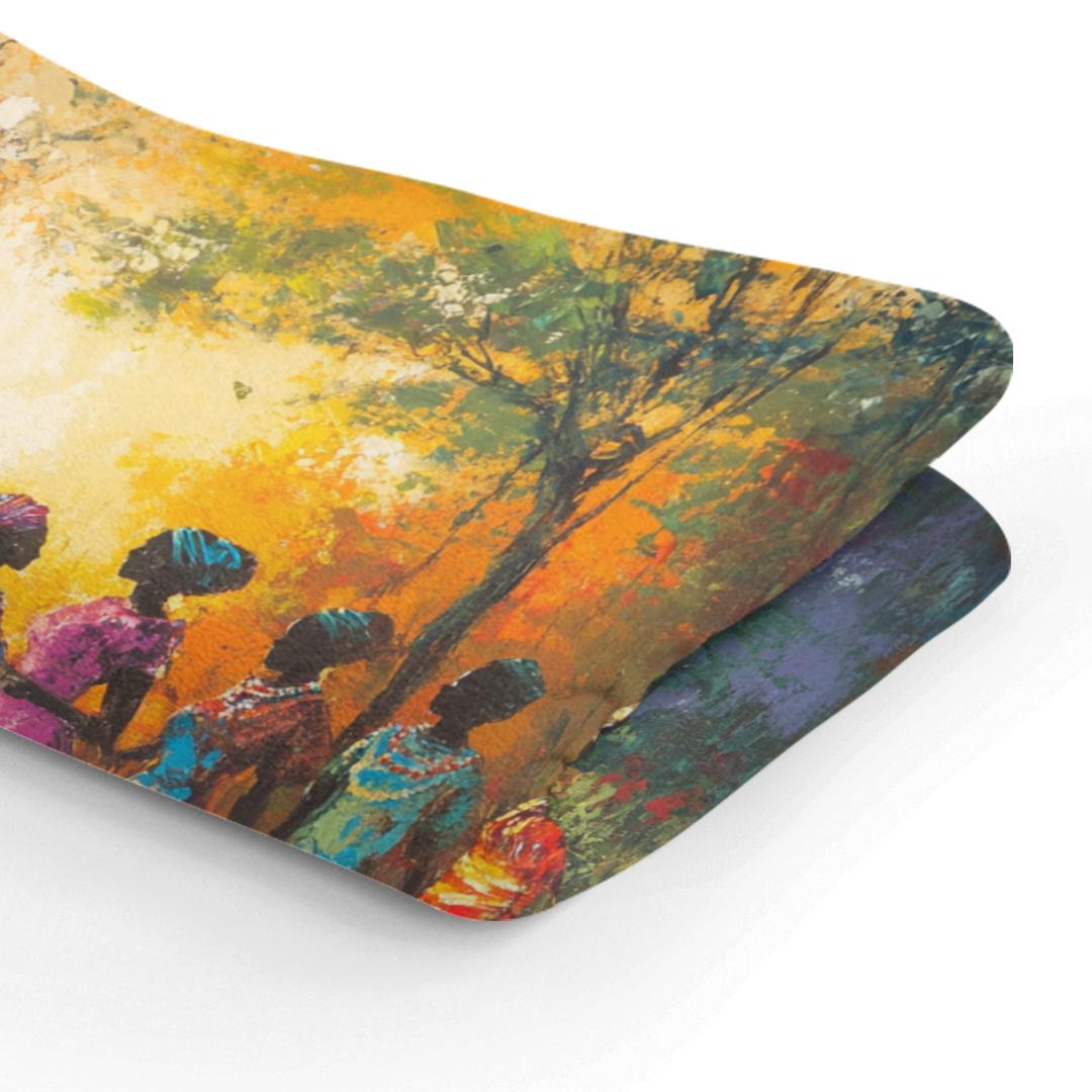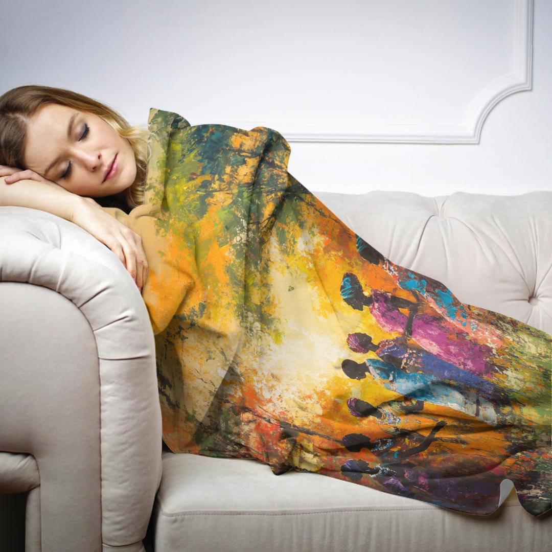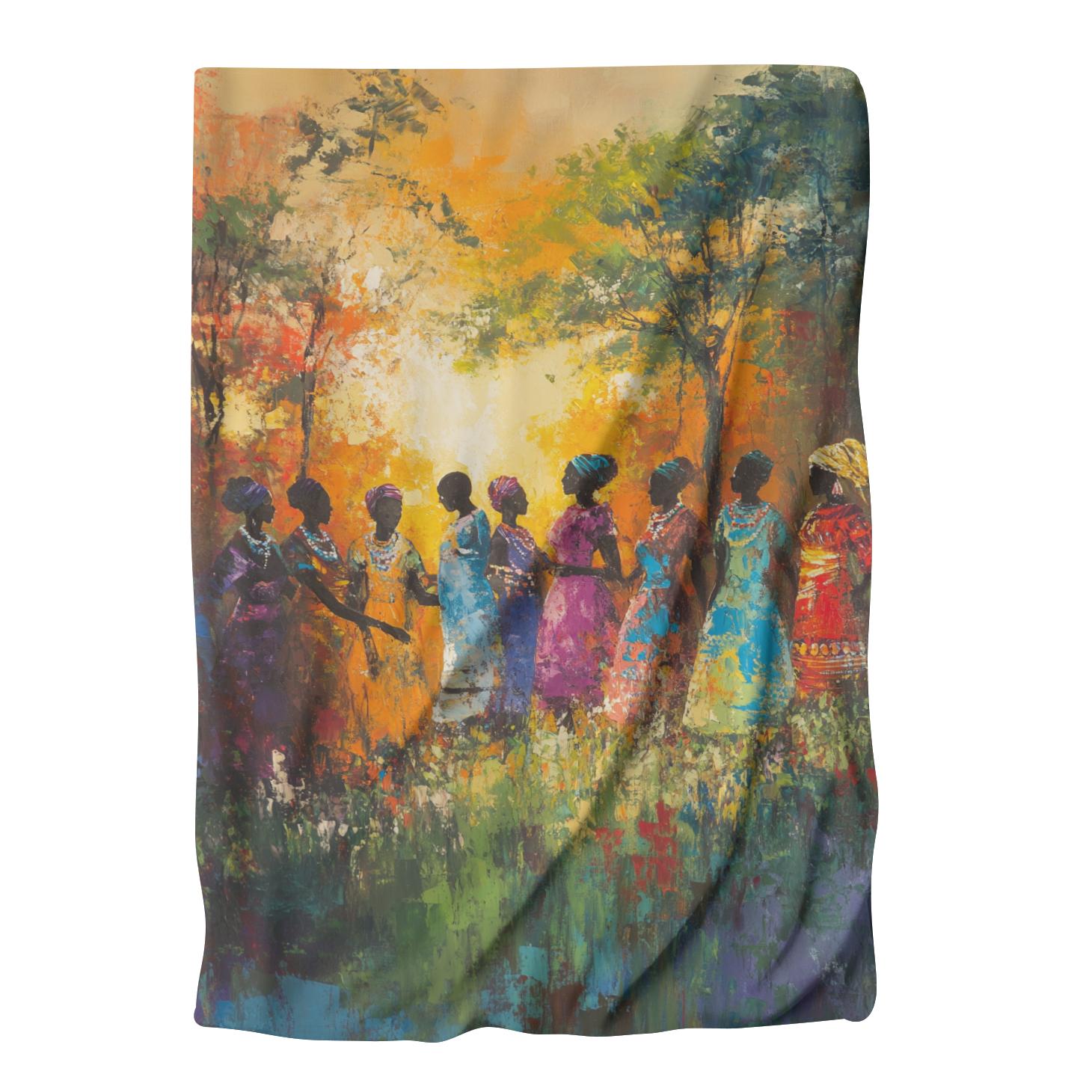 Wrap yourself in warmth and artistry with this stunning blanket, featuring a picturesque scene of women clad in vibrant, traditional dresses, set against a vivid, impressionistic background. The lush, abstract landscape envelops these graceful figures, creating a dynamic and joyful explosion of colours. This blanket effortlessly marries comfort with the unique charm of artisanal elegance, perfect for adding a touch of cultural sophistication to any home.