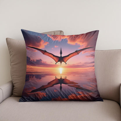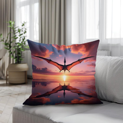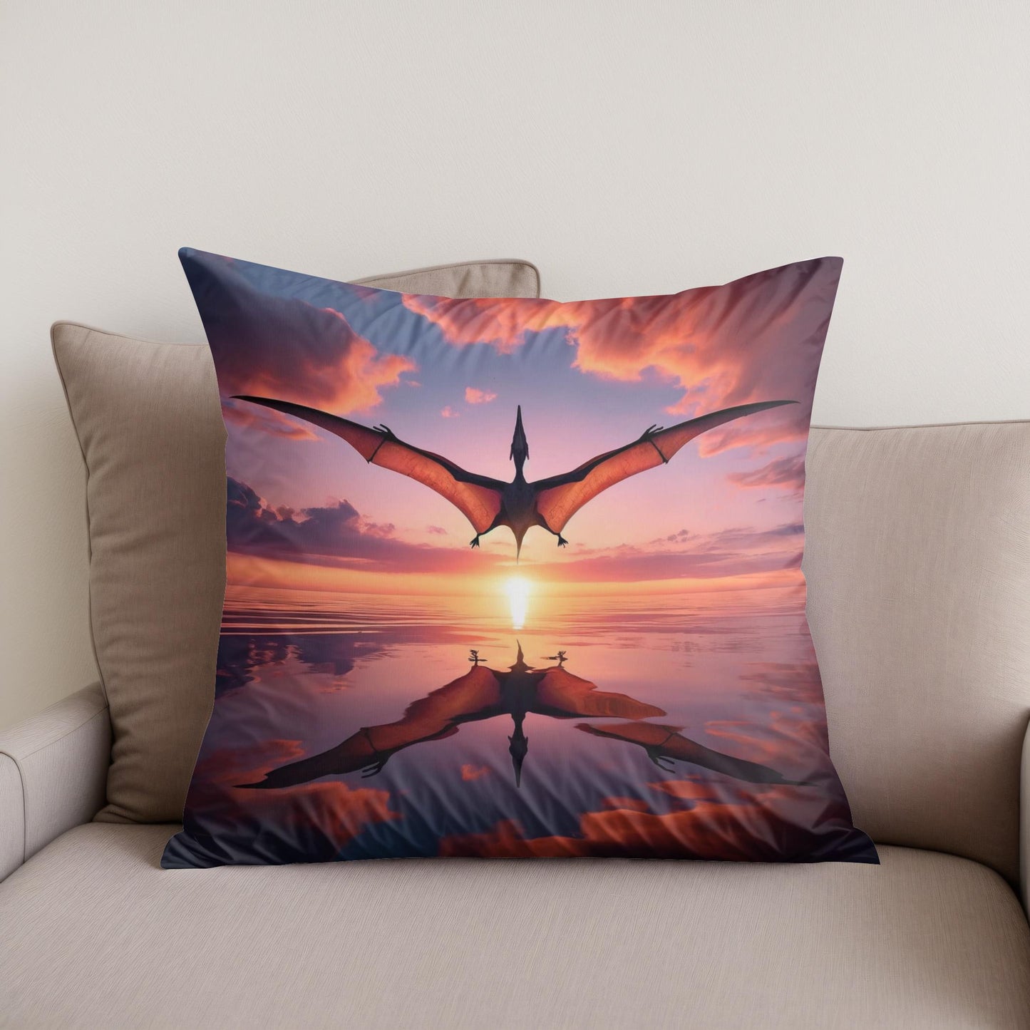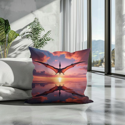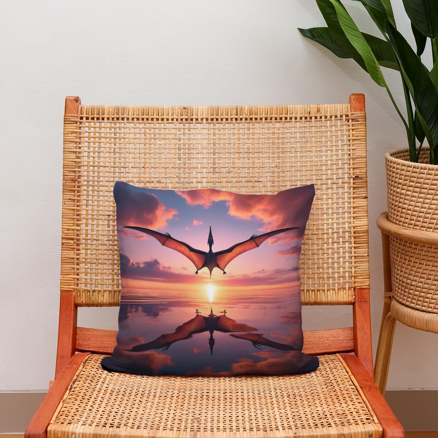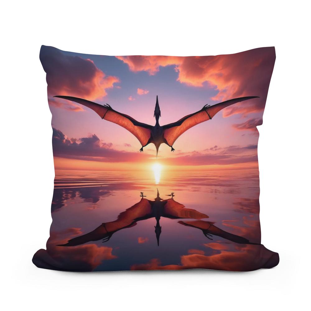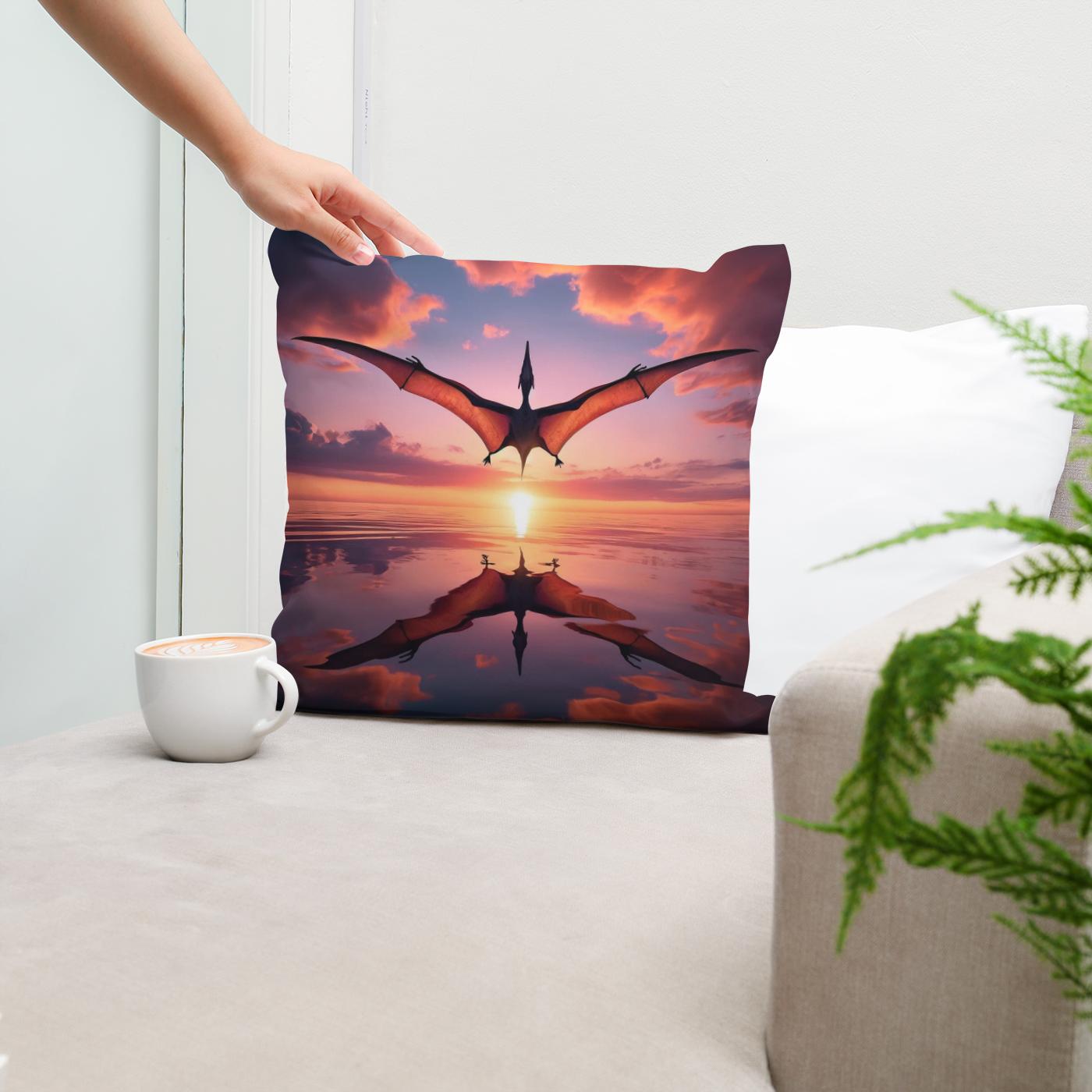 Elevate your decor with this striking cotton pillow, featuring a majestic Pterosaur silhouetted against a breathtaking sunset. The vivid tableau of warm sky hues merges seamlessly with a tranquil sea, mirrored to perfection below. This pillow captures a moment of prehistoric elegance, ideal for adding a touch of adventure and grace to any room.