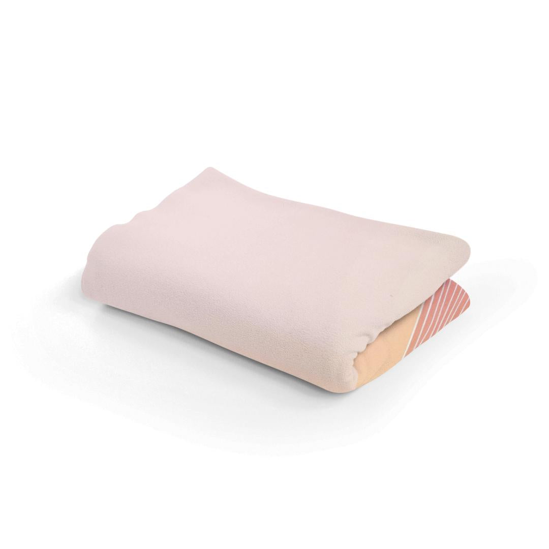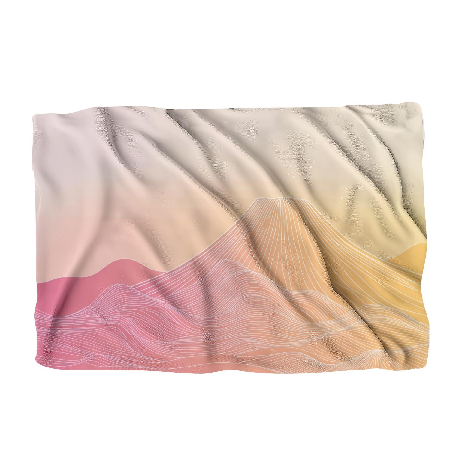 Wrap yourself in the serene beauty of a stylised mountain landscape. This blanket features a refreshing gradient of peach and pink hues, illuminated by a soft orange sky. Graceful lines trace the contours of rolling hills and majestic peaks, creating a tranquil and inviting tableau. Perfect for adding a touch of calm sophistication to any room.
