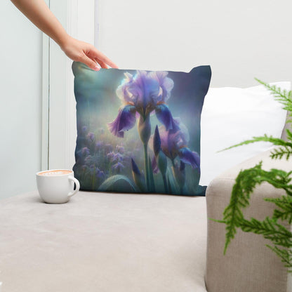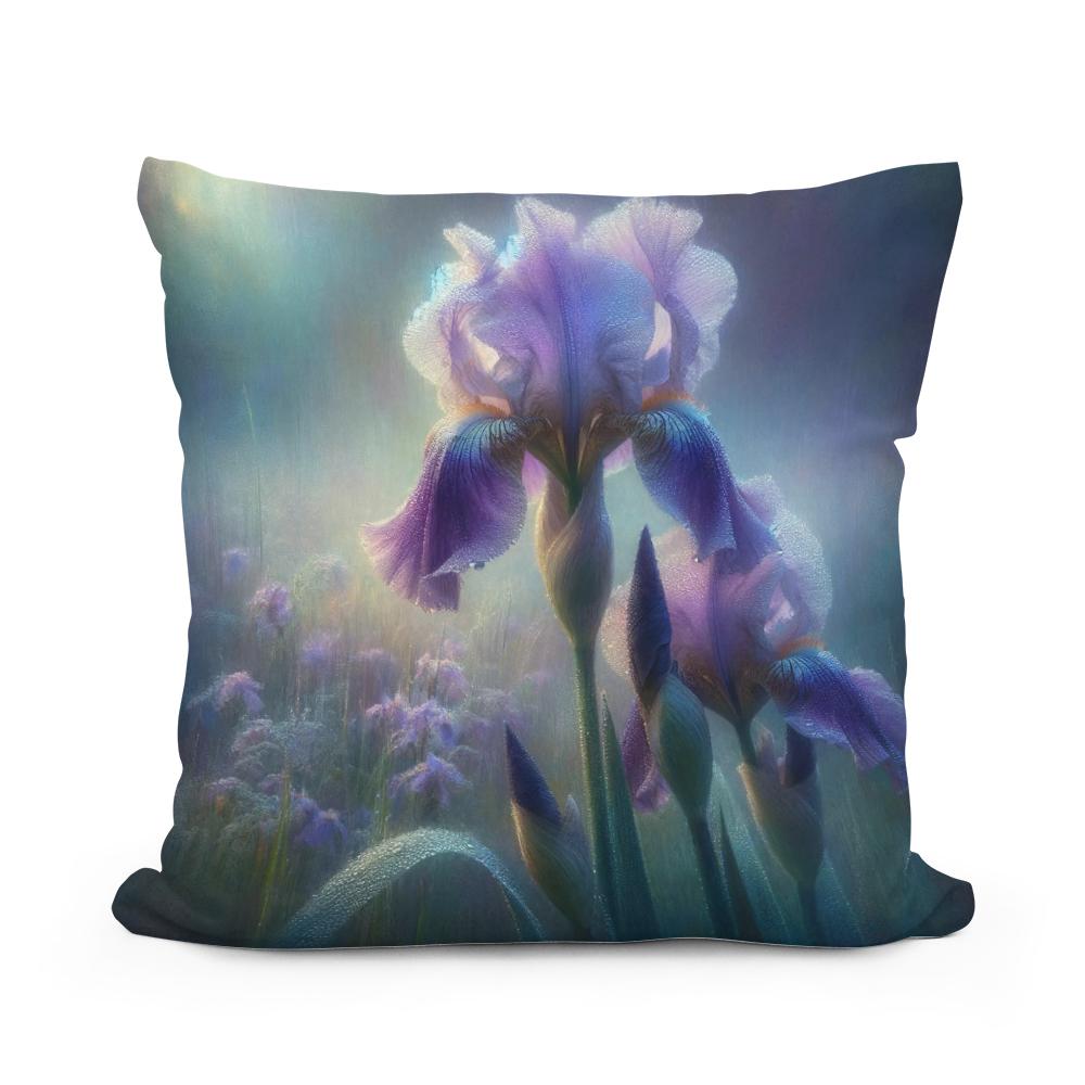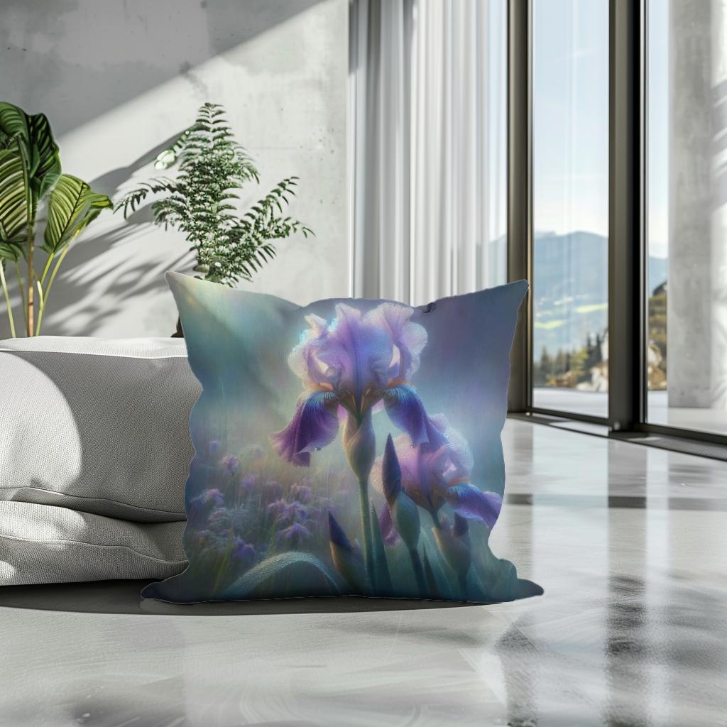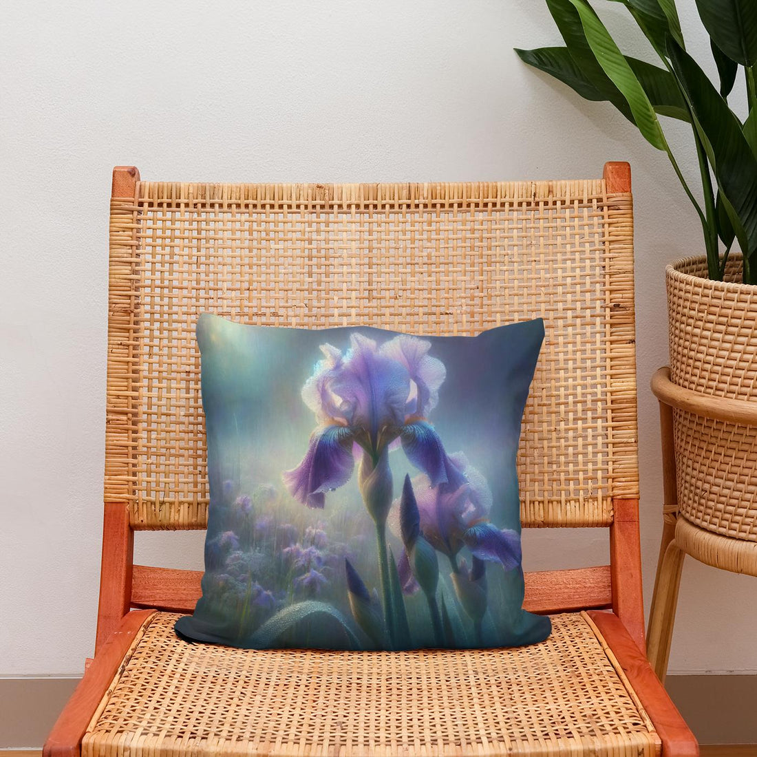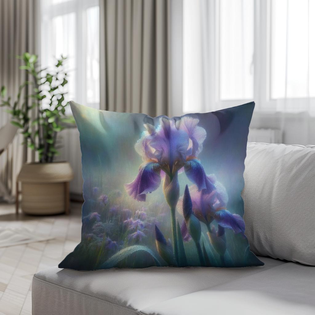 Adorn your home with the enchanting scene of this luxurious cotton cushion, showcasing an exquisite iris basking in an ethereal morning light. The delicate dewdrops and soft lavender hues create a serene and uplifting atmosphere, perfect for adding a touch of elegance and tranquility to any room. This stunning image captures the natural beauty of a misty garden, making it an ideal addition for those who cherish floral elegance and a peaceful ambience.