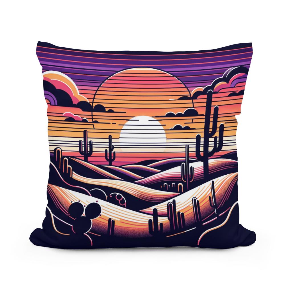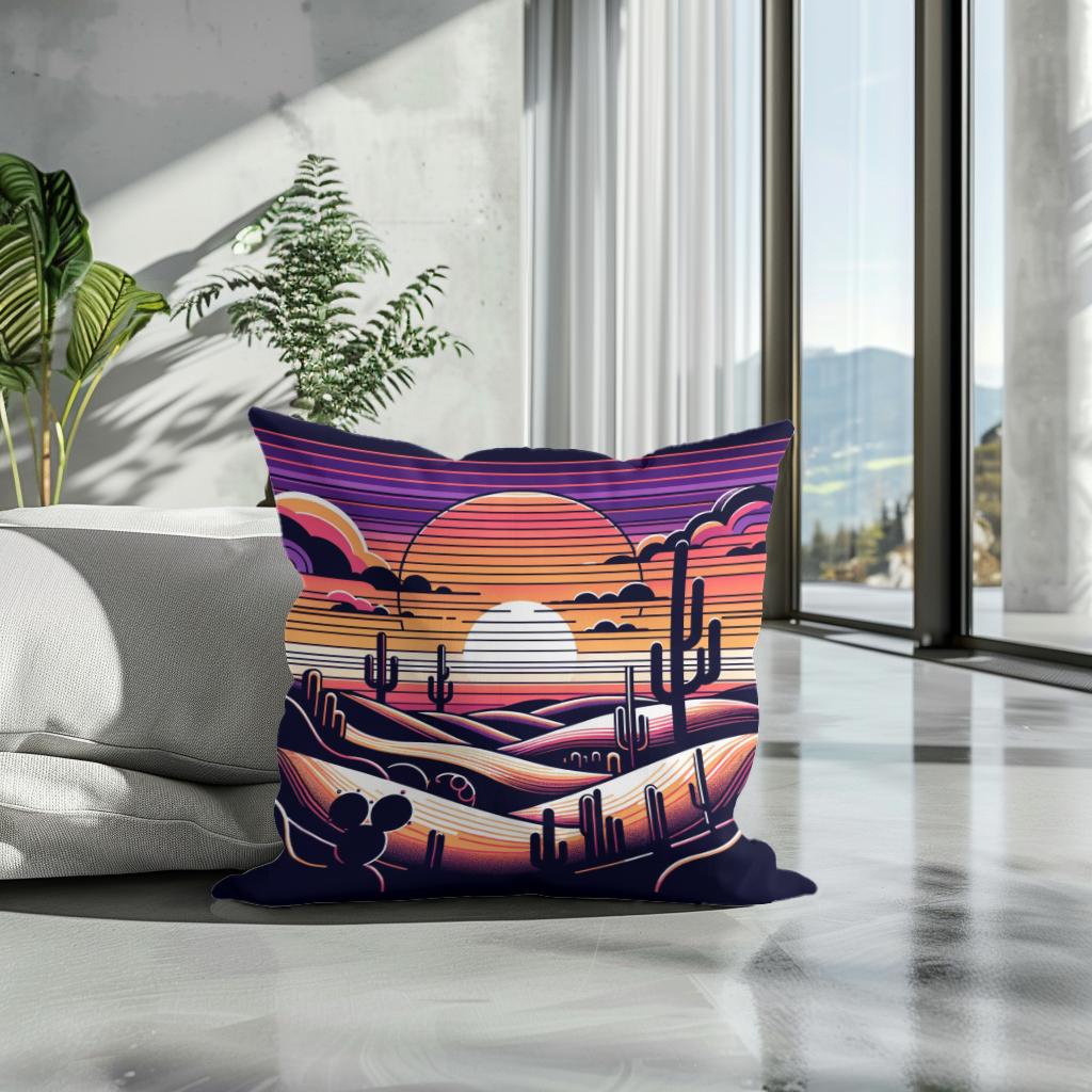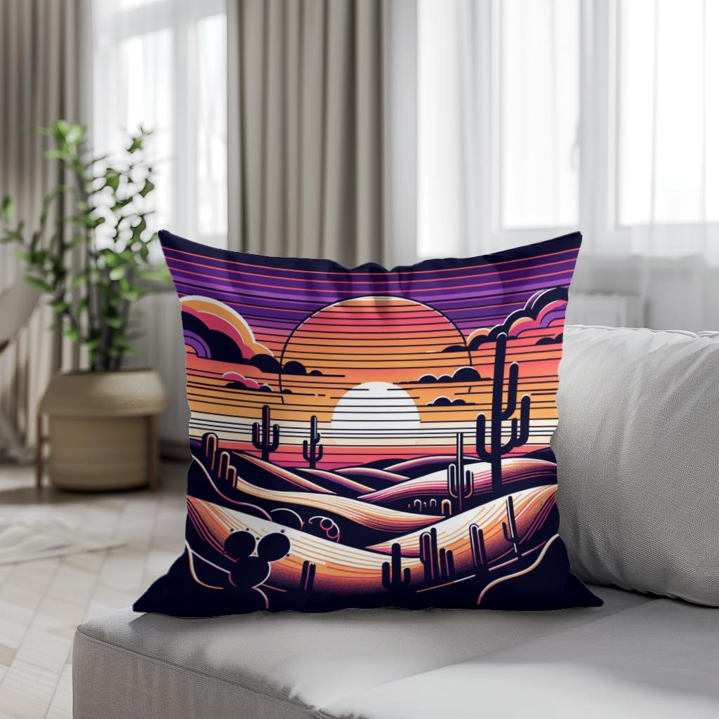 Adorn your living space with this vibrant, printed cotton cushion featuring a captivating desert scene. The illustration showcases a stylised sunset with layered hills and classic saguaro cacti silhouetted against a rich, multicoloured sky. This striking design, infused with purple, orange, and pink hues, creates a serene yet dramatic ambiance, perfect for anyone looking to add a touch of artistic flair and warmth to their decor.