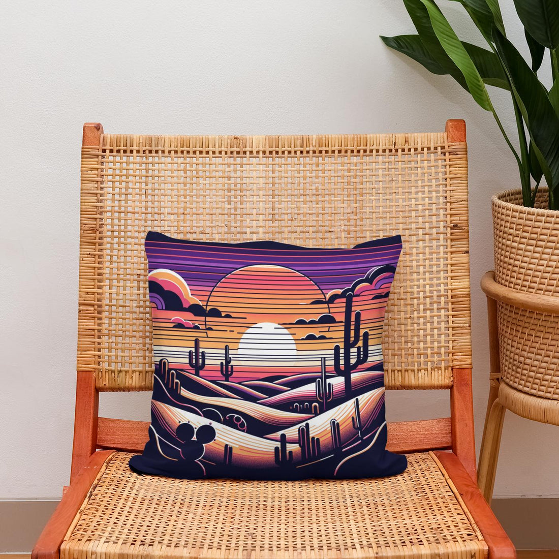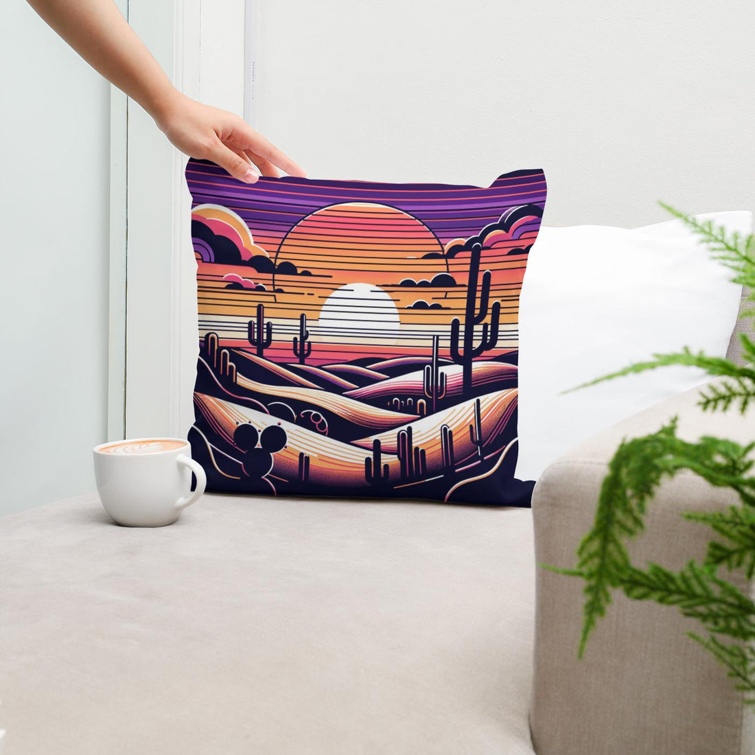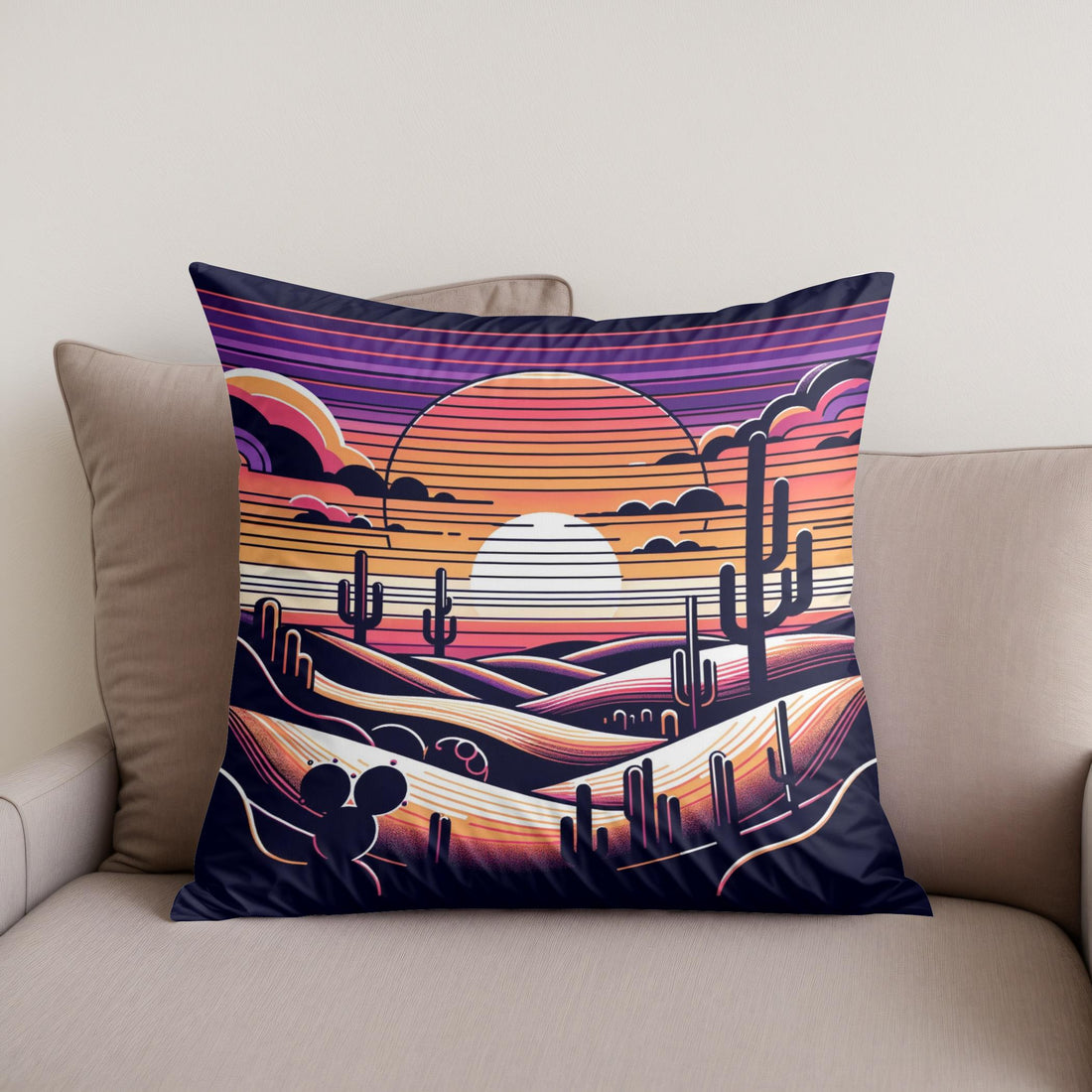 Adorn your living space with this vibrant, printed cotton cushion featuring a captivating desert scene. The illustration showcases a stylised sunset with layered hills and classic saguaro cacti silhouetted against a rich, multicoloured sky. This striking design, infused with purple, orange, and pink hues, creates a serene yet dramatic ambiance, perfect for anyone looking to add a touch of artistic flair and warmth to their decor.
