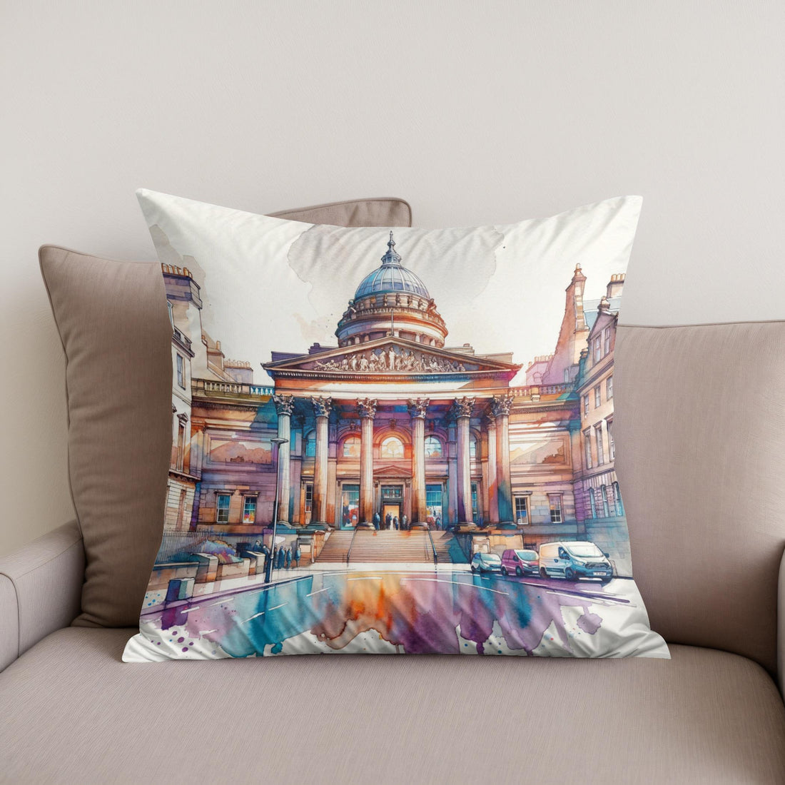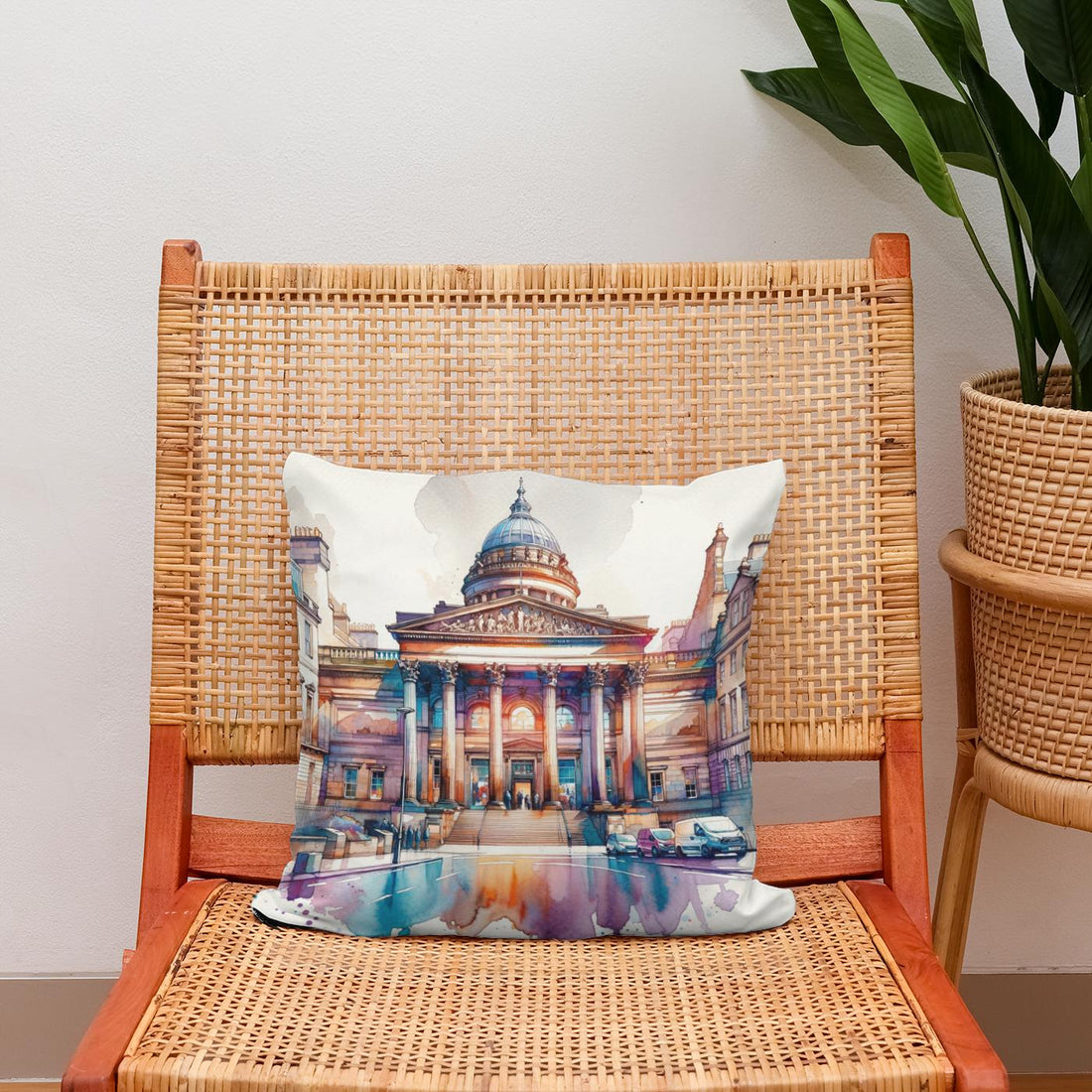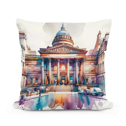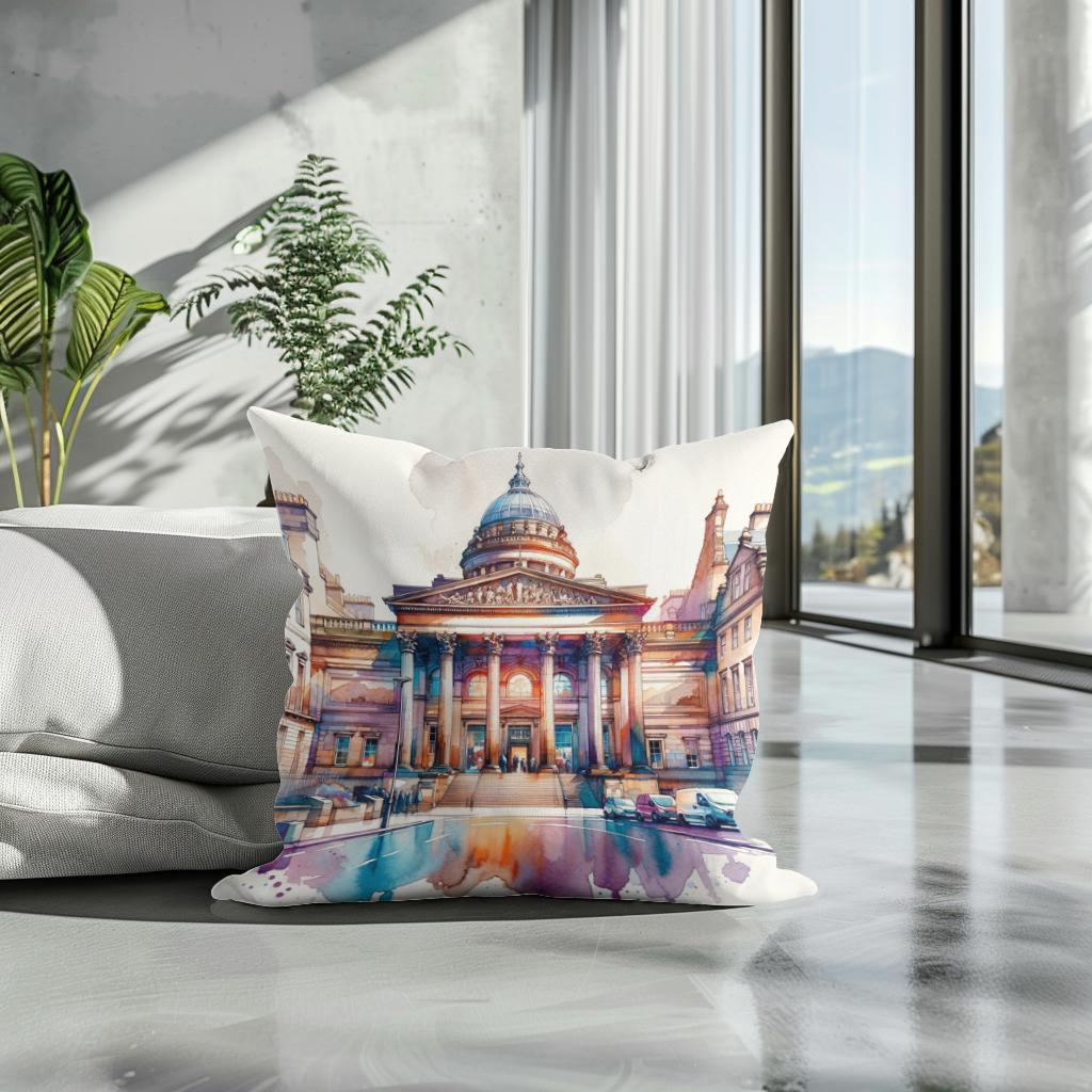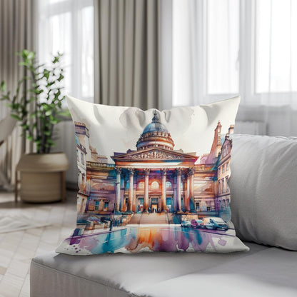 Adorn your space with this stunning cotton cushion featuring a vibrant watercolour depiction of a majestic neoclassical building, crowned with a magnificent dome. The artwork captures a dynamic street scene, interspersed with parked cars and passersby, rendered in a fusion of vivid hues that reflect the building’s grandeur and urban vibrancy. This cushion is a perfect blend of art and comfort, ideal for adding a touch of elegance and colour to any room.