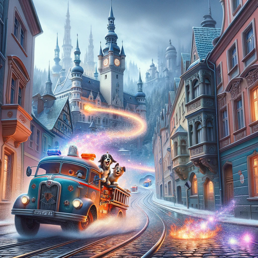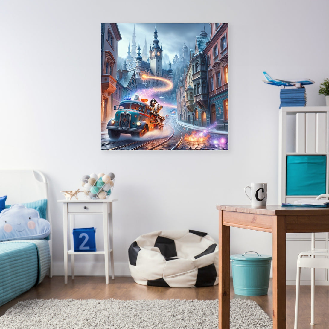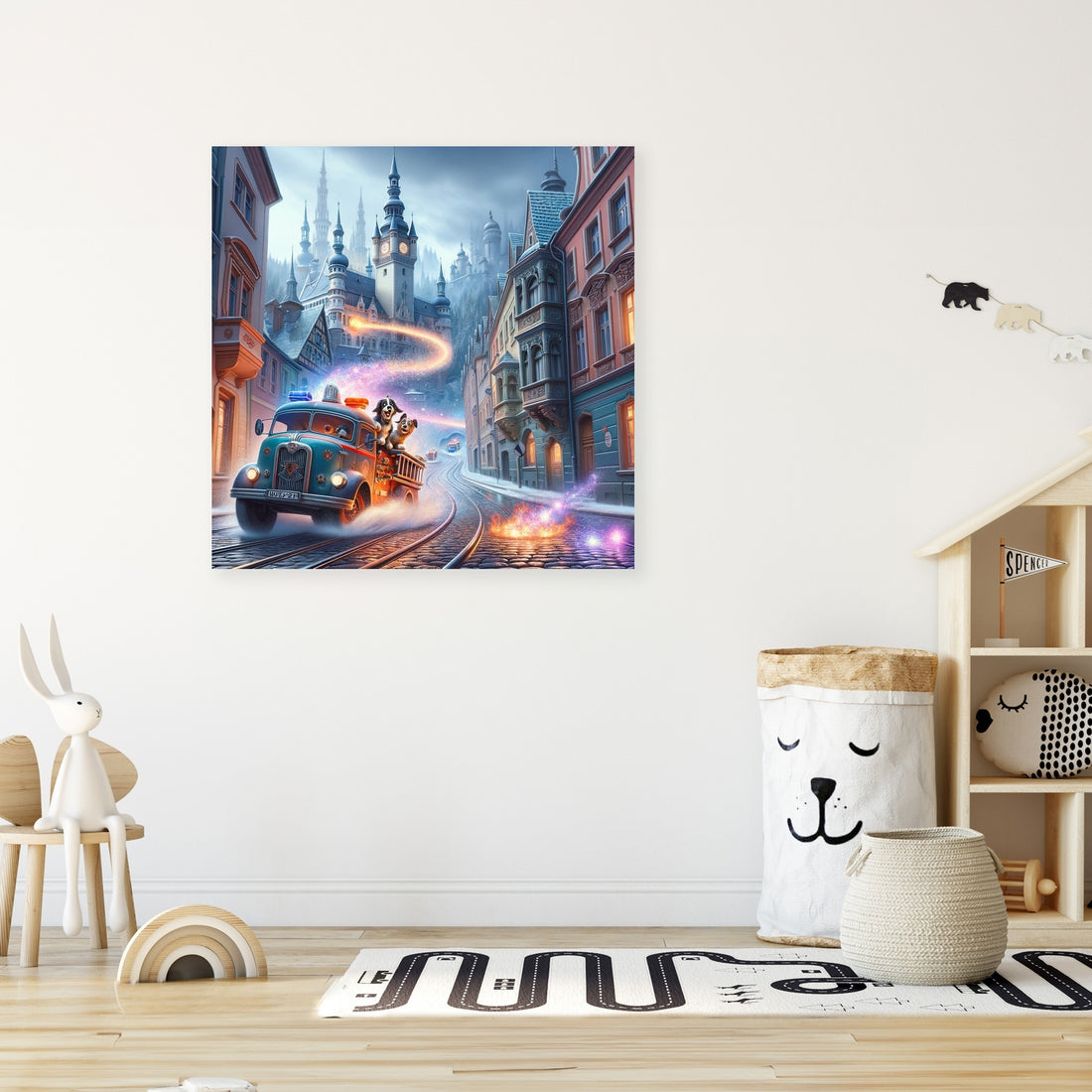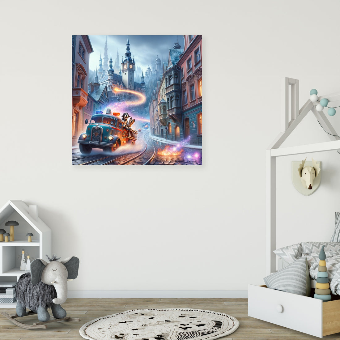 "Enchanted Blaze Chase Canvas" vividly captures the thrill of two heroic dogs in a fire truck, weaving through a fairy-tale city's cobblestone streets towards a magical fire at the town hall. Adorned with enchantments, their truck leaves a sparkling trail, illuminating the gothic whimsy of the urban landscape. Set against dynamic colors, the cool pastels of the city contrast with the vibrant magic of their mission, creating a captivating scene of urgency and enchantment. Perfect for inspiring bravery and imagination, this artwork is a fantastical addition to any child's room.