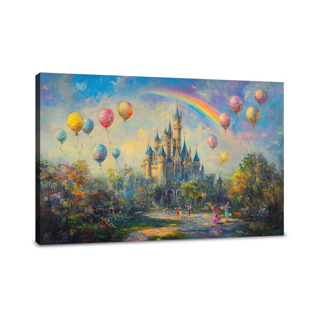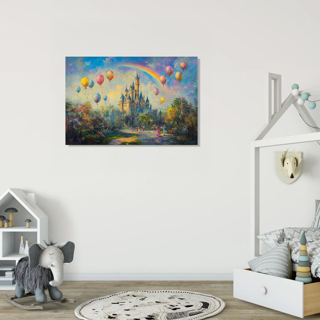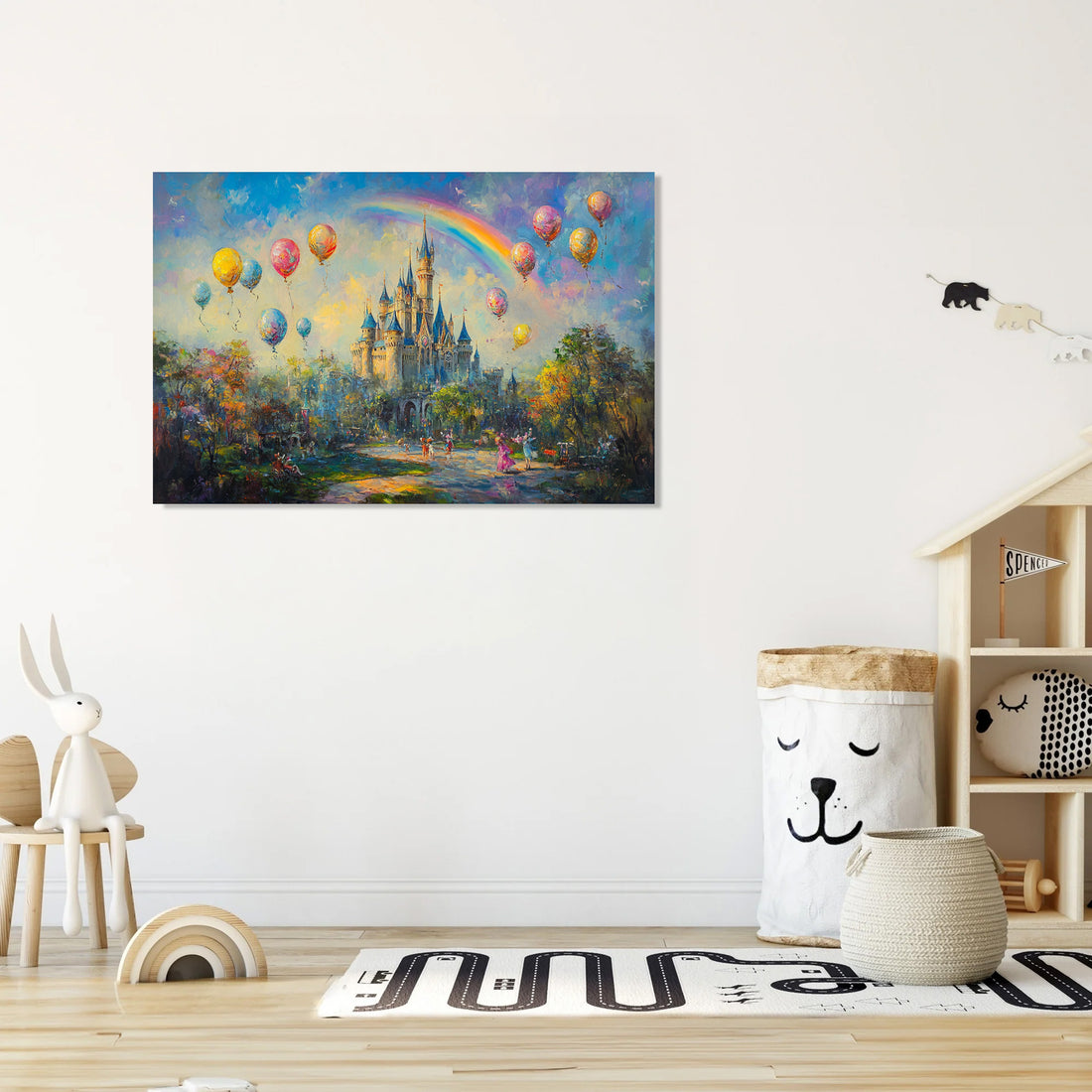 This captivating artwork, with its vivid depiction of a magical castle and a luminous rainbow arching across the sky, brings a touch of enchantment to a child's room. The lively balloons and playful, enchanted characters add a whimsical flair, while the Impressionist brushstrokes convey energy and movement. This delightful piece of wall art transforms any space into a realm of imagination and adventure, making it an ideal choice to inspire dreams and creativity in young minds.