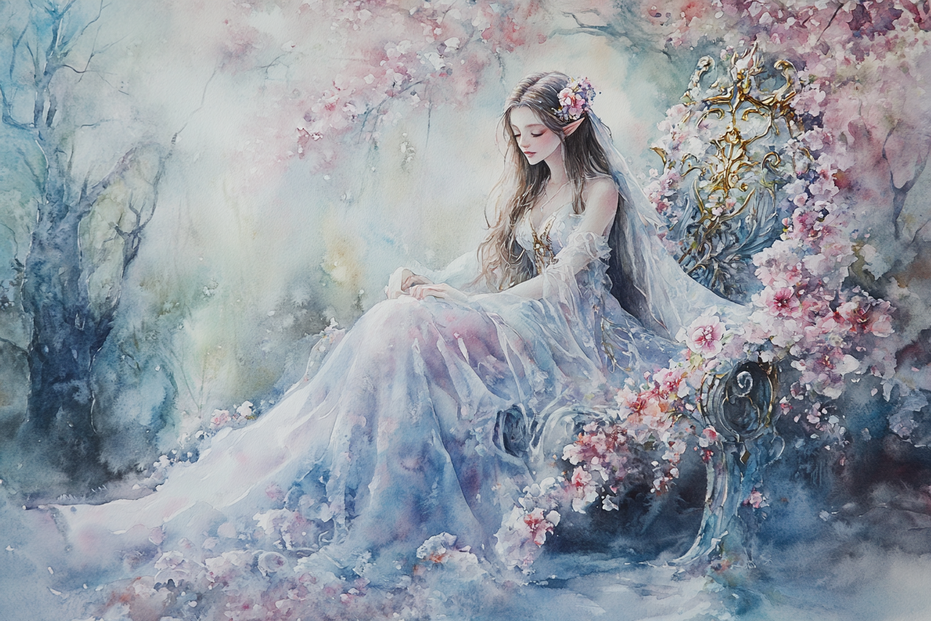 This exquisite watercolour captures the ethereal majesty of an elven queen amidst nature's splendour, offering a serene yet powerful presence. Perfect for adding a touch of romantic fantasy to any home or office, this artwork’s delicate hues and intricate details evoke a timeless elegance and bring a sense of wonder and inspiration to your space.