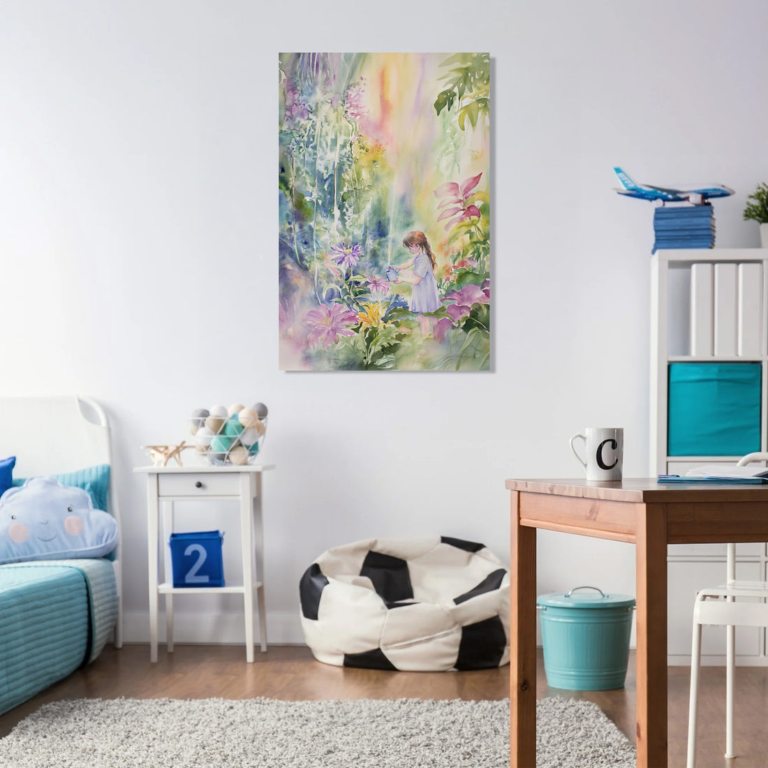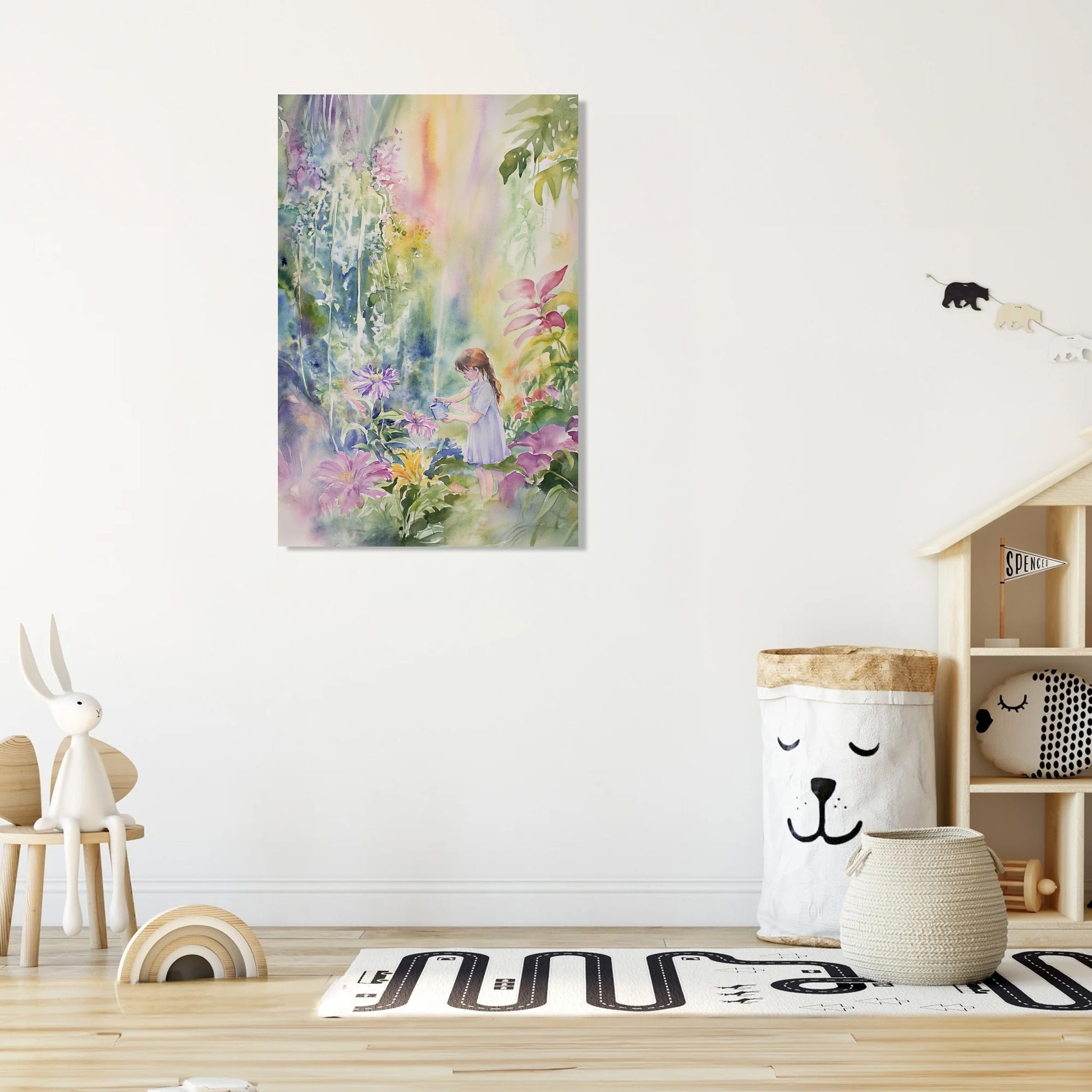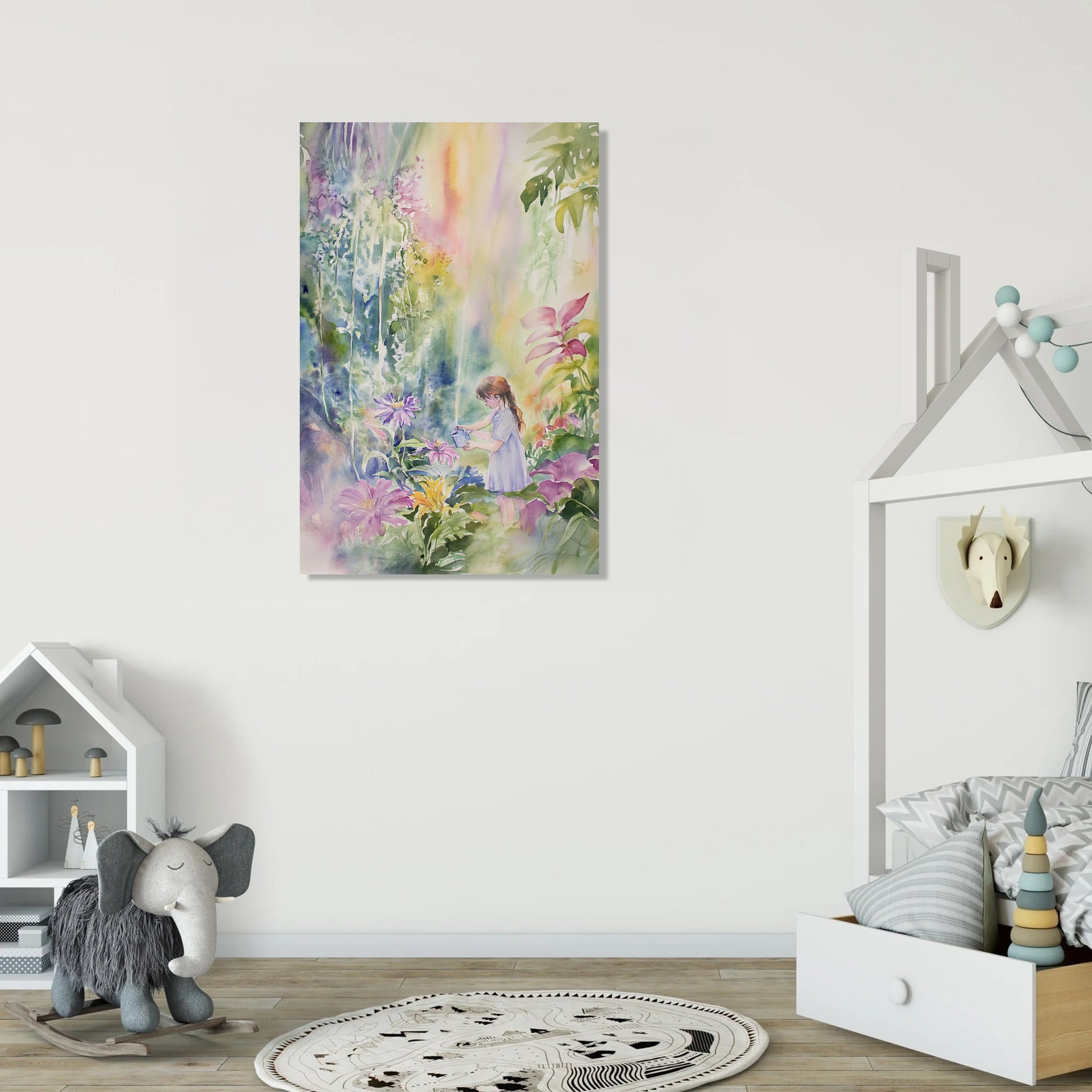 This delightful watercolour painting portrays a young girl watering flowers in a whimsical, enchanted garden. With its soft, translucent hues of pink, purple, and green, the artwork exudes a sense of tranquility and magic. The delicate interplay of light and shadow creates a dreamlike atmosphere, perfect for sparking a child's imagination. Ideal for a child's room, this enchanting canvas adds a touch of wonder and whimsy, making it a charming focal point that inspires creativity and curiosity.
