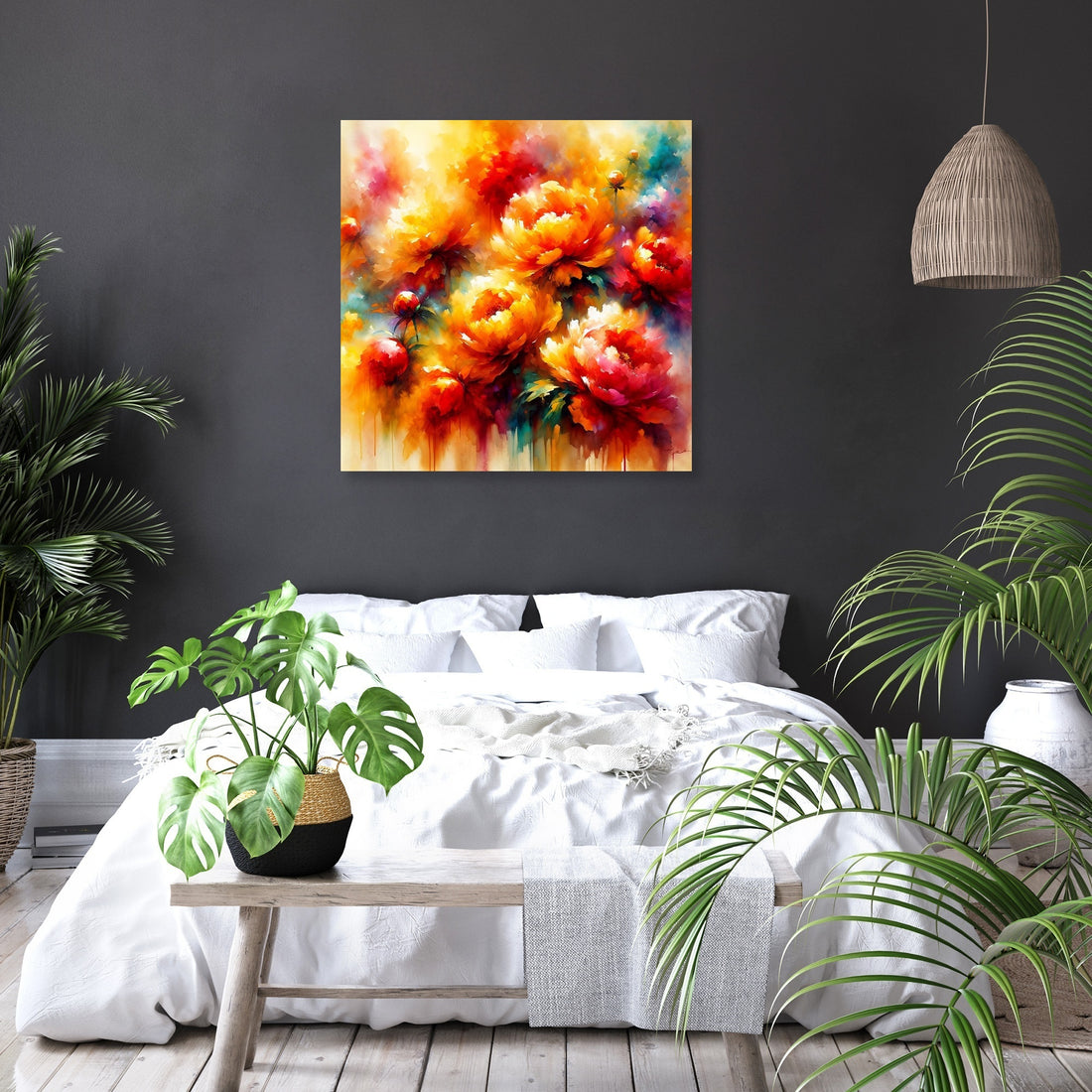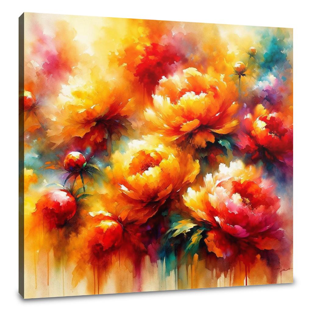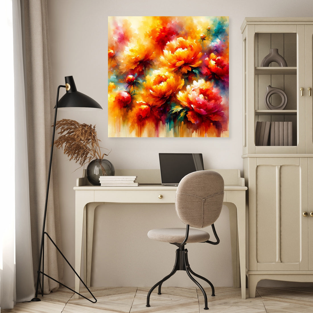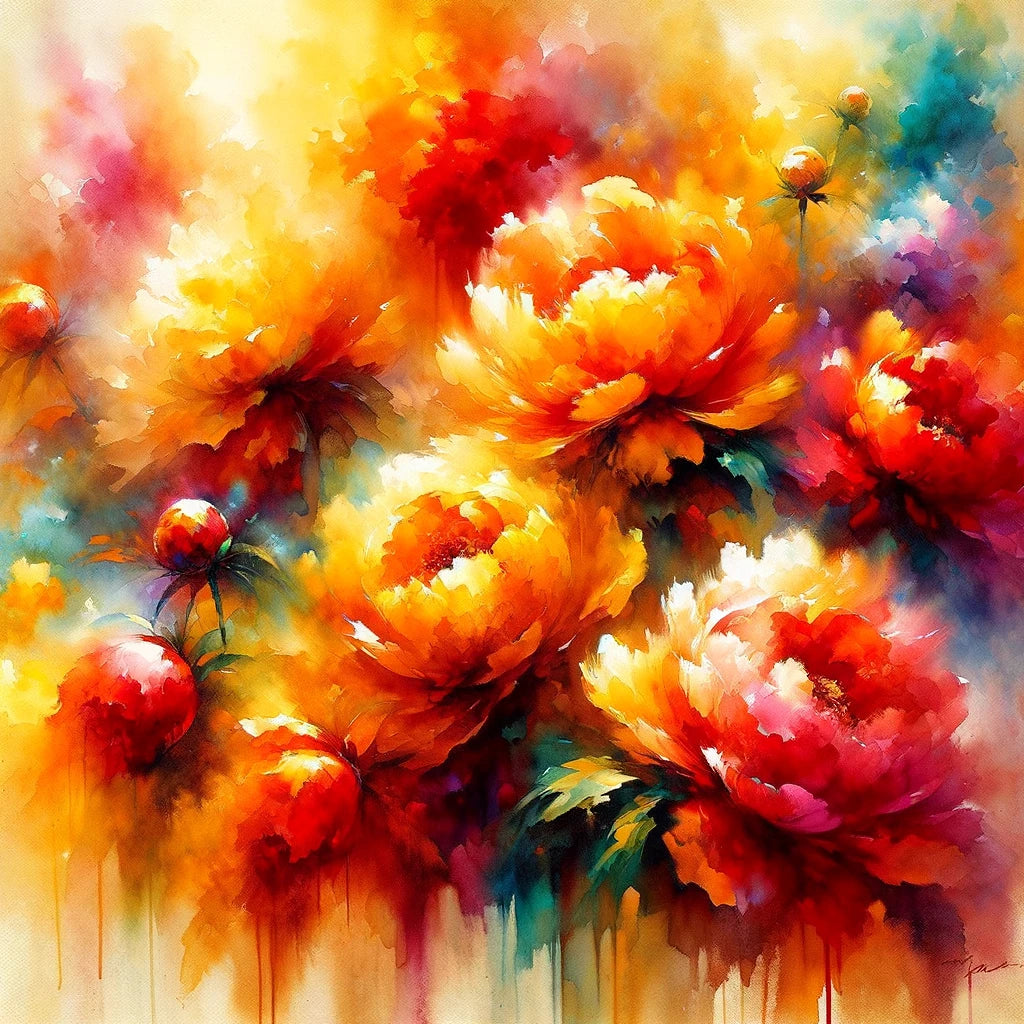 Ignite your senses with this post-impressionistic watercolor celebration of peonies. Rich oranges, fiery reds, and vibrant yellows meld together, creating a lively garden scene that radiates warmth and energy, perfect for bringing life to any space.