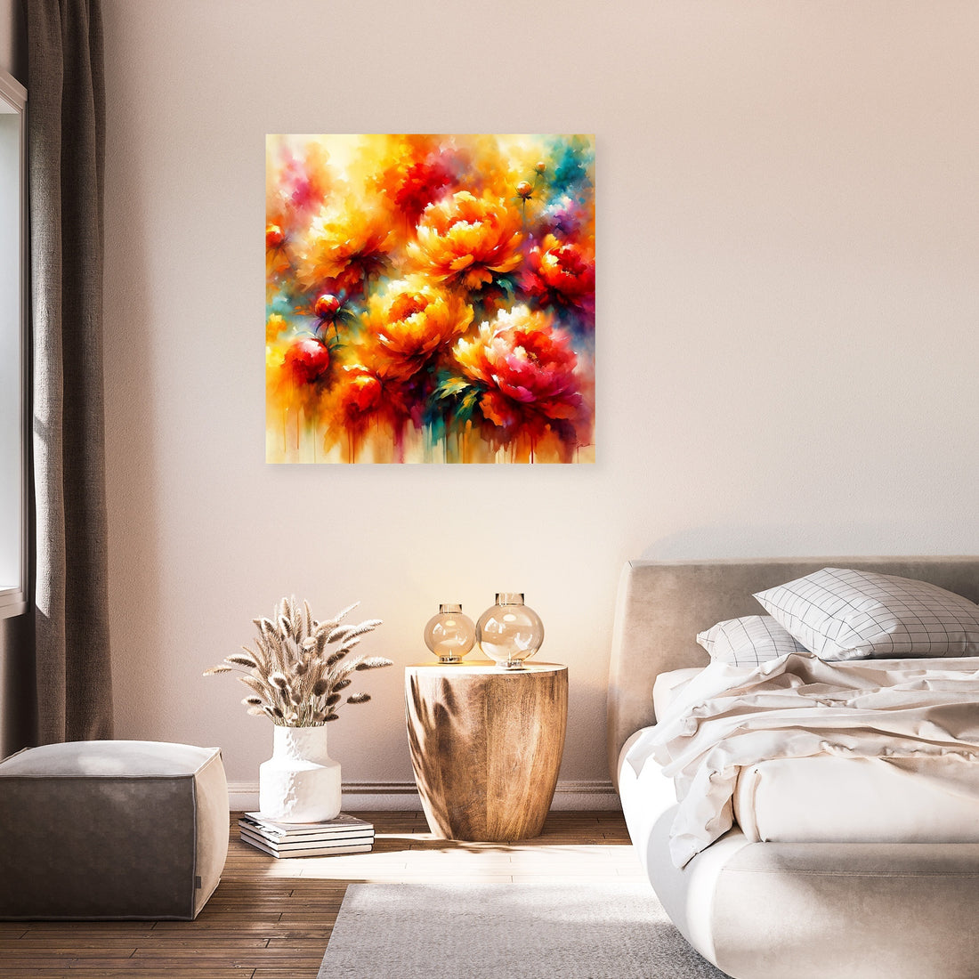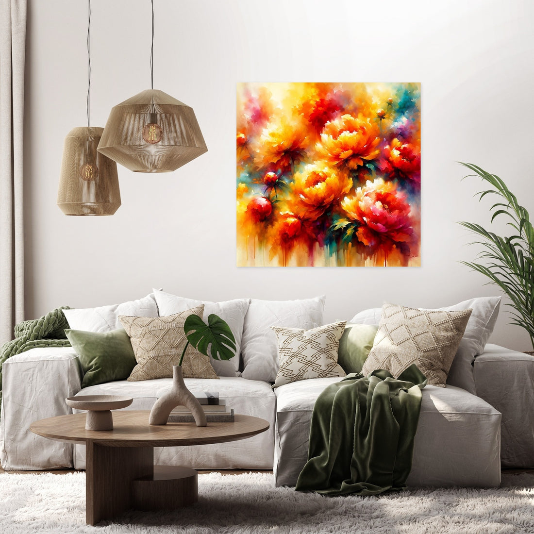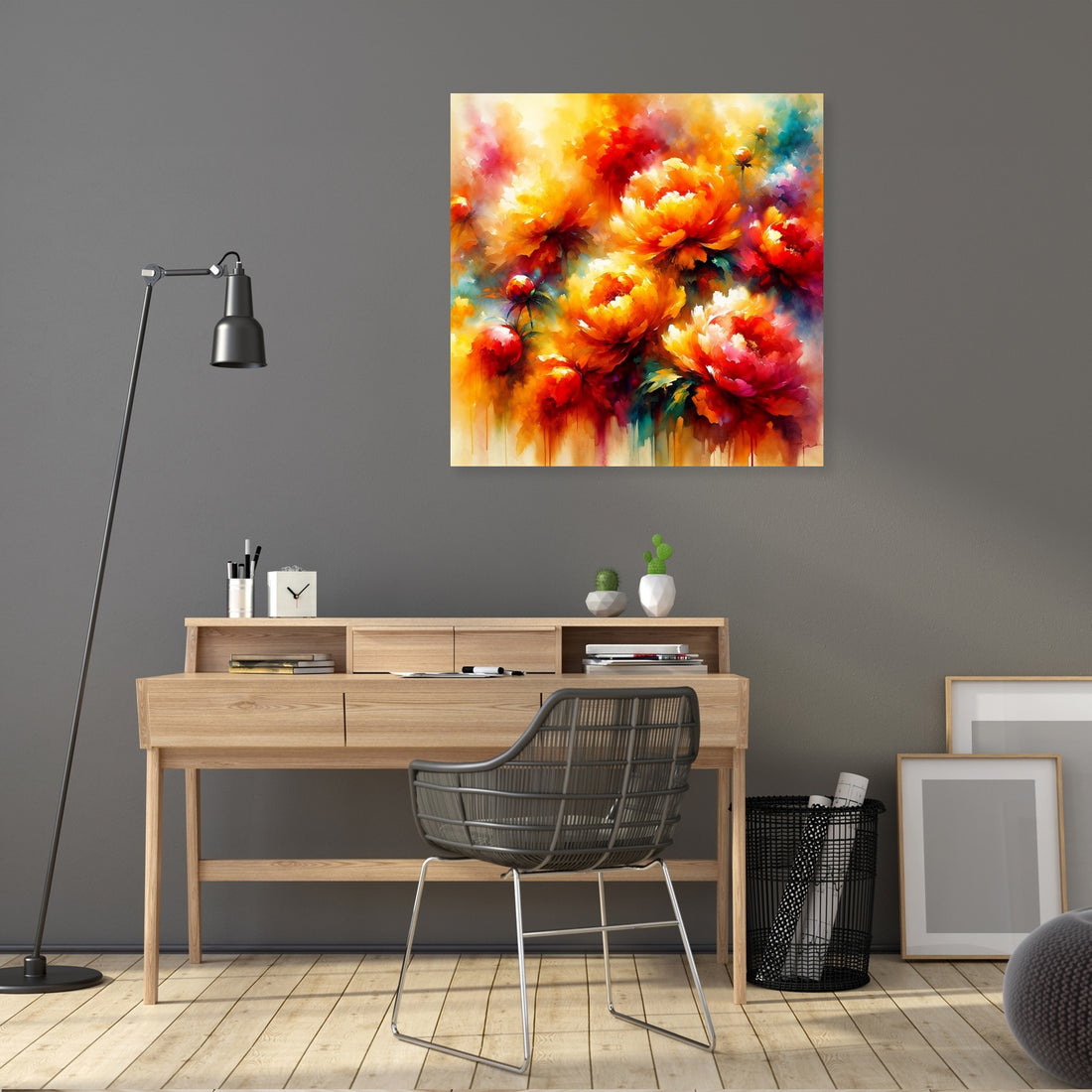 Ignite your senses with this post-impressionistic watercolor celebration of peonies. Rich oranges, fiery reds, and vibrant yellows meld together, creating a lively garden scene that radiates warmth and energy, perfect for bringing life to any space.