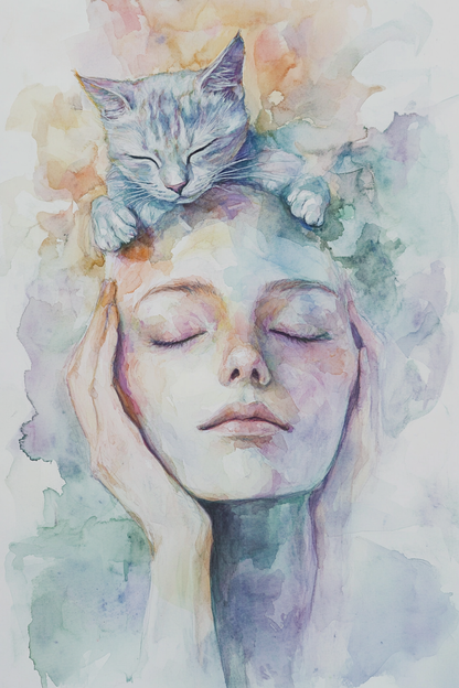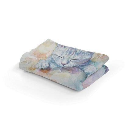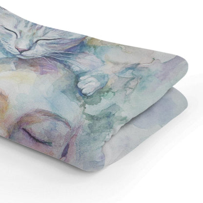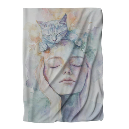 Envelope yourself in the serene embrace of our artistic blanket, featuring a tranquil watercolour portrayal of a woman in a peaceful slumber, cradled by a dozing kitten atop her head. Soft hues meld into a soothing pastel palette, lending a touch of elegance and calm to any room. This cosy blanket captures the essence of harmony and comfort, perfect for those moments of relaxation and reflection. Ideal for art lovers and anyone seeking a peaceful retreat in their own space.