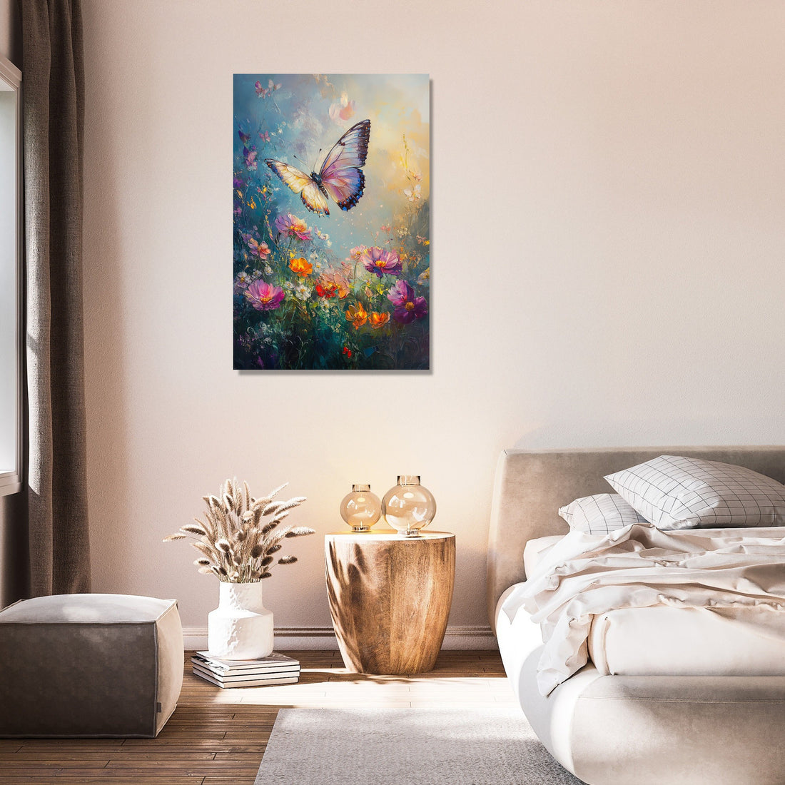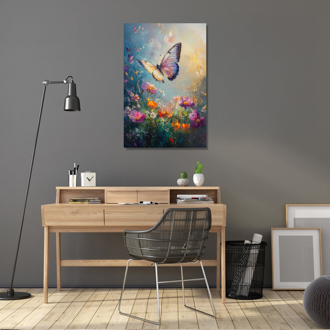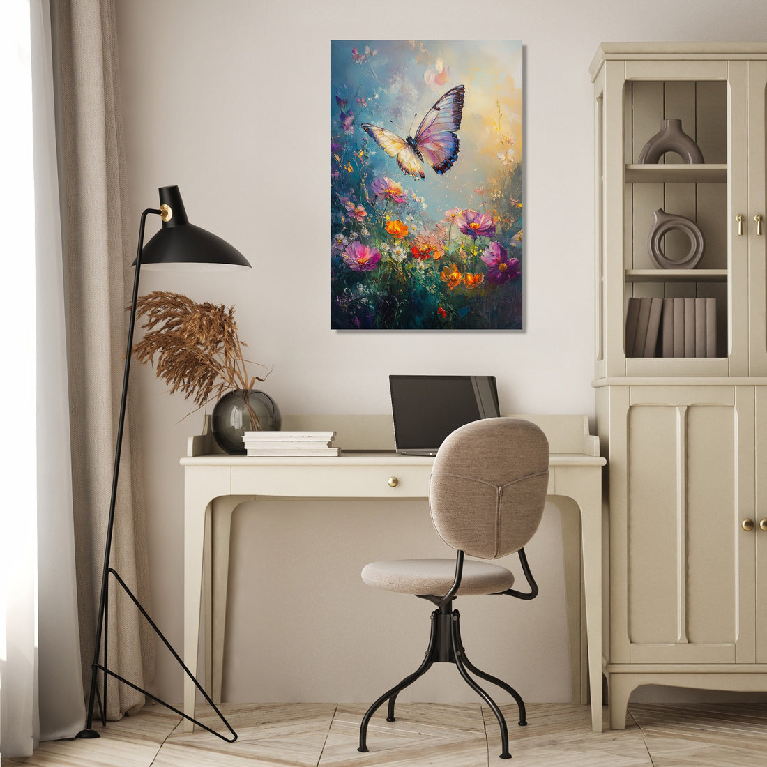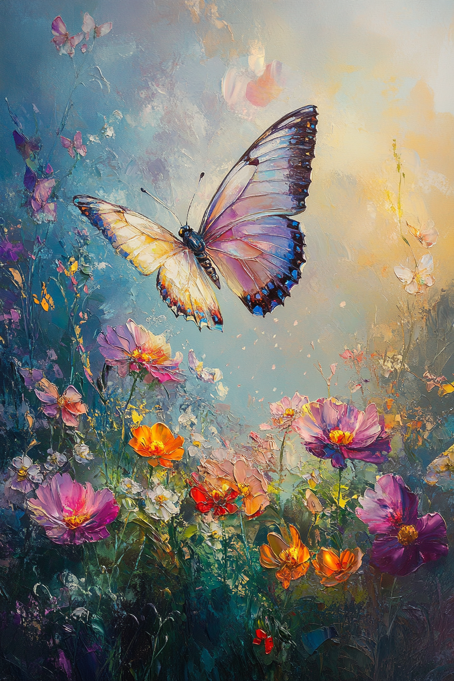 This captivating scene offers a serene blend of softness and vivid detail, making it a perfect focal point for any room. The sfumato technique imparts an ethereal quality, harmonising the butterfly's elegance with the blooming splendour, ideal for creating a peaceful ambient setting in both home and office décor.