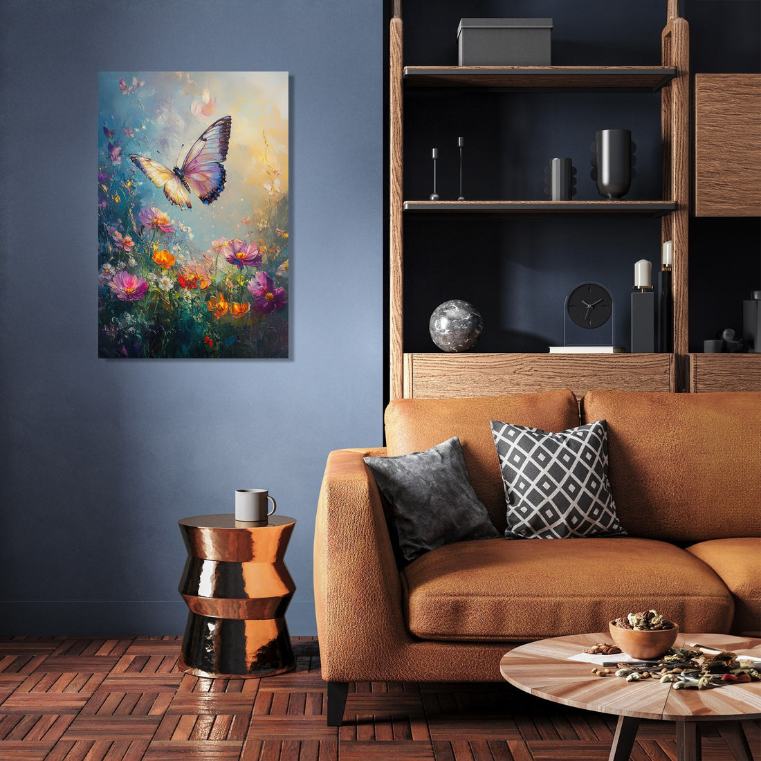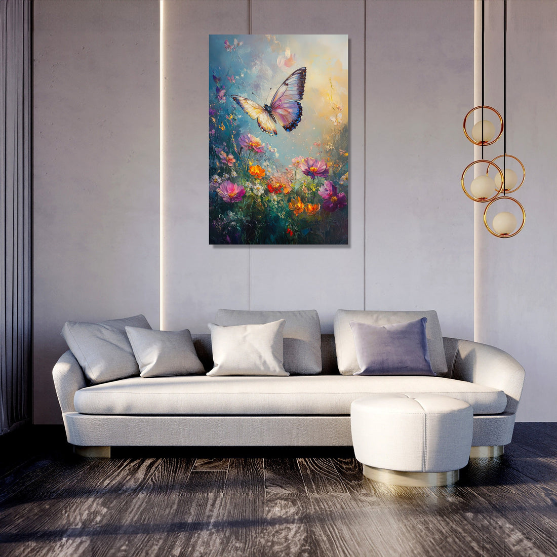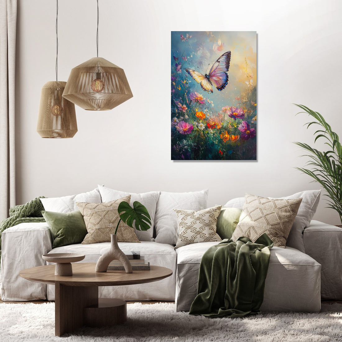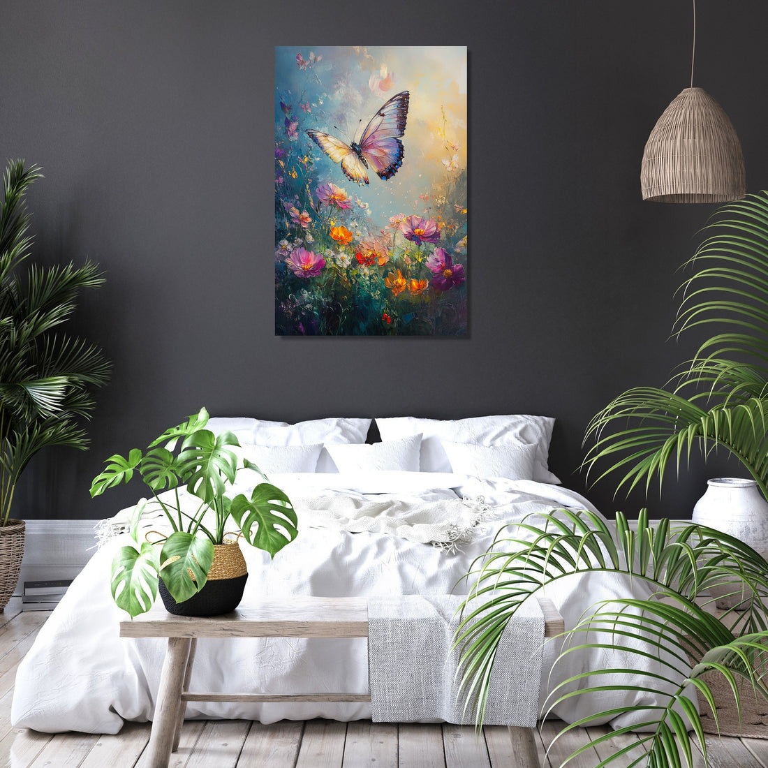 This captivating scene offers a serene blend of softness and vivid detail, making it a perfect focal point for any room. The sfumato technique imparts an ethereal quality, harmonising the butterfly's elegance with the blooming splendour, ideal for creating a peaceful ambient setting in both home and office décor.