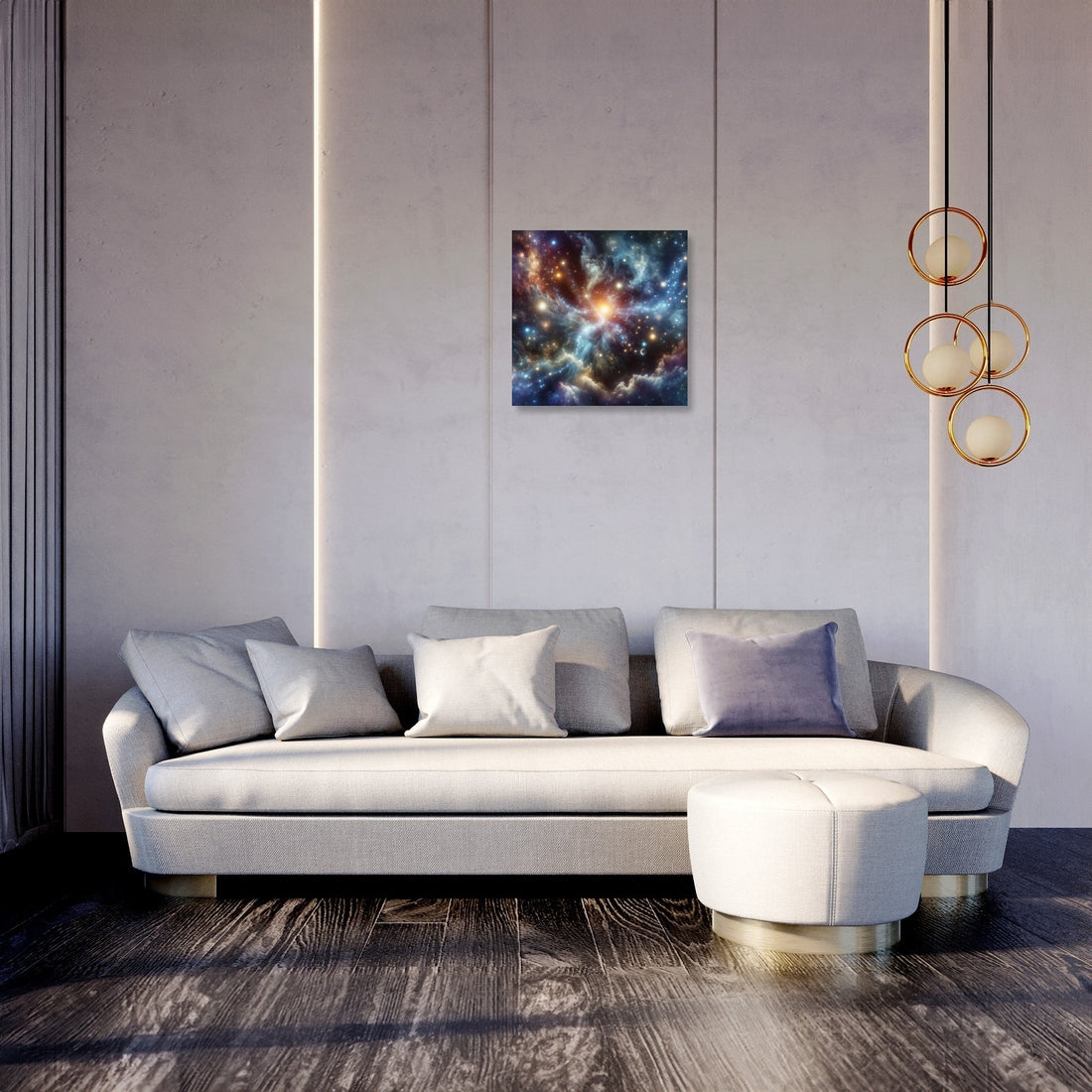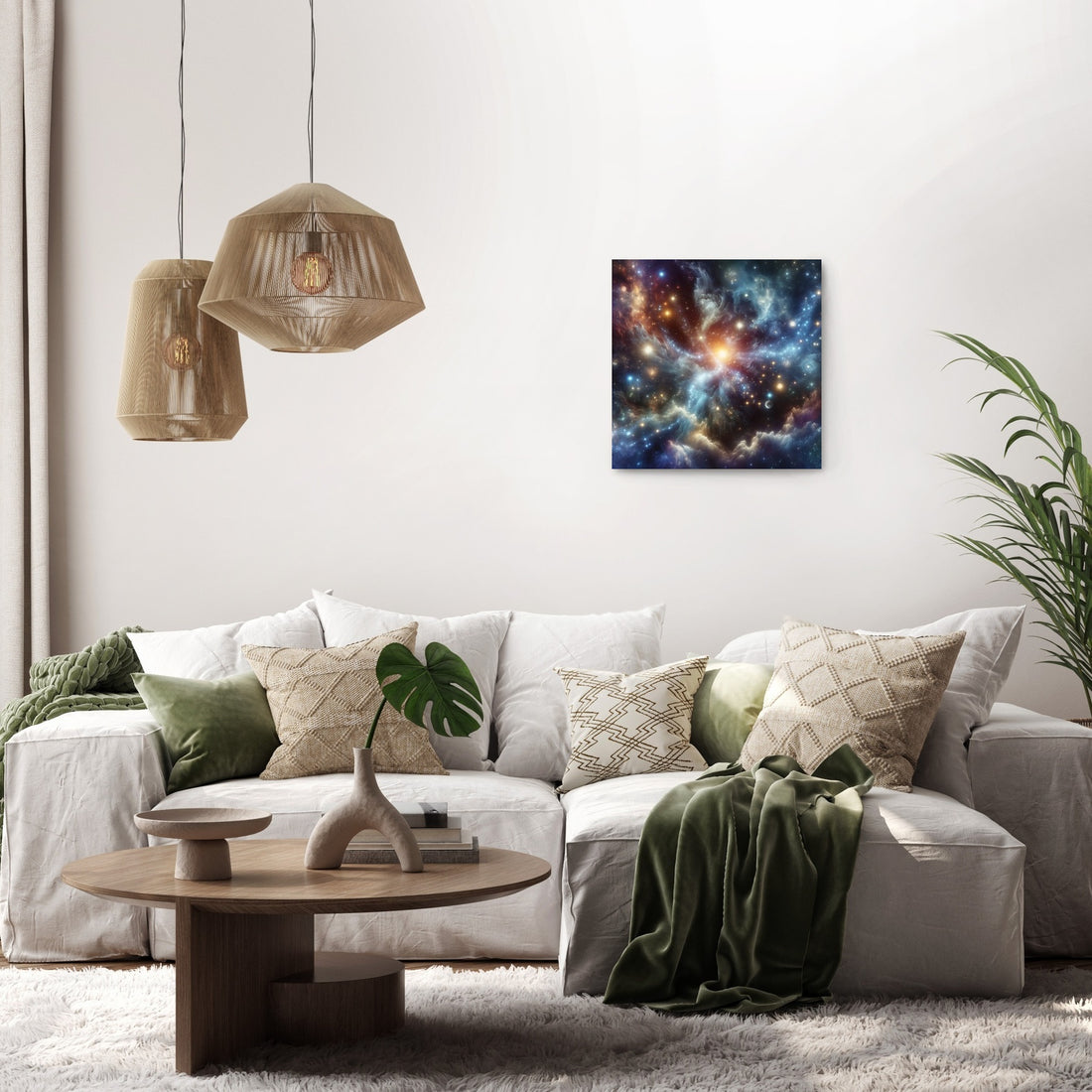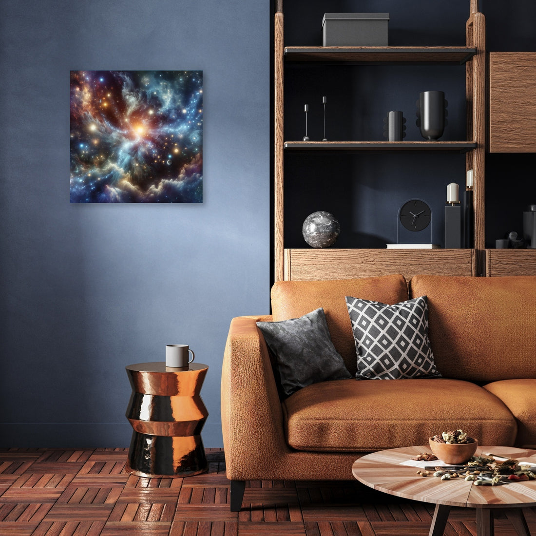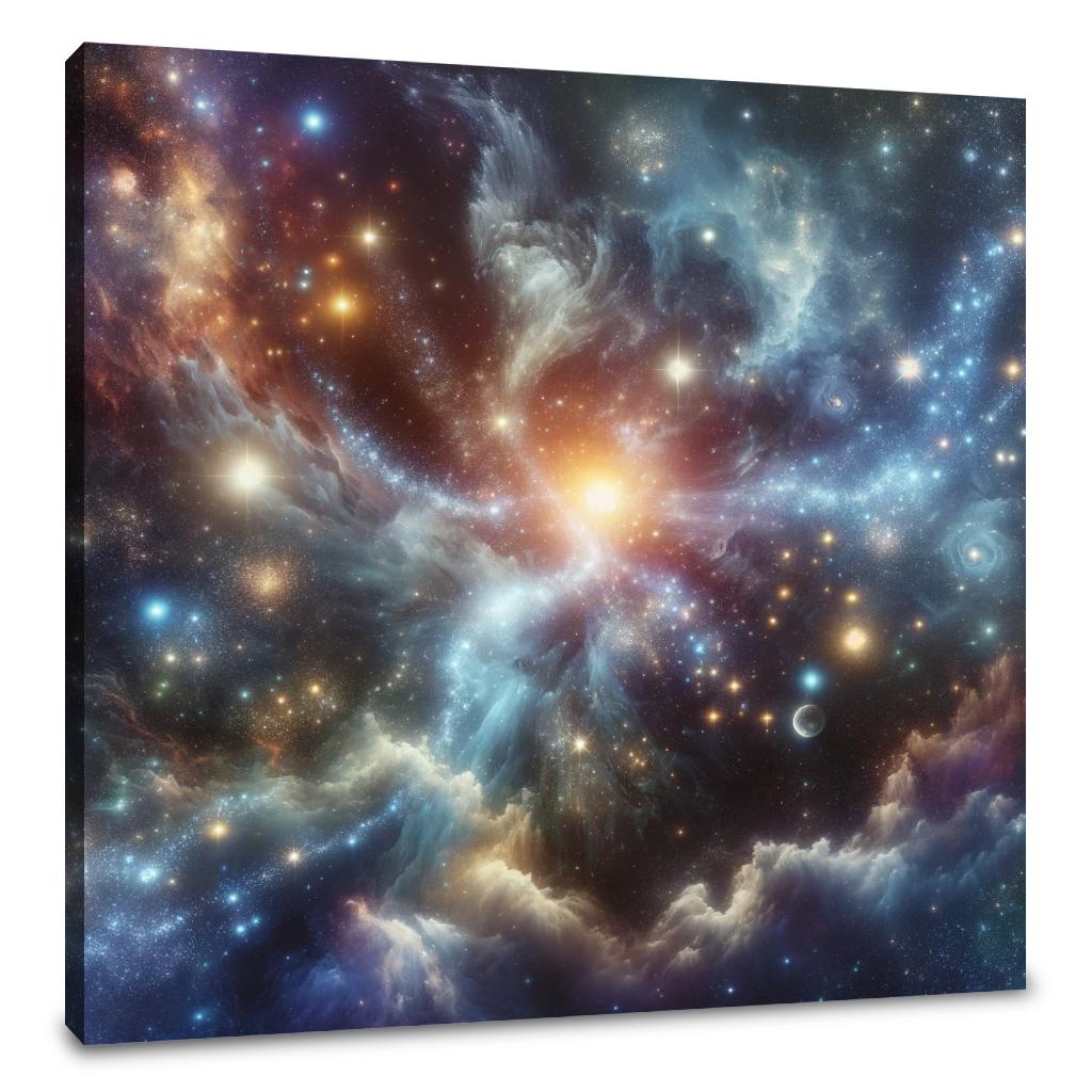 Immerse yourself in a breathtaking wall art piece that effortlessly combines the wonders of cosmic landscapes and galactic vistas. This artwork captures the grandeur of constellations, the ethereal beauty of nebulae, and the shimmering allure of distant galaxies. It brings to life the serenity and mystery of deep space, offering a glimpse into the universe's vast expanse. The piece brilliantly showcases the magical glow of stars, the vibrant dance of celestial bodies, and the captivating enigma of black holes. It embodies the tranquility and immensity of outer space while sparking a sense of awe and exploration. This artwork is a harmonious blend of cosmic elements, creating a visually stunning masterpiece that draws the viewer into the depths of the universe's mysteries. It's a tribute to the magnificent cosmos, perfect for enhancing any space with its creativity and style.