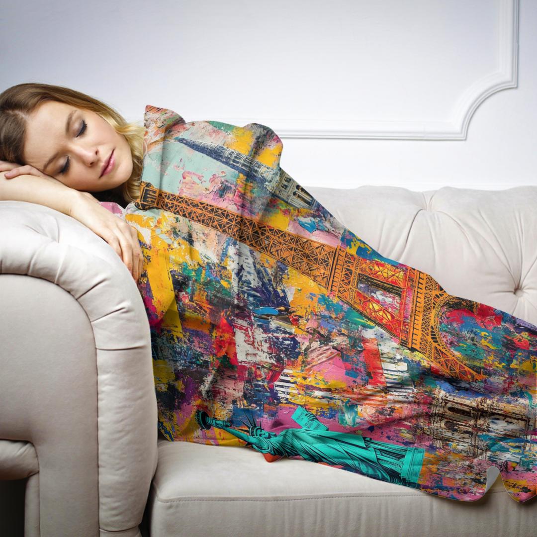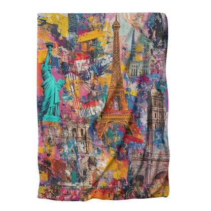 Adorn your space with the vibrant and eclectic "World Landmarks" blanket, featuring a dynamic, colourful fusion of famous structures. The eye-catching print includes the Statue of Liberty, Eiffel Tower, and other iconic monuments, artfully blended onto a canvas of bold, abstract brushstrokes. Ideal for those who cherish travel and art, this piece brings a burst of energy and worldly charm to any room.