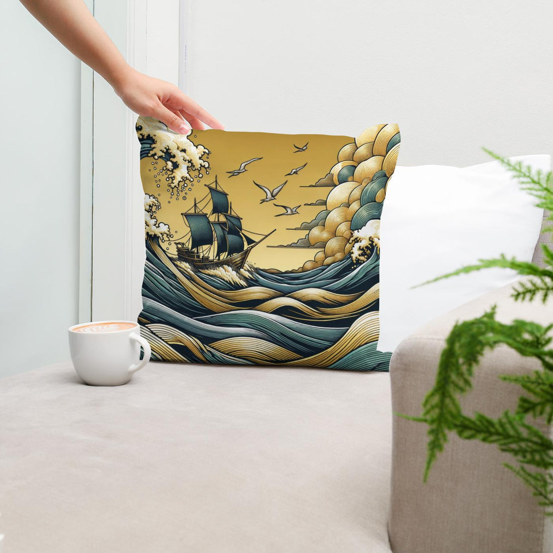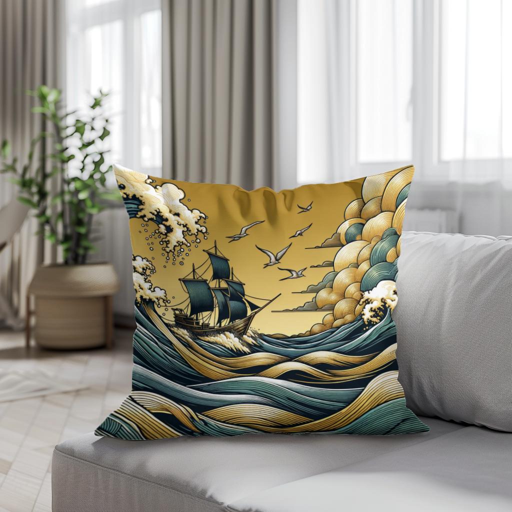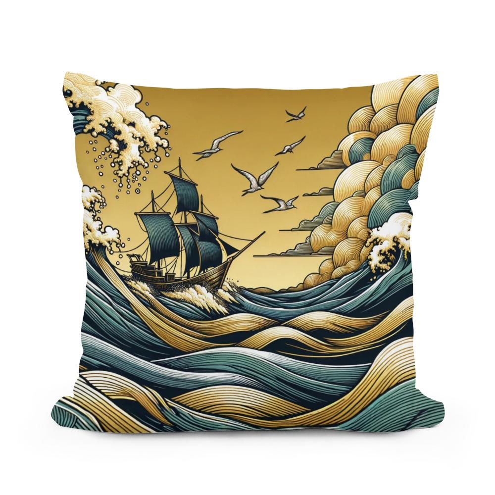 Add a touch of adventure to your living space with this captivating printed cotton cushion. It features an evocative scene of a classic sailing ship braving tumultuous waves, beautifully contrasted against a golden backdrop. With elegant, curling foam and seagulls soaring amidst cloud-like waves, this design draws inspiration from traditional woodblock prints, lending a timeless, artistic flair to any room. Perfect for those who cherish the call of the sea and the allure of old-world voyages.