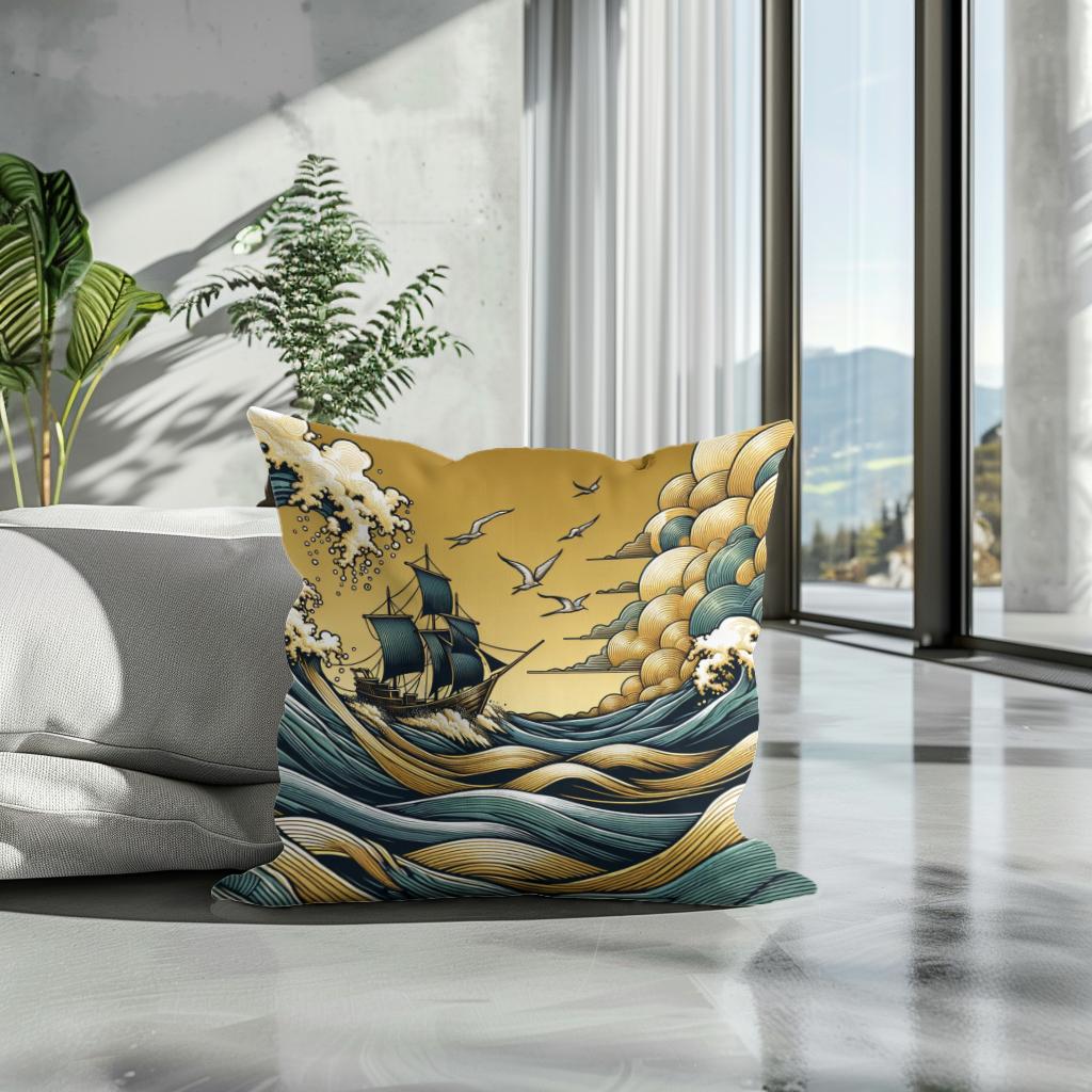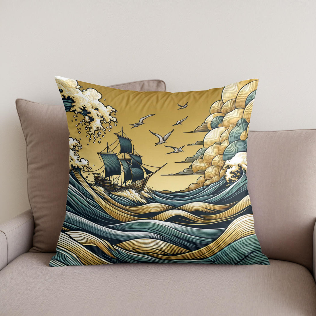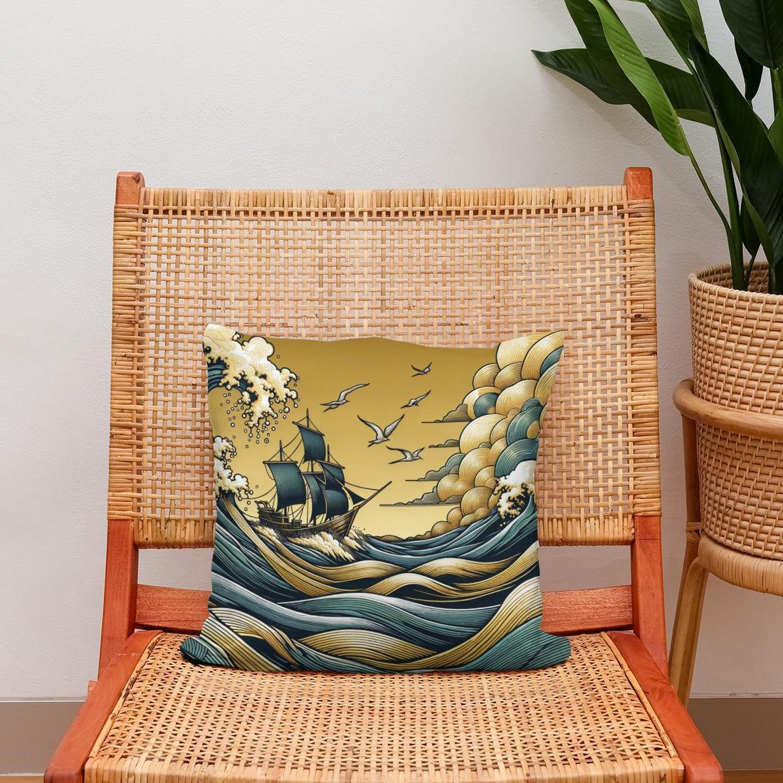 Add a touch of adventure to your living space with this captivating printed cotton cushion. It features an evocative scene of a classic sailing ship braving tumultuous waves, beautifully contrasted against a golden backdrop. With elegant, curling foam and seagulls soaring amidst cloud-like waves, this design draws inspiration from traditional woodblock prints, lending a timeless, artistic flair to any room. Perfect for those who cherish the call of the sea and the allure of old-world voyages.