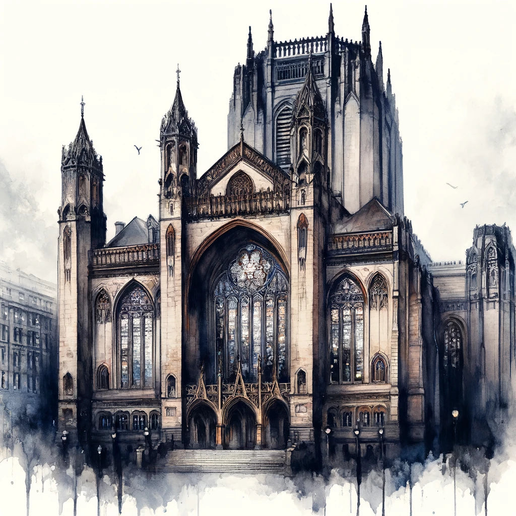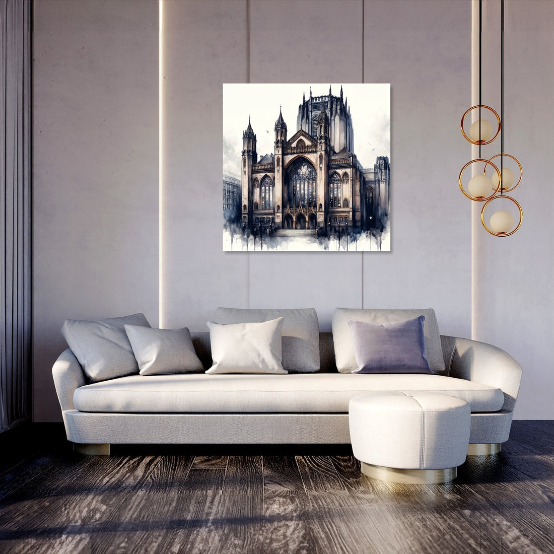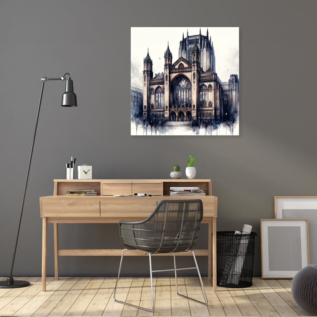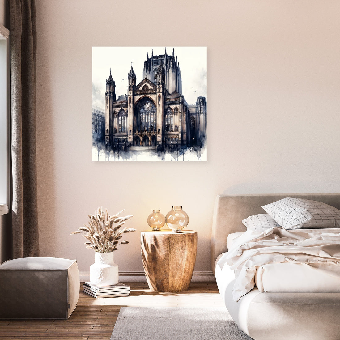 This watercolor painting of Liverpool Cathedral captures the majestic beauty of its Gothic architecture in Victorian style. Dark tones enhance the intricate details and stained glass, lending a soft, ethereal quality to the imposing structure. Perfect for those who appreciate historical architecture and the interplay of shadows and light in art.