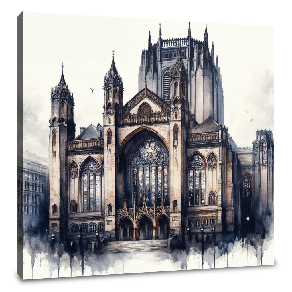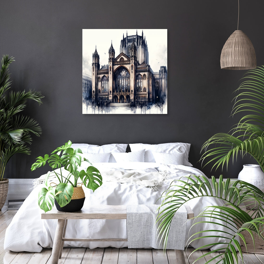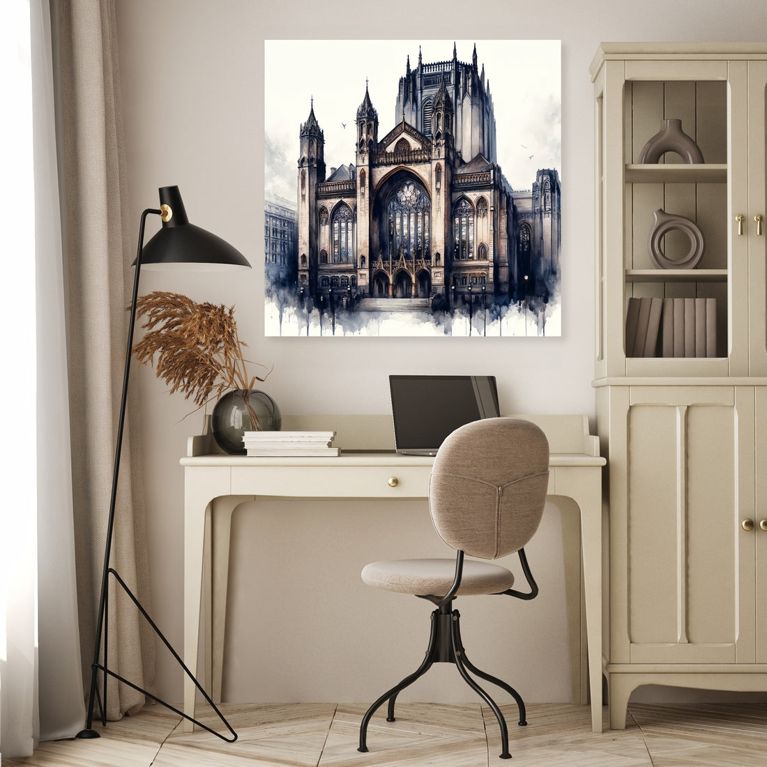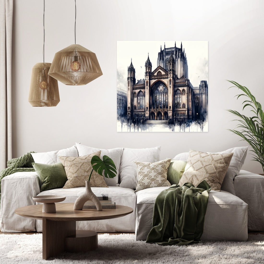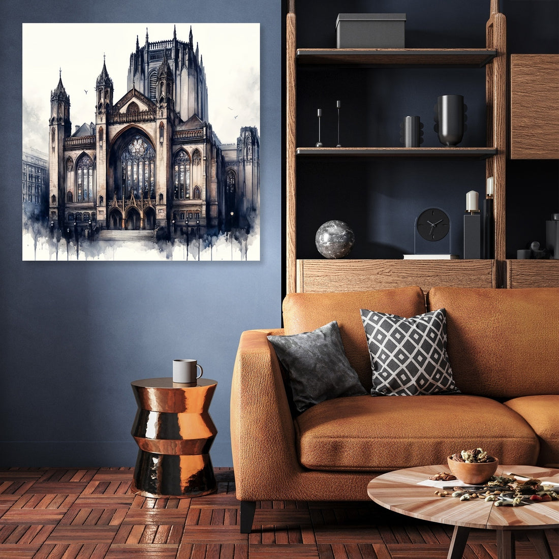 This watercolor painting of Liverpool Cathedral captures the majestic beauty of its Gothic architecture in Victorian style. Dark tones enhance the intricate details and stained glass, lending a soft, ethereal quality to the imposing structure. Perfect for those who appreciate historical architecture and the interplay of shadows and light in art.