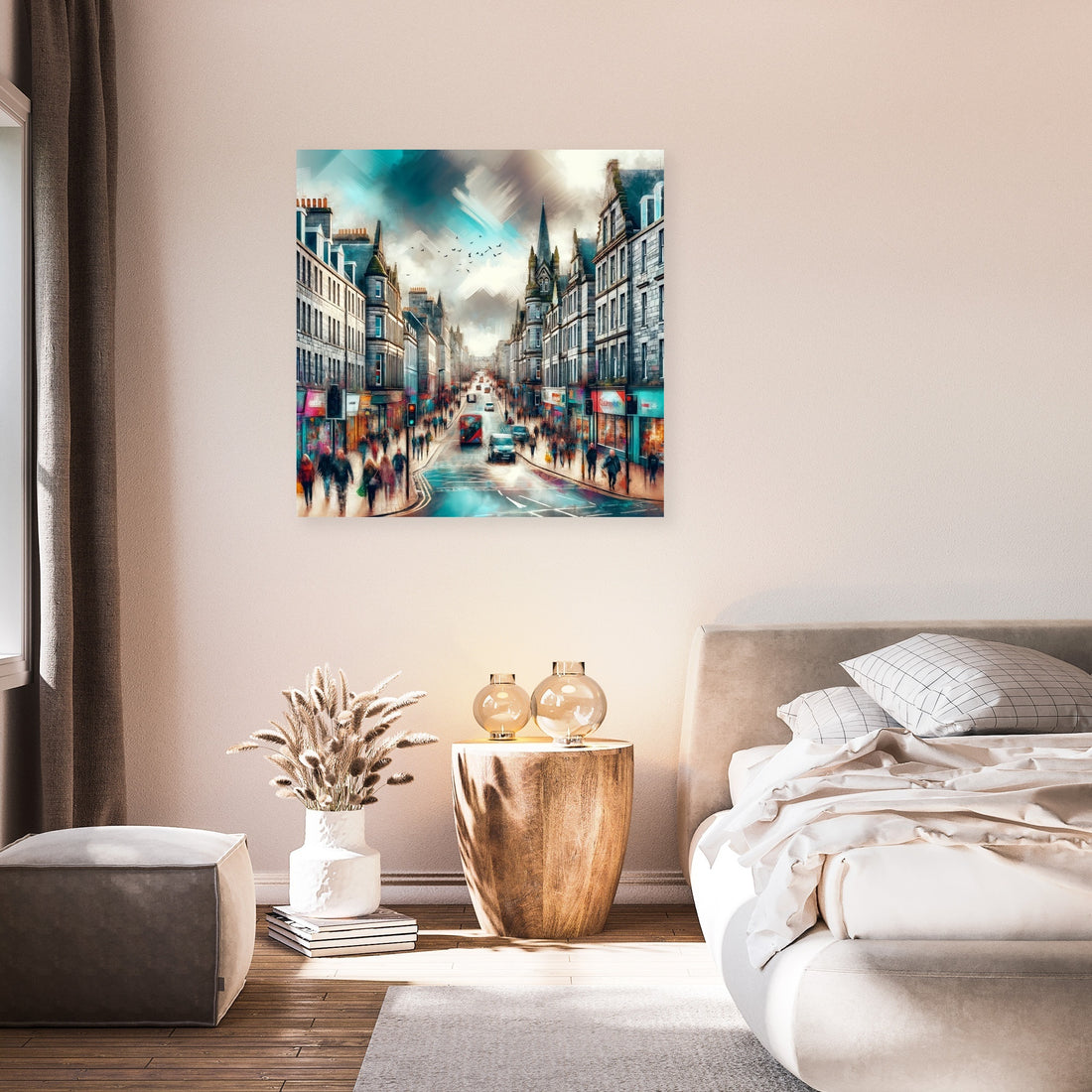 Capturing the essence of Aberdeen's Union Street, this artwork melds the realistic depiction of the city's traditional granite buildings and bustling street life with abstract touches. The dynamic scene portrays the vibrant energy of pedestrians and vehicles against a backdrop of soft blues and grays, reminiscent of Aberdeen's maritime climate. This digital painting not only reflects the urban rhythm but also the unique architectural charm of Aberdeen.