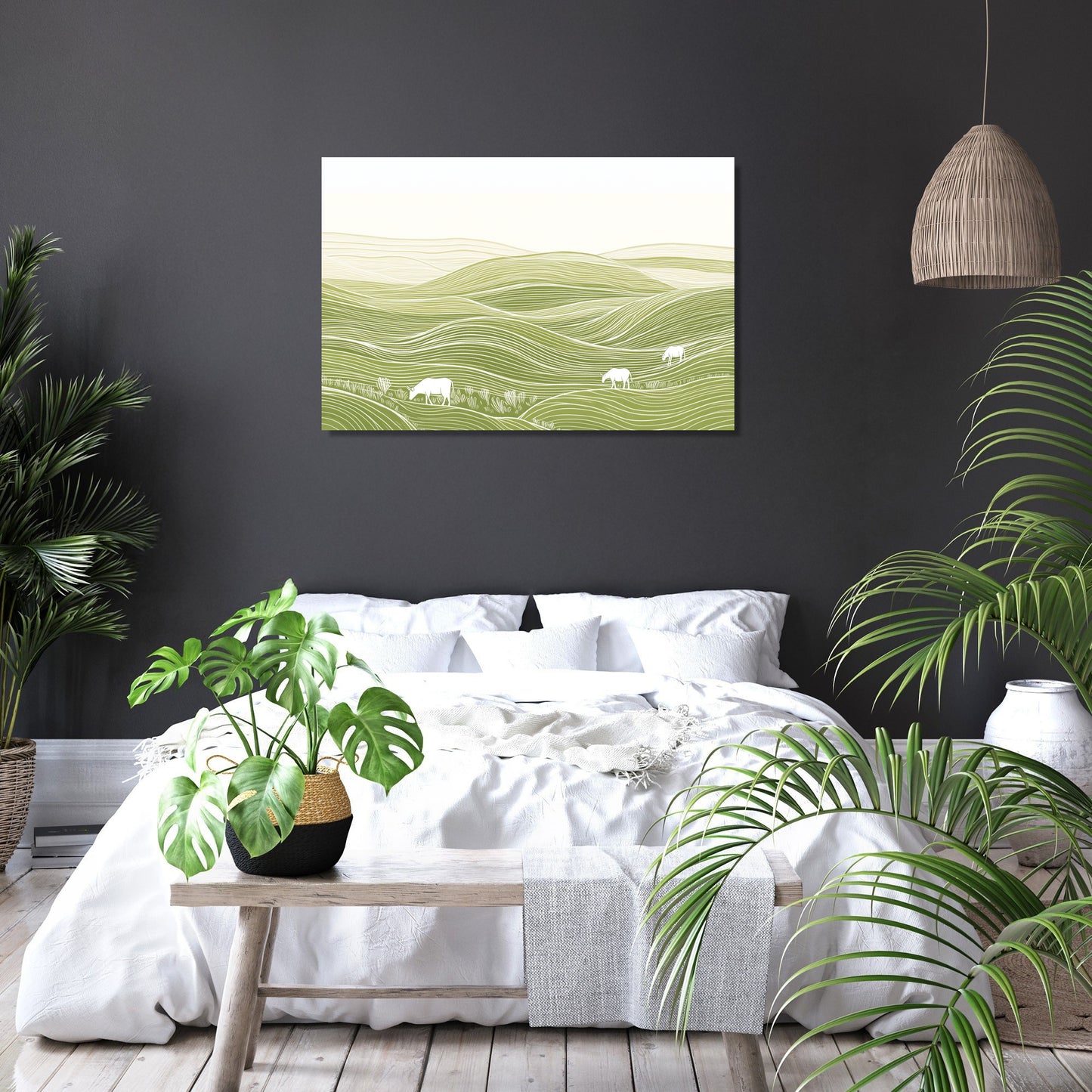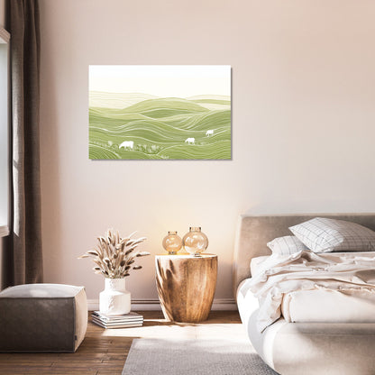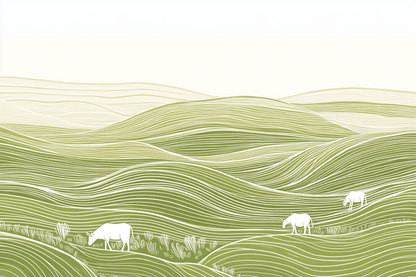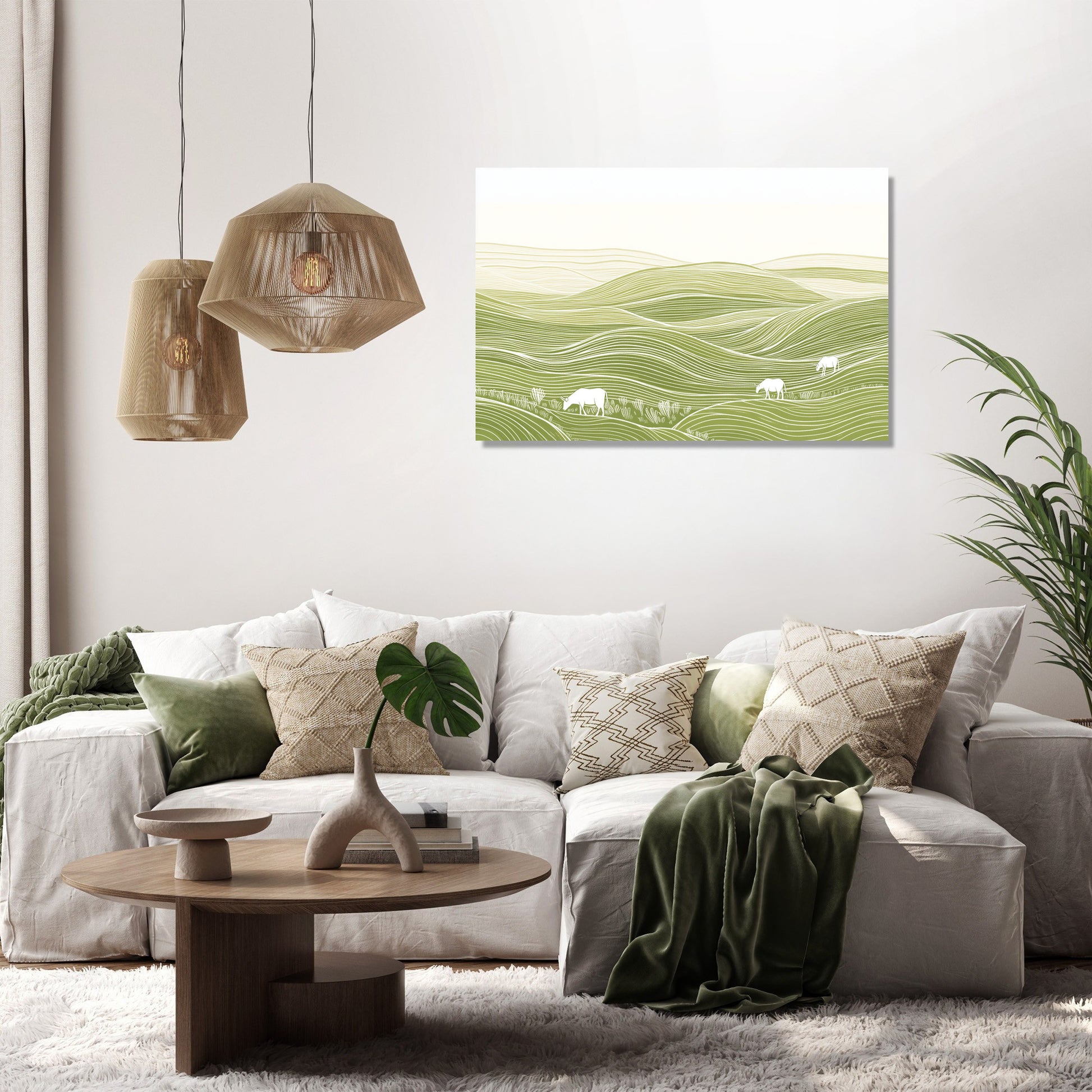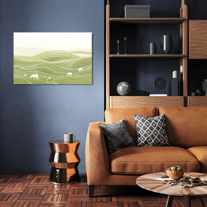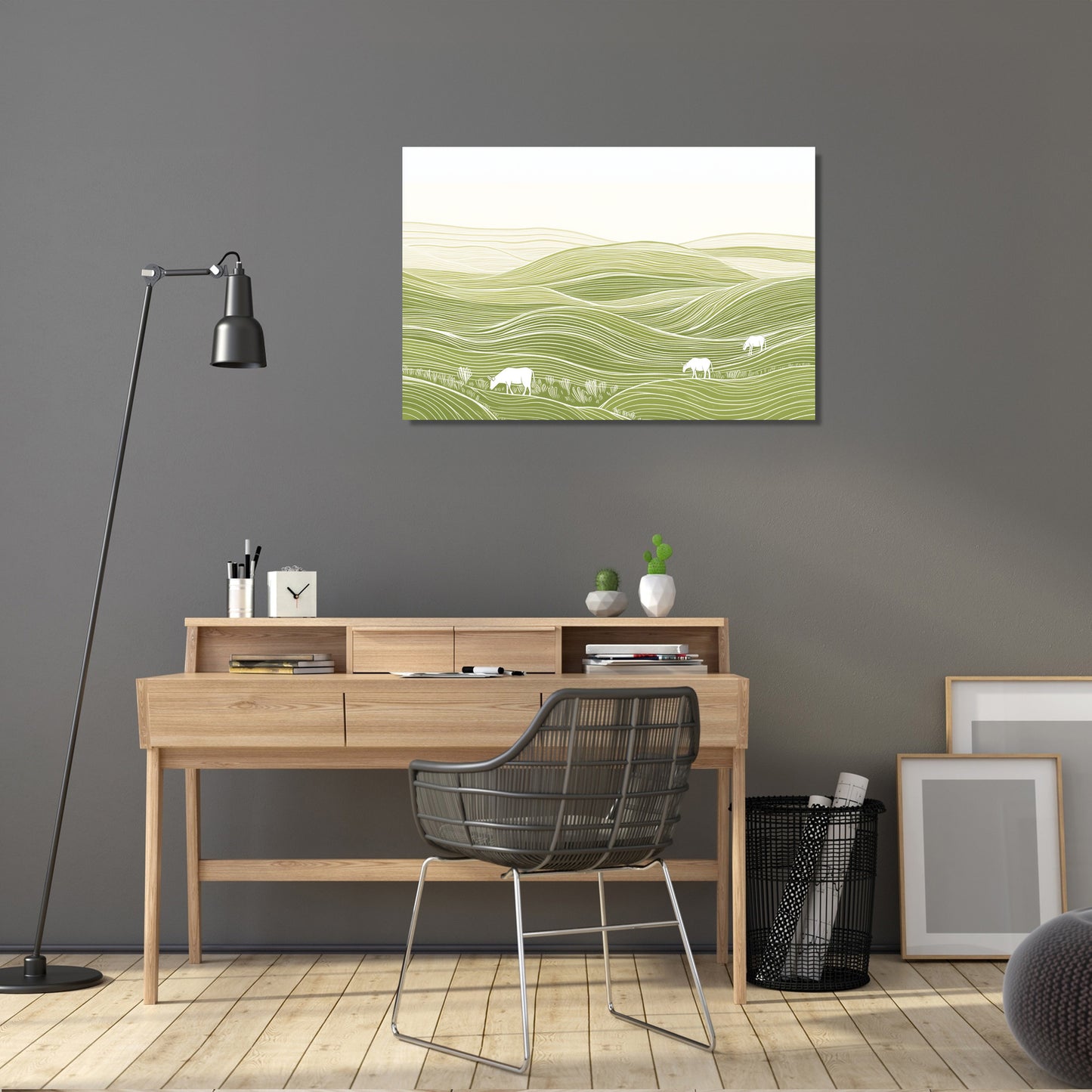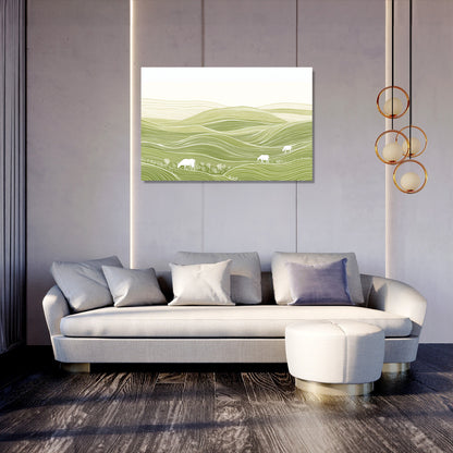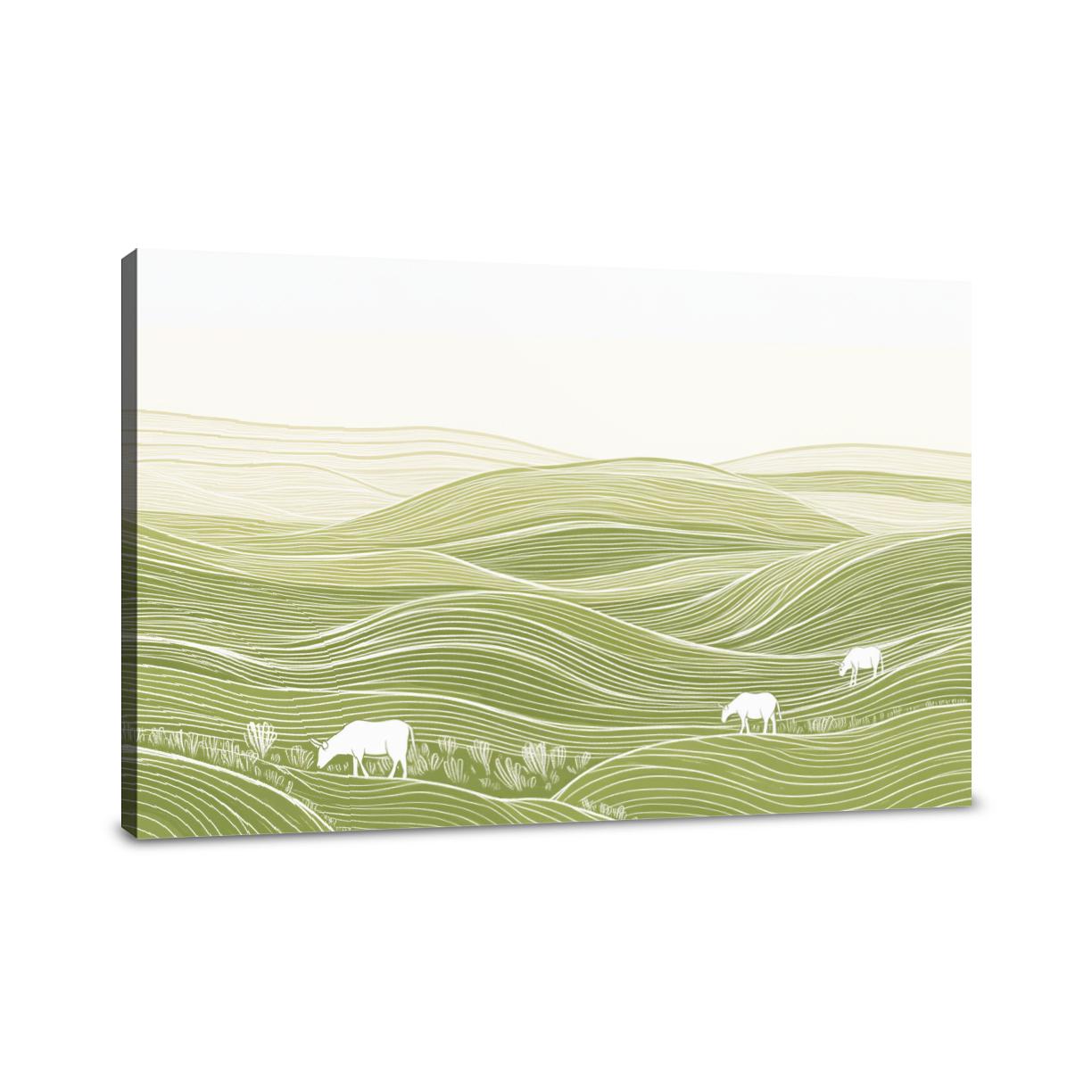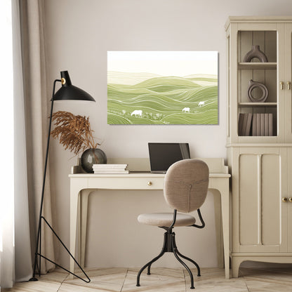 This line art piece, "Grazing Fields Canvas," presents a soothing depiction of pastoral serenity, perfect for enhancing any home or office space. The minimalist composition, with its flowing lines and soft shades of green, brown, and white, creates a calming atmosphere that evokes feelings of peace and relaxation. Its simplicity and elegance make it an ideal piece to complement a modern or rustic decor, adding a touch of nature's tranquillity to your surroundings.