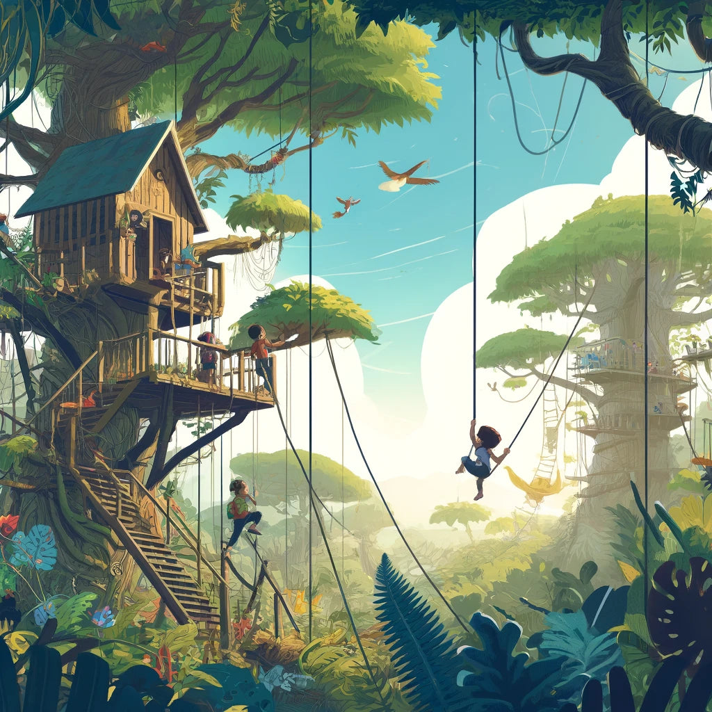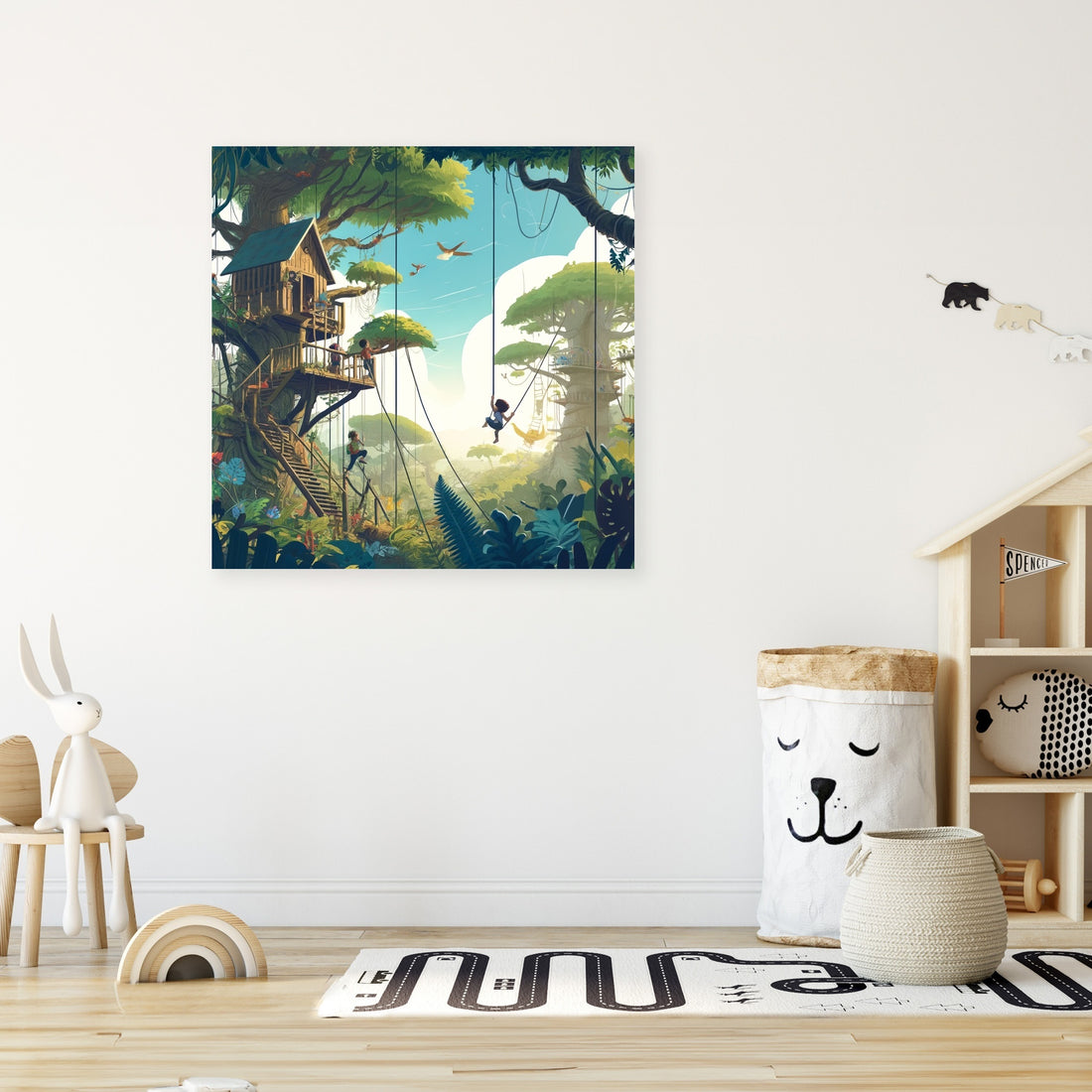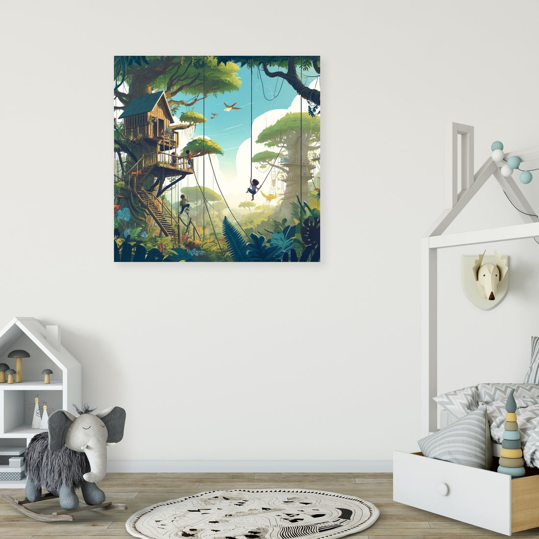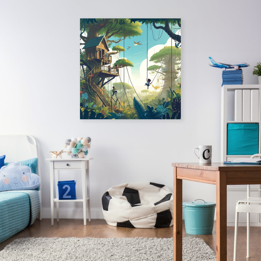 This dynamic wall art features children exploring a treehouse in a lush jungle filled with exotic animals and plants. The background showcases towering trees, cascading vines, and a clear blue sky. The children are seen climbing ropes, swinging on vines, and discovering hidden treasures, capturing a lively and adventurous spirit. Perfect for a child's room, nursery, or playroom, this artwork inspires a sense of exploration.