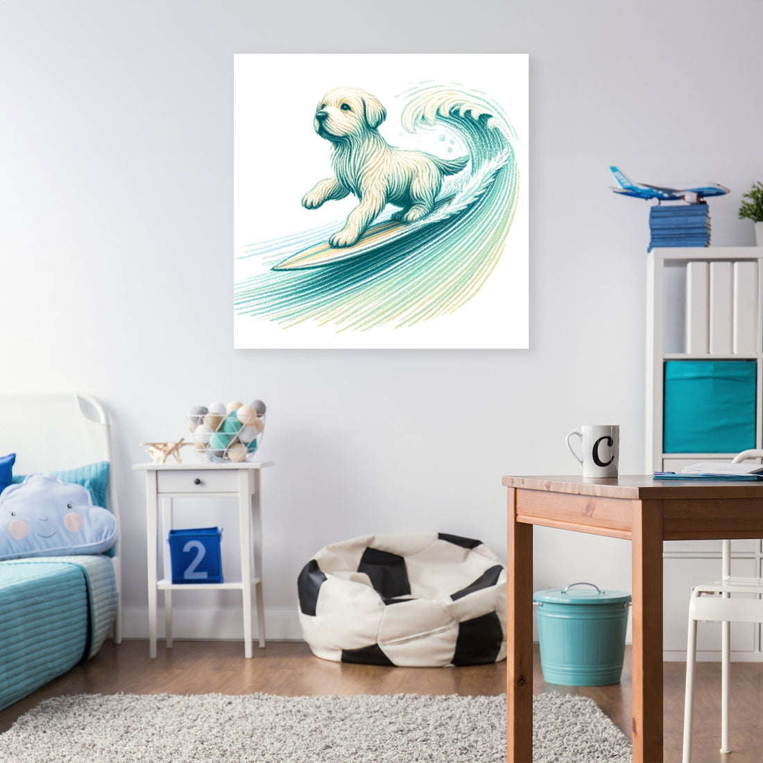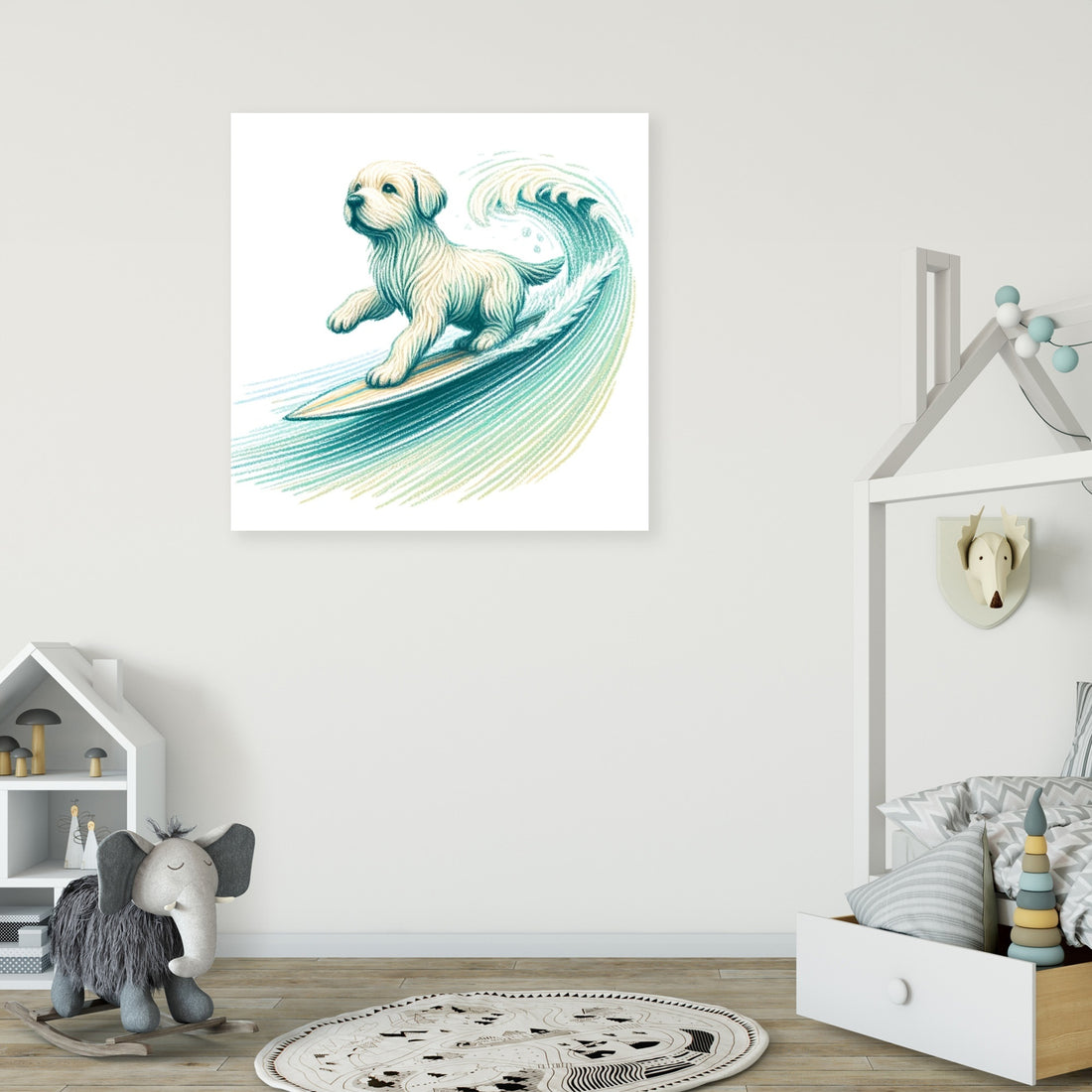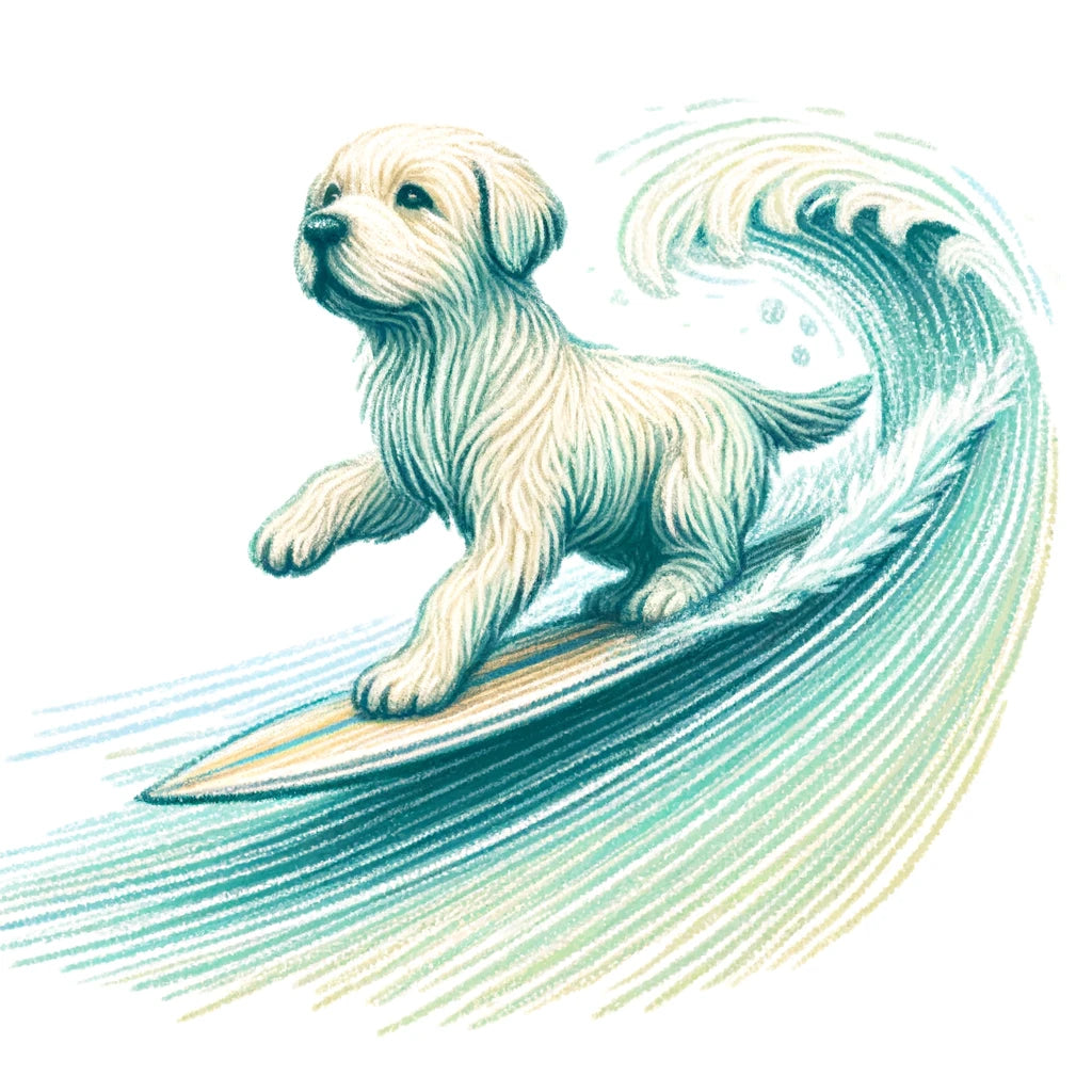This joyful wall art features a playful illustration of a Labrador surfing on a wave, created with delicate crayon-like lines. The dog is captured mid-surf, with its fur flowing as it rides the wave. The soft pastel blues and greens of the wave complement the Labrador’s lively movement, adding a hand-drawn, childlike charm to the scene. Perfect for adding a whimsical touch to any space, this piece evokes a sense of fun and freedom.