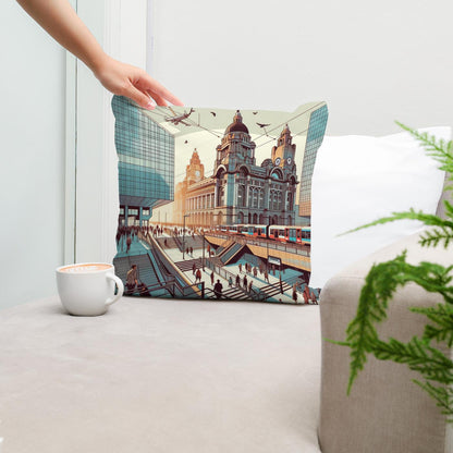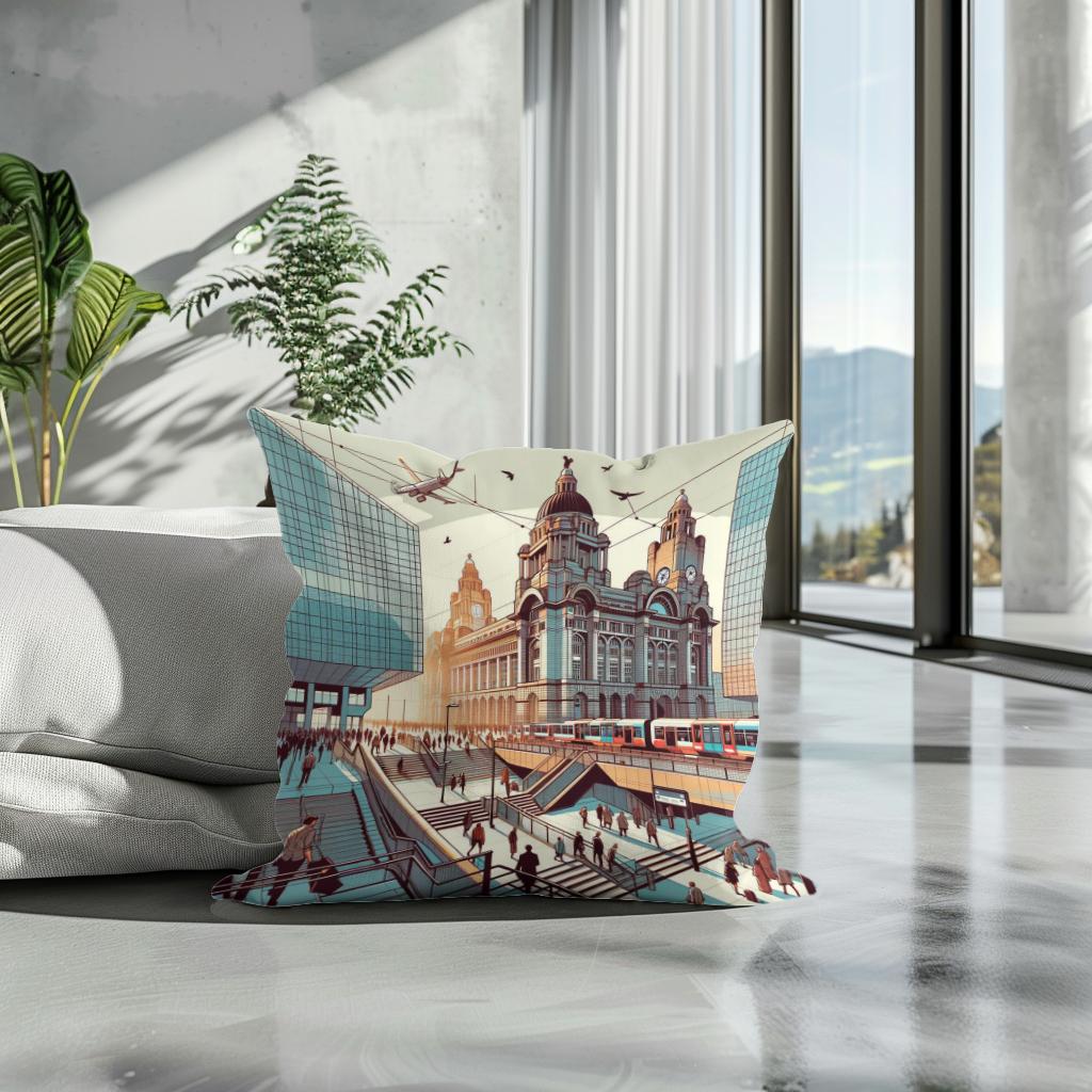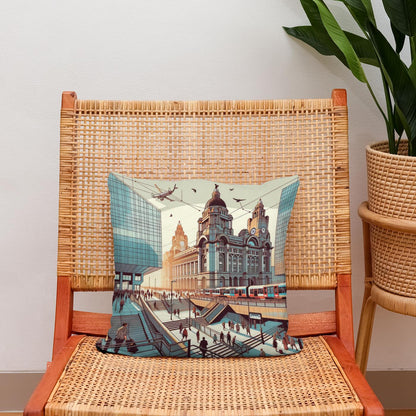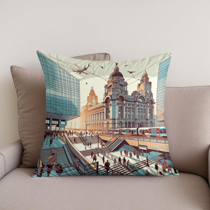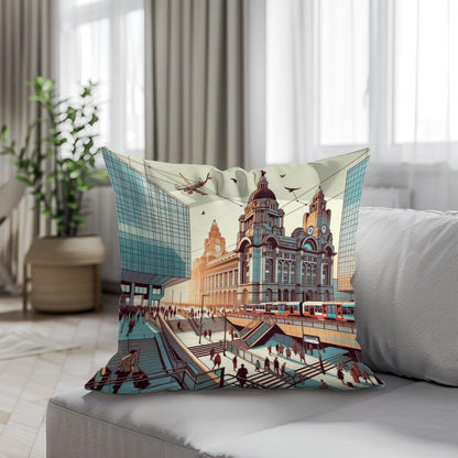 This captivating cushion design showcases a bustling, futuristic cityscape blending classic architecture with modern elements. Featuring a vibrant illustration of commuters, trams, and soaring aircraft against grand buildings, the scene is rendered in warm, sepia tones with teals and blues, offering a striking visual narrative. Perfect for adding a touch of urban sophistication and whimsical charm to any room.