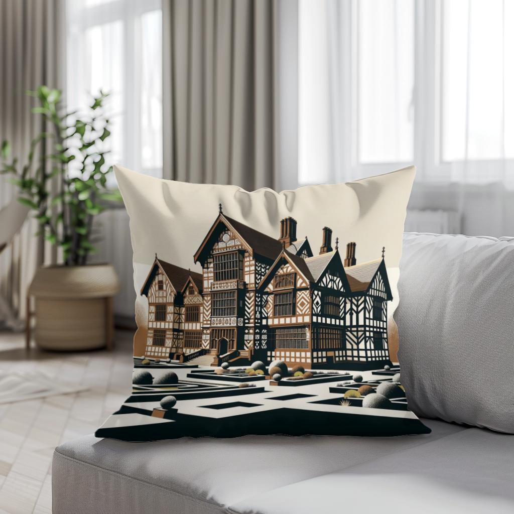 This elegant cotton cushion features an intricate depiction of a stunning Tudor-style manor house, set amidst a meticulously designed formal garden. The monochrome palette accentuates the architectural details and symmetrical beauty of the topiary garden, creating a timeless and sophisticated piece suitable for any decor. Add a touch of historical charm and artistic flair to your home with this beautiful cushion.