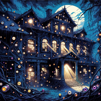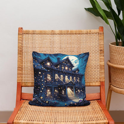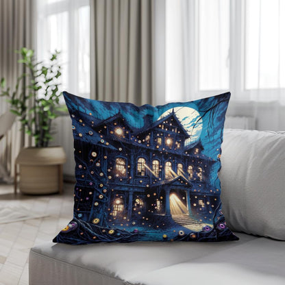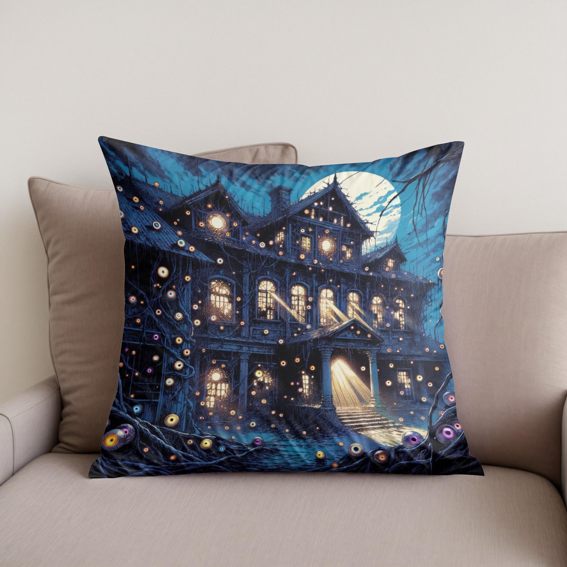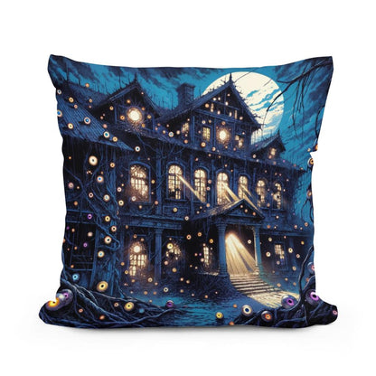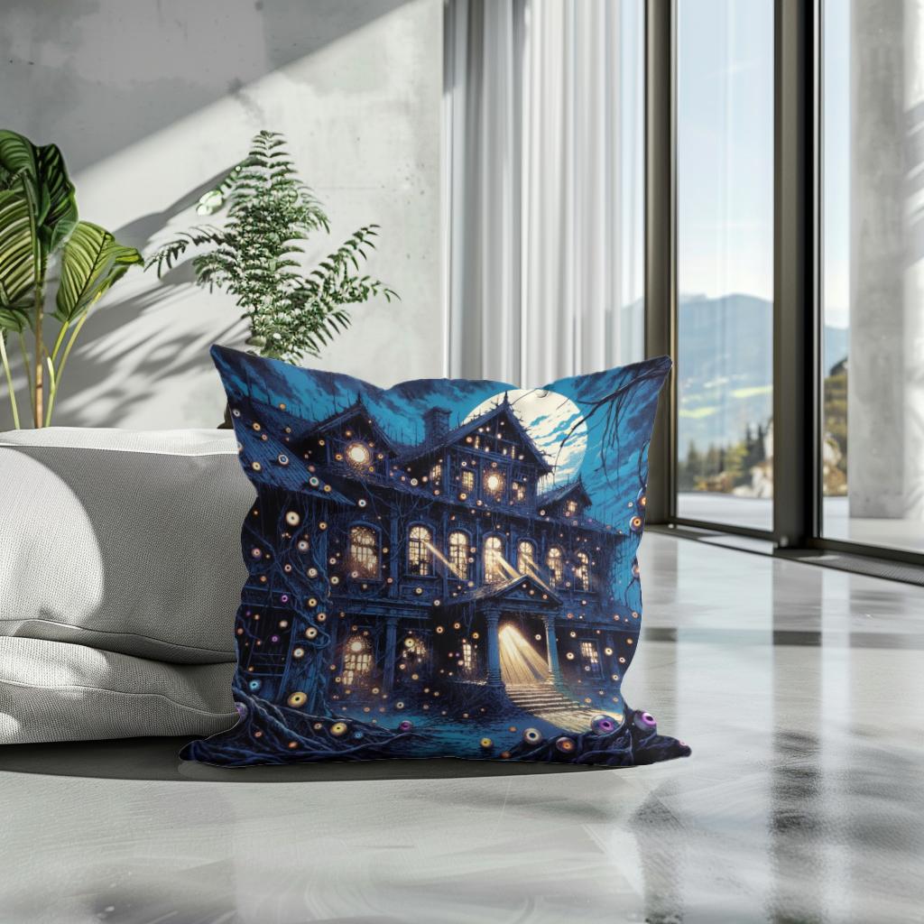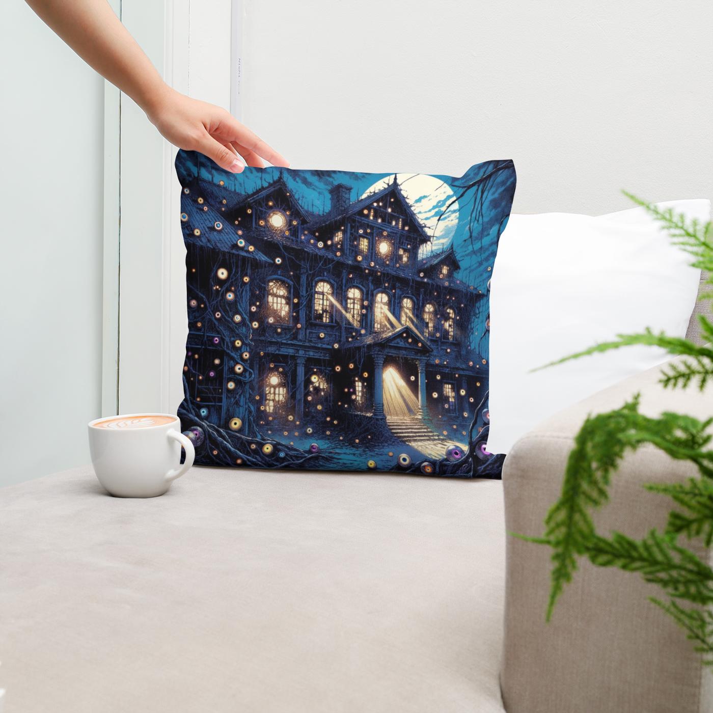 Adorn your space with the enchanting allure of this cotton cushion, featuring a mesmerizing image of a mysterious, eerie mansion enveloped by the dark of night. Illuminated within by a ghostly glow, the house stands amidst a surreal landscape of watchful, vivid eyes peering out from twisted, shadowy foliage. A captivating blend of gothic charm and whimsical fantasy, this cushion is perfect for adding a touch of intrigue and storytelling to any room.