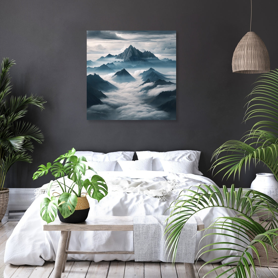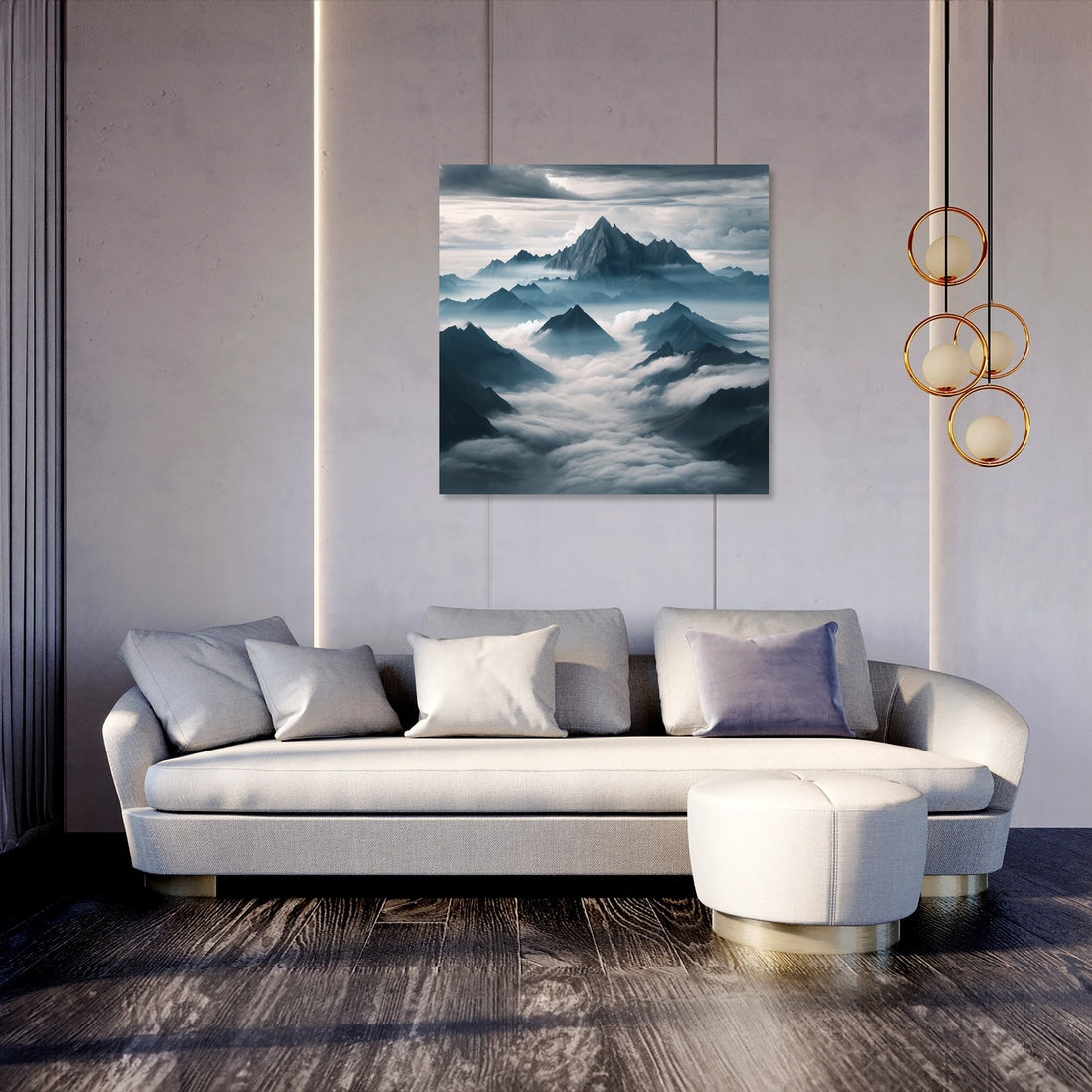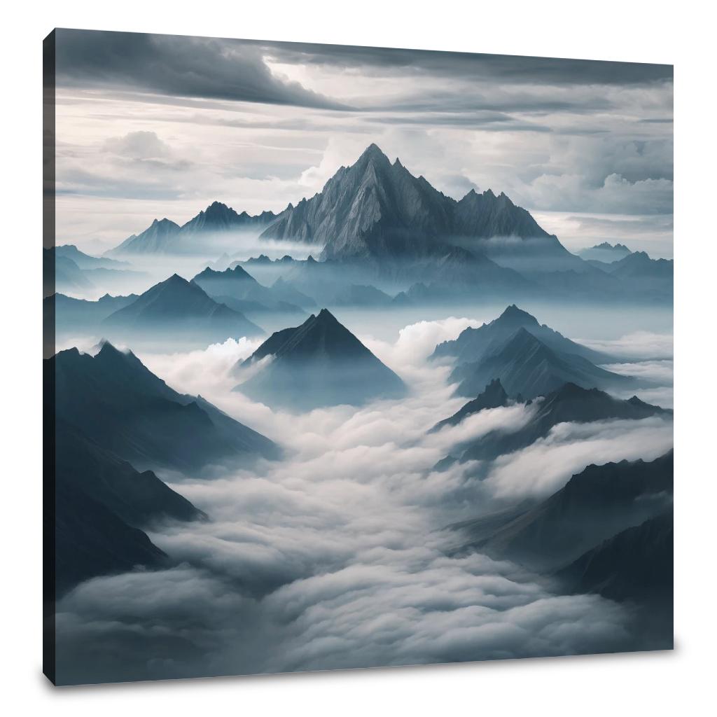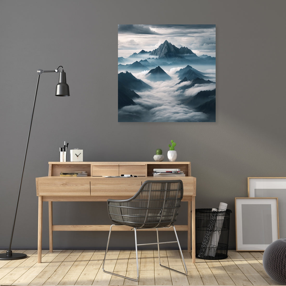 Dive into the ethereal beauty of a majestic mountain range shrouded in early morning mist with this captivating wall art. Peaks rise through the mist, partially obscured by low-hanging clouds, while valleys below are filled with dense fog, creating a sense of depth and mystery. Subtle shades of grey, blue, and white enhance the awe-inspiring and serene nature of this scene. Perfect for any room, this piece adds a touch of majestic tranquillity to your space.