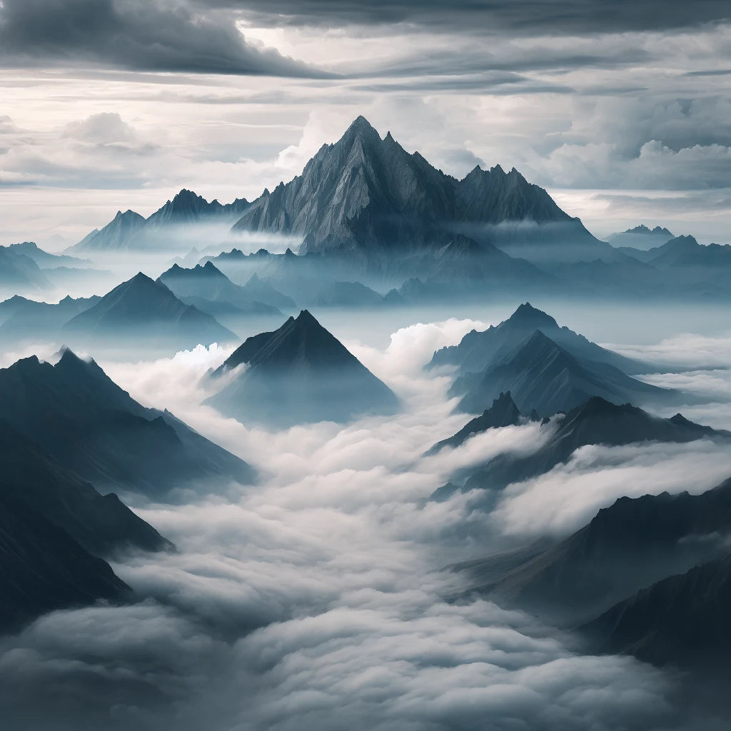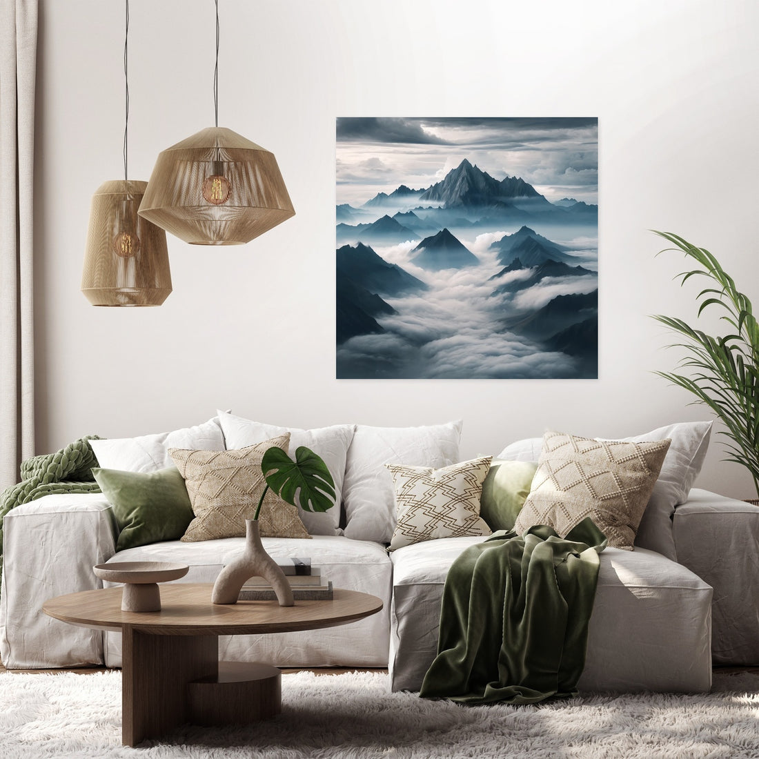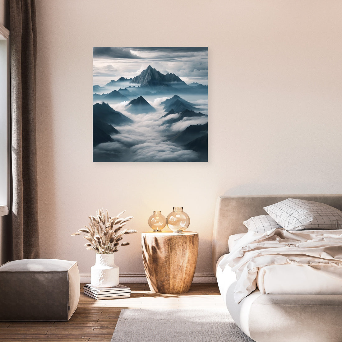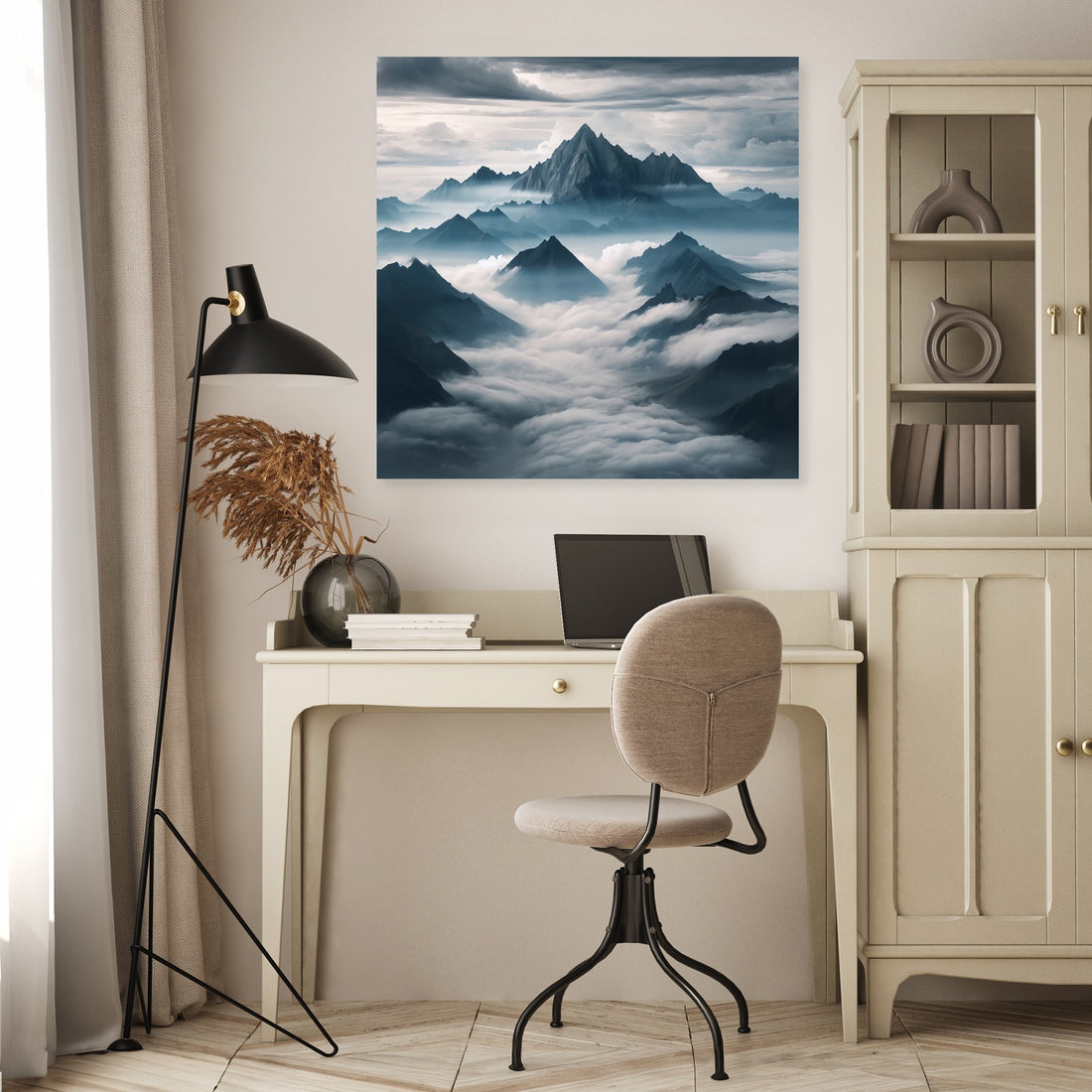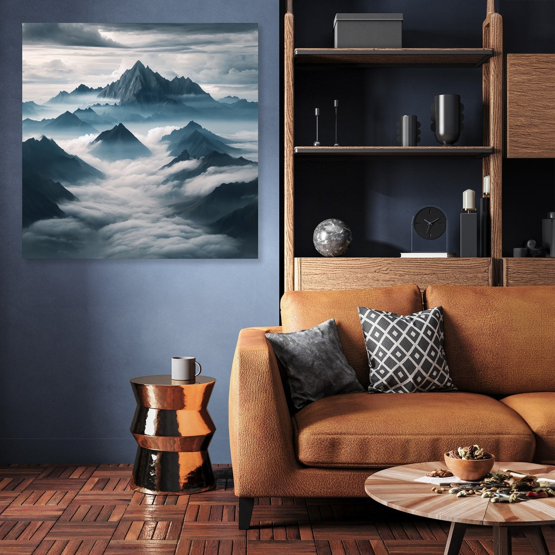 Dive into the ethereal beauty of a majestic mountain range shrouded in early morning mist with this captivating wall art. Peaks rise through the mist, partially obscured by low-hanging clouds, while valleys below are filled with dense fog, creating a sense of depth and mystery. Subtle shades of grey, blue, and white enhance the awe-inspiring and serene nature of this scene. Perfect for any room, this piece adds a touch of majestic tranquillity to your space.