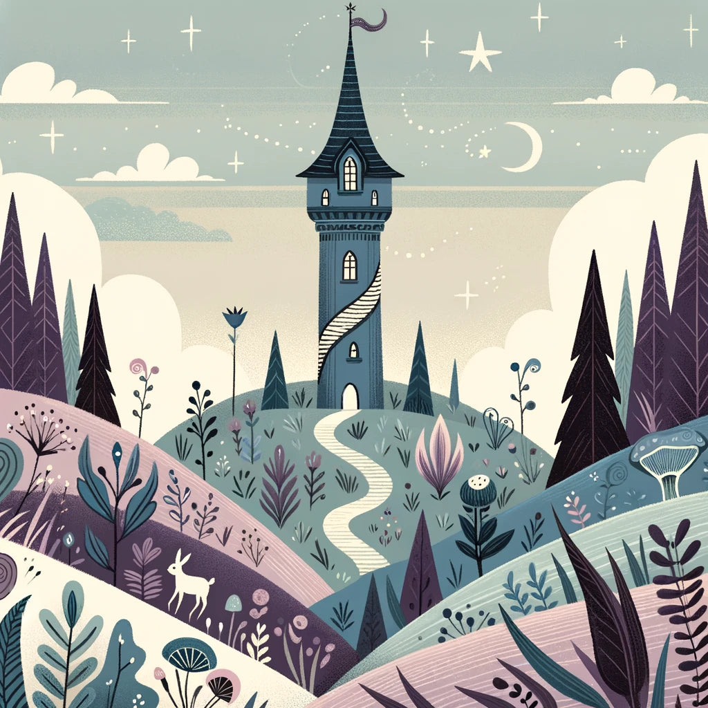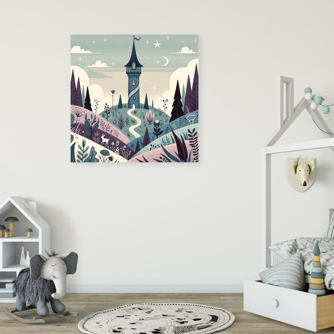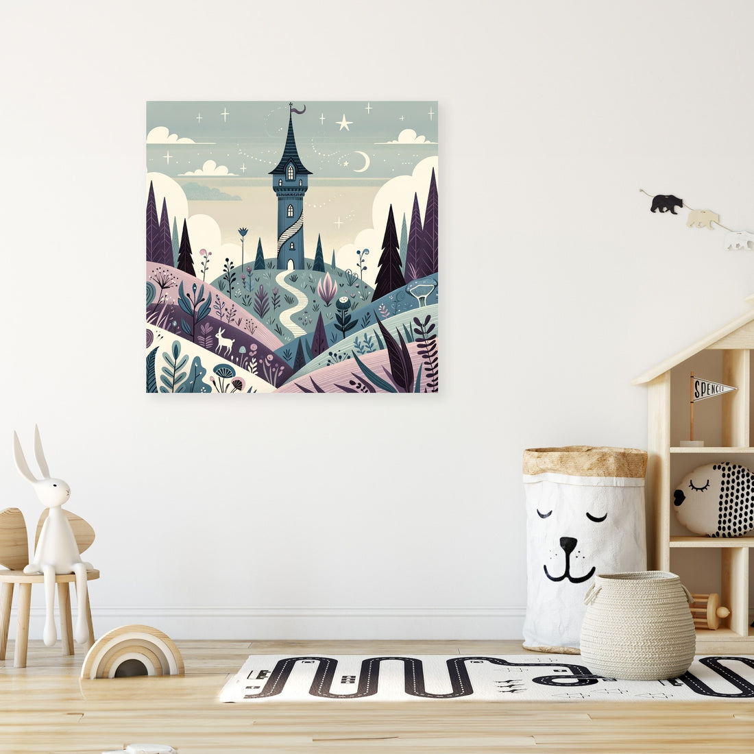 Introducing the 'Mystic Tower Canvas', a mesmerising piece of wall art that brings a touch of magic to any room. This enchanting canvas features a whimsical wizard's tower, perched atop a gentle hill amidst a landscape of mystical plants and friendly creatures like deer and rabbits. Painted in soft, muted purples, blues, and greens, it creates an inviting and magical atmosphere. Ideal for igniting a sense of wonder, it's a perfect addition to a child's bedroom or play area.