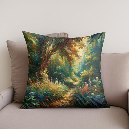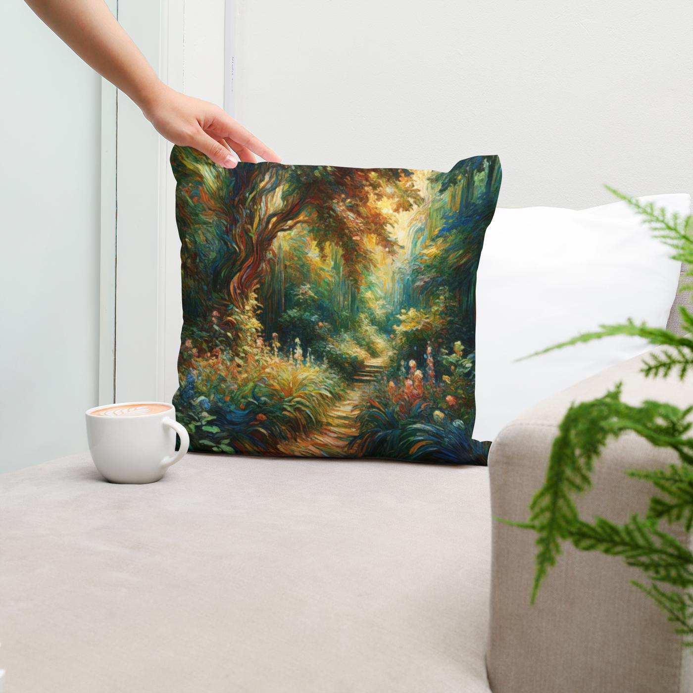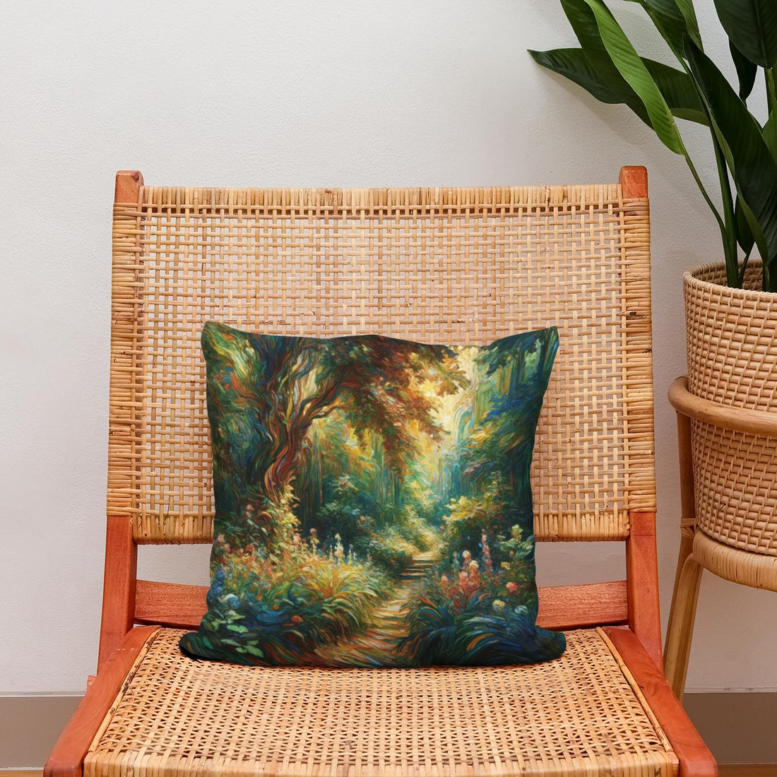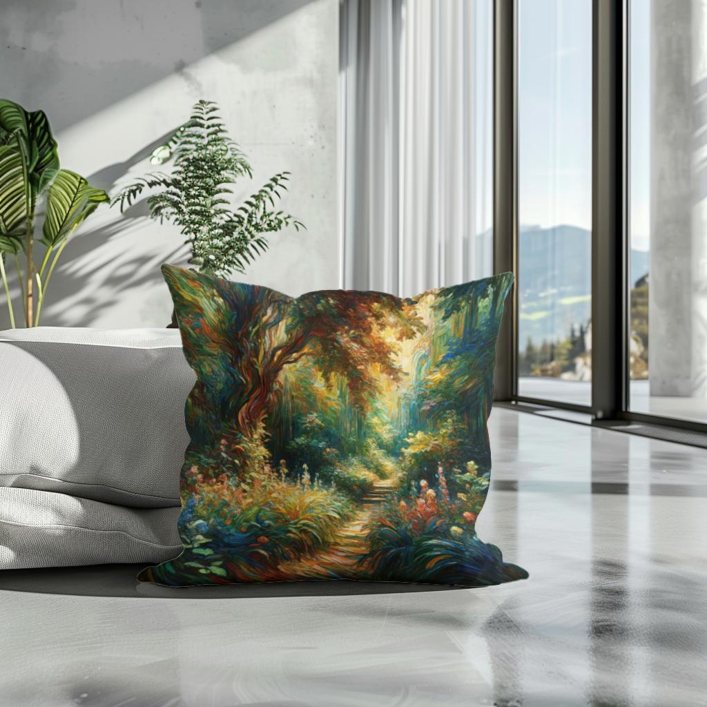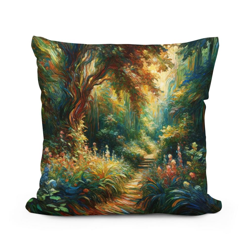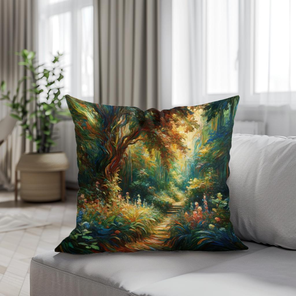 This enchanting printed cotton cushion captures an exquisite impressionistic forest scene, alive with vibrant hues and whimsical light. Majestic trees arch over a serene path, their trunks twisting with character, while lush undergrowth in a kaleidoscope of colours suggests the untold secrets of the woodland. Perfect for adding a touch of nature’s charm and artistic flair to any room.