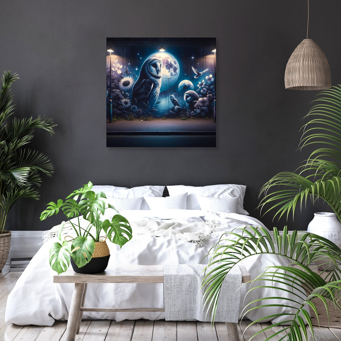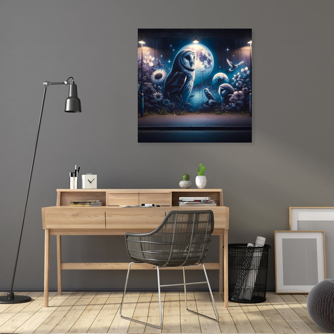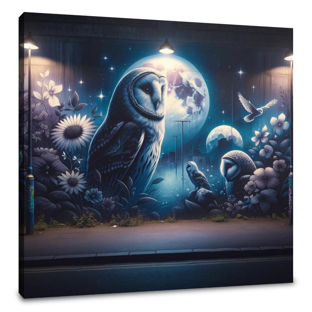 Nightfall Serenade Canvas' transports you to a mesmerizing urban night, where street lamps cast a gentle glow on graffiti depicting a nocturnal landscape. Murals adorned with owls, moons, stars, and night flowers merge with the dark sky, creating a serene and mystical world. The color palette, with its dark blues, purples, and soft moonlit whites, evokes a moody, atmospheric ambiance. This canvas is perfect for those who seek a tranquil and contemplative piece, capturing the quiet beauty of night in an urban setting.