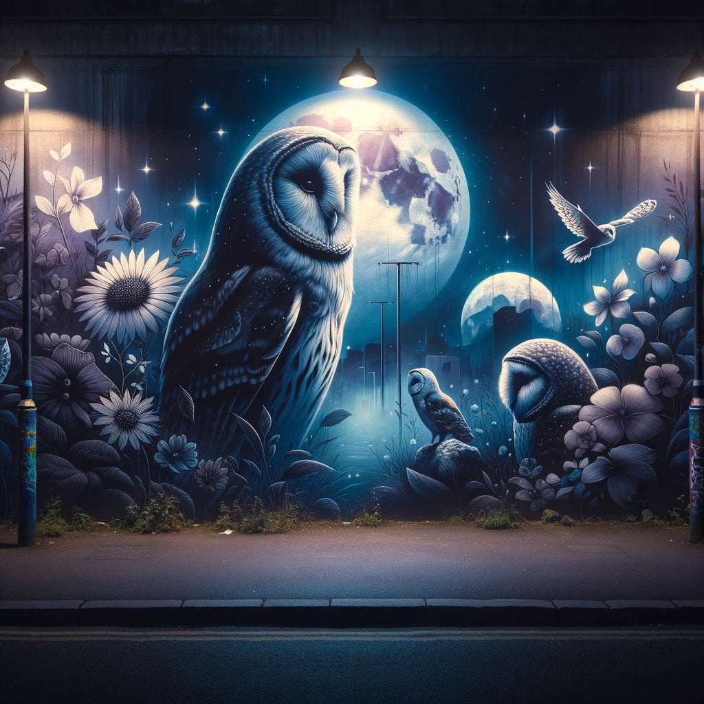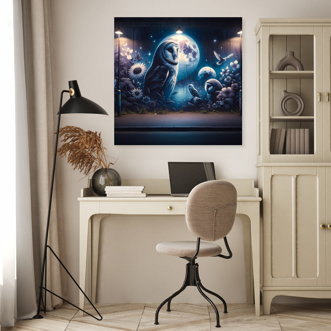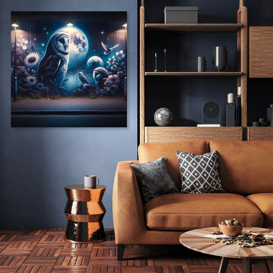 Nightfall Serenade Canvas' transports you to a mesmerizing urban night, where street lamps cast a gentle glow on graffiti depicting a nocturnal landscape. Murals adorned with owls, moons, stars, and night flowers merge with the dark sky, creating a serene and mystical world. The color palette, with its dark blues, purples, and soft moonlit whites, evokes a moody, atmospheric ambiance. This canvas is perfect for those who seek a tranquil and contemplative piece, capturing the quiet beauty of night in an urban setting.
