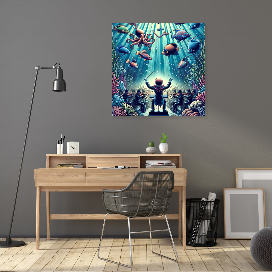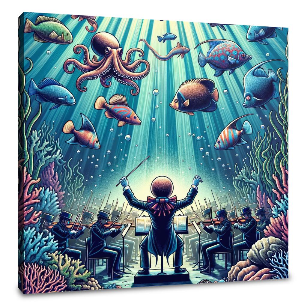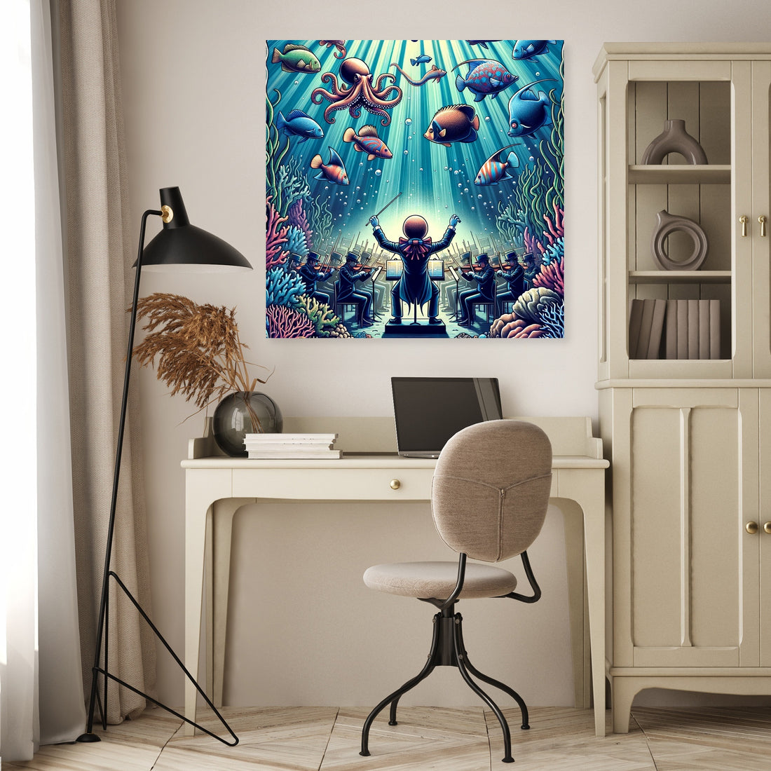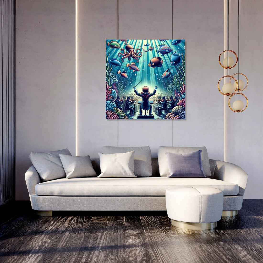 "Oceanic Overture Canvas" invites you into an enchanting underwater concert, where the sea's inhabitants showcase their musical talents. Led by a charismatic octopus conductor, marine animals adorned with pop art patterns perform a symphony of the deep. Coral stands and seaweed curtains frame the orchestra, their muted yet vibrant colors illuminating the ocean floor's bioluminescent glow. This captivating piece harmonizes the sea's natural wonders with the bold spirit of pop art, creating a mesmerizing visual melody that's perfect for any art lover's collection