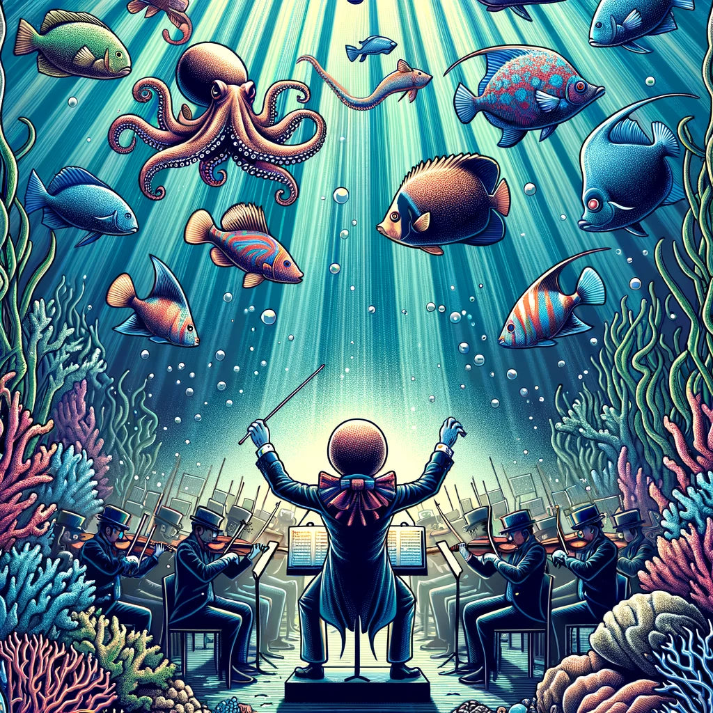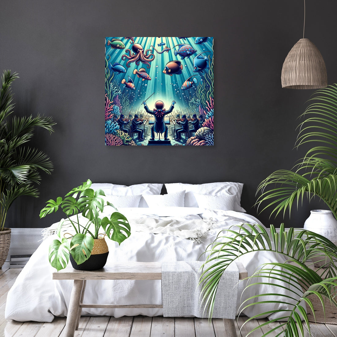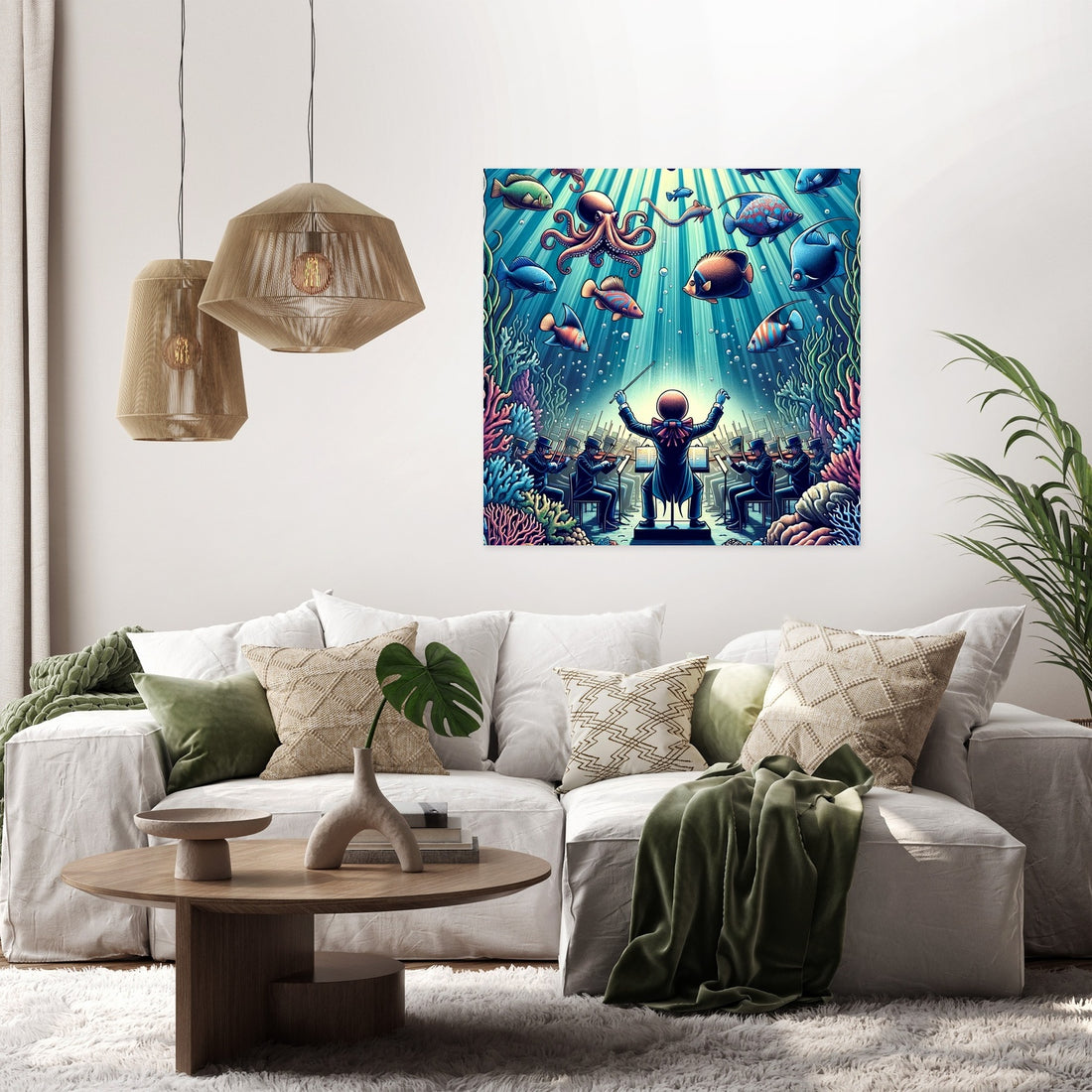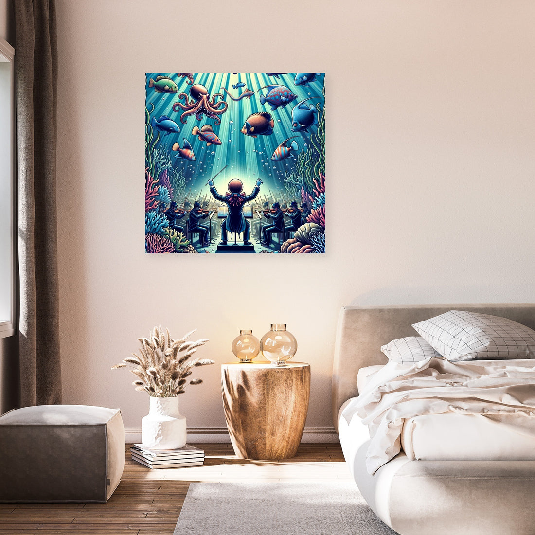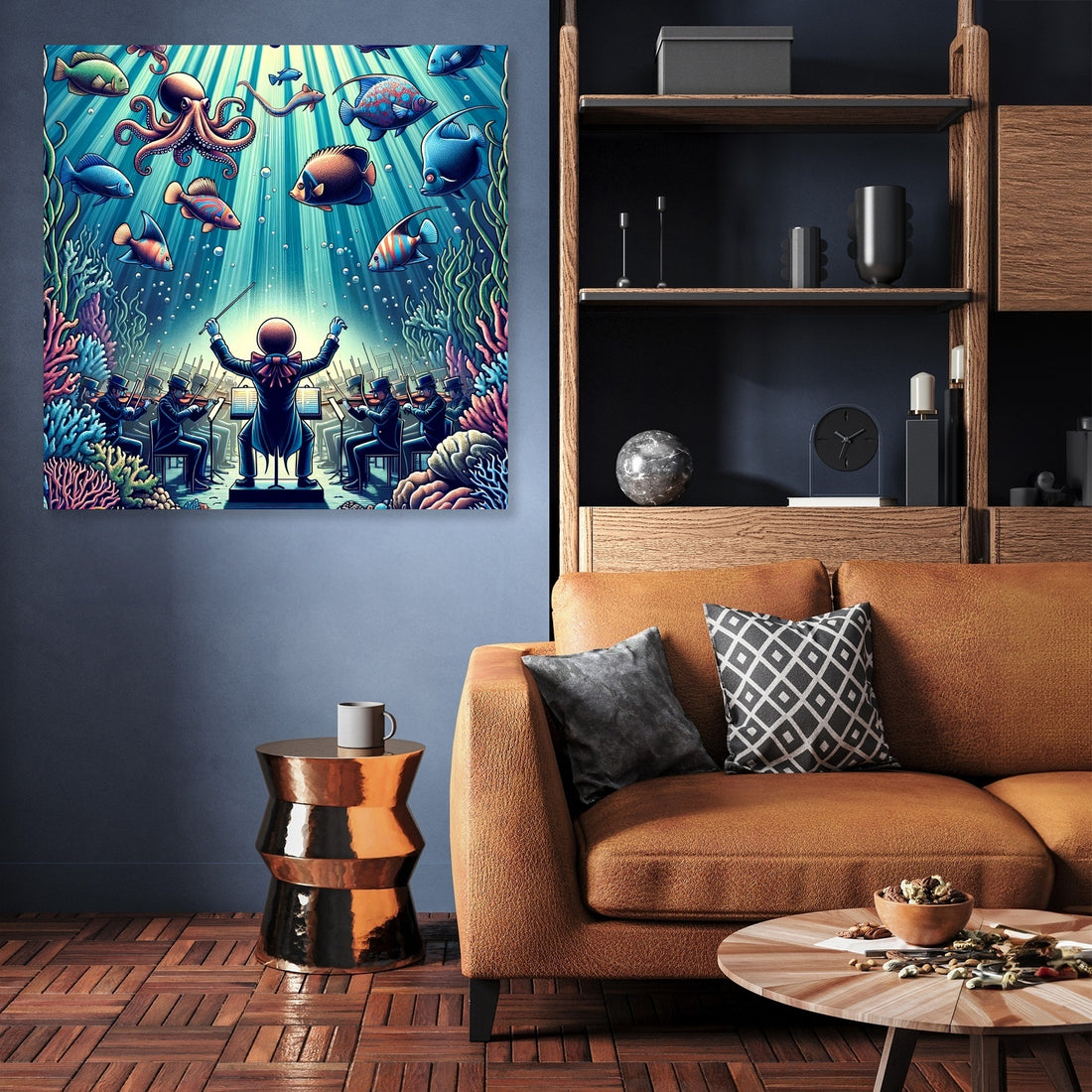 "Oceanic Overture Canvas" invites you into an enchanting underwater concert, where the sea's inhabitants showcase their musical talents. Led by a charismatic octopus conductor, marine animals adorned with pop art patterns perform a symphony of the deep. Coral stands and seaweed curtains frame the orchestra, their muted yet vibrant colors illuminating the ocean floor's bioluminescent glow. This captivating piece harmonizes the sea's natural wonders with the bold spirit of pop art, creating a mesmerizing visual melody that's perfect for any art lover's collection