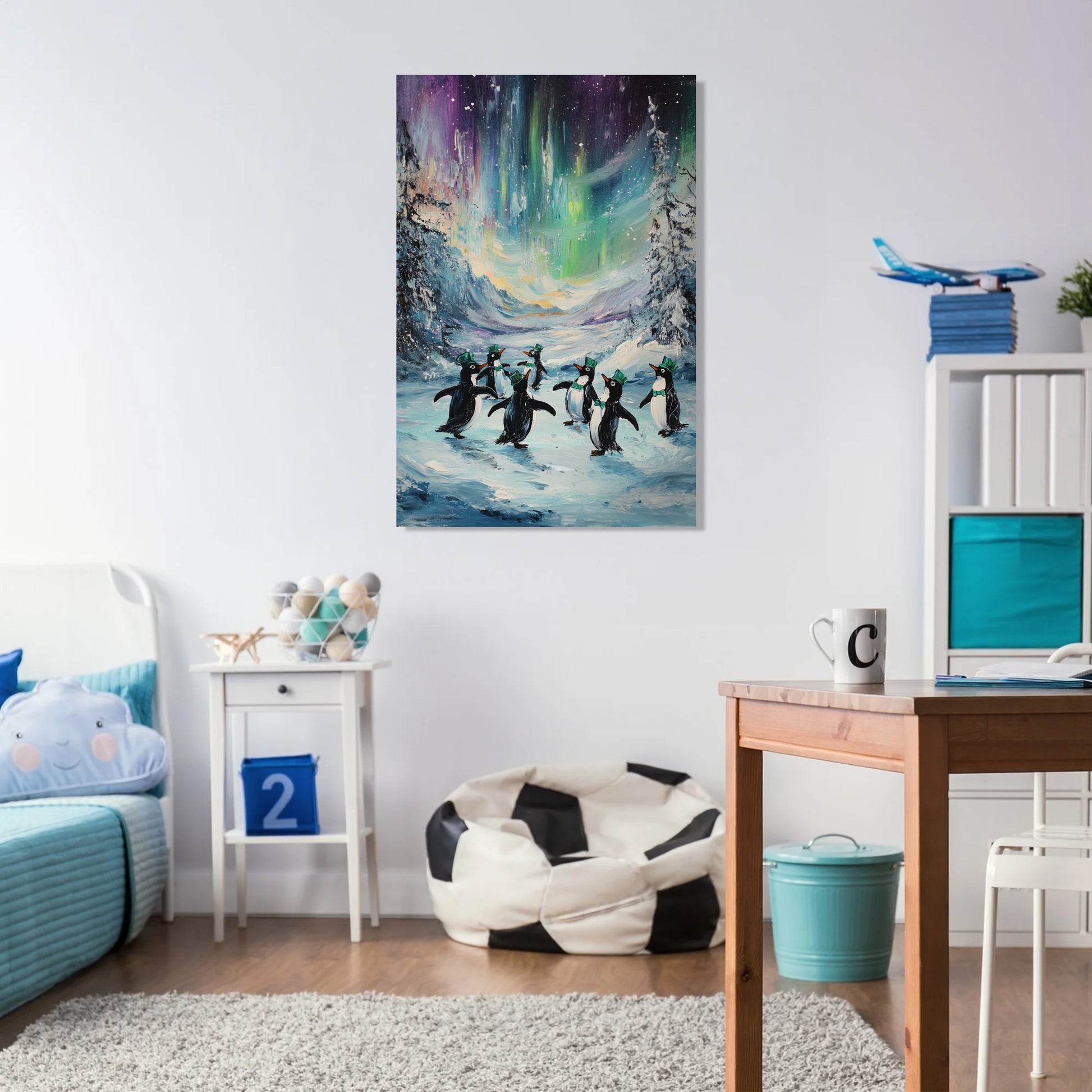This enchanting painting captures a delightful spectacle of penguins in dapper hats and bow ties, joyfully dancing on an icy stage. The mesmerising sweep of the Northern Lights above bathes the scene in a kaleidoscope of shimmering colours. Ideal as wall art for a child's room, it sparks imagination and brings a sense of wonder and playfulness. The dynamic composition and lively colours create a cheerful atmosphere, making it perfect for enhancing any young person's space.