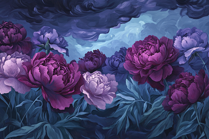 This striking piece explores the emotional nuances of a peony-filled garden under a foreboding sky. The composition teems with rich purples and blues, imprinting an impressionistic melancholy that suffuses the scene. Expressive brushstrokes conspire to sketch an intricate, dreamlike tapestry, resembling fleeting emotions caught in time. Ideal for both home and office spaces, this canvas art profoundly alters the ambience—lending an evocative depth or thoughtful stillness, equally augmenting sophisticated and modern interior designs.