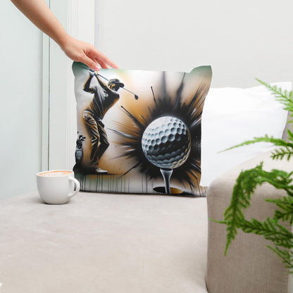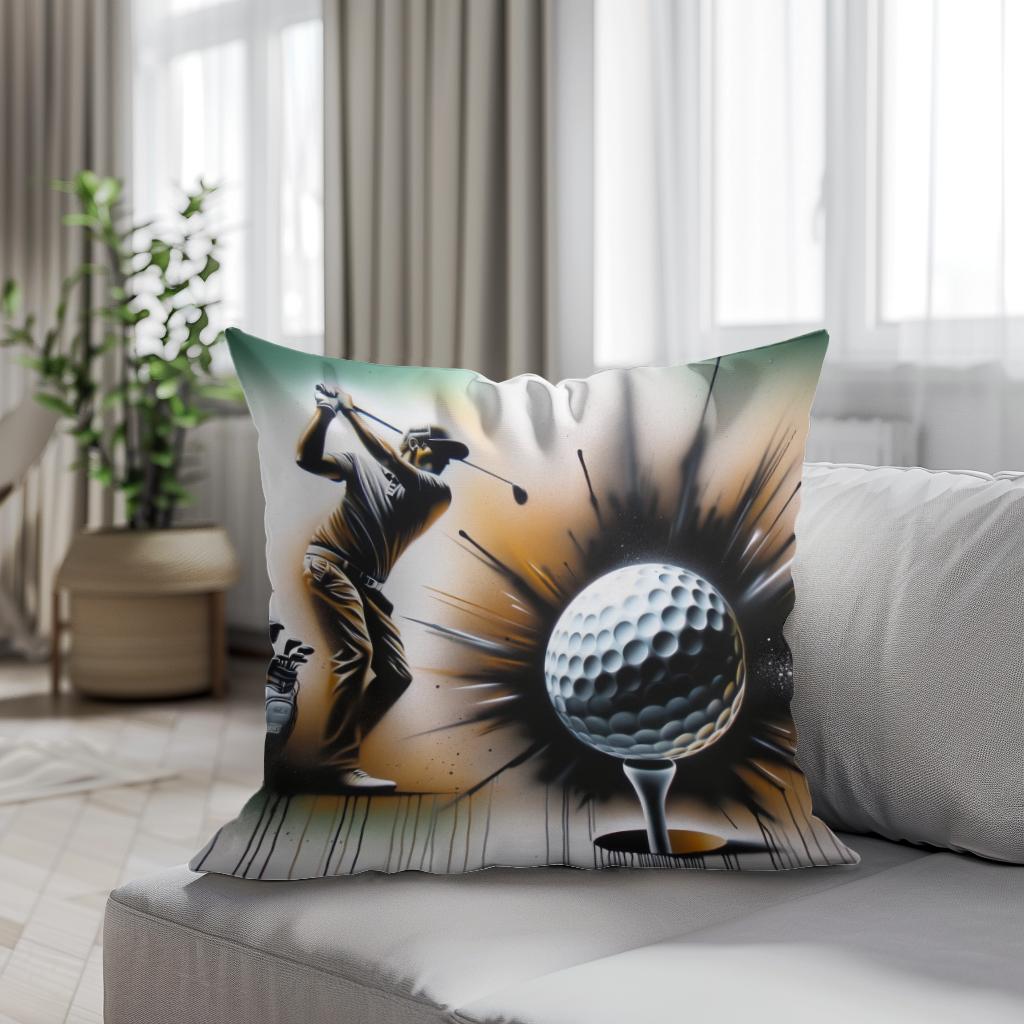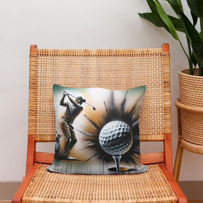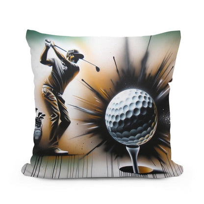 This dynamic printed cotton cushion features a striking golf-themed design, perfect for enthusiasts of the sport. The image illustrates a golfer mid-swing, expertly captured in a moment of intense concentration and motion, positioned beside a dramatically enlarged golf ball on a tee. The artwork is vibrant and detailed, with a realistic style enhanced by a dramatic burst effect around the golf ball, adding a sense of impact and energy to the scene. Ideal for adding a touch of style to any golfer's lounge or study