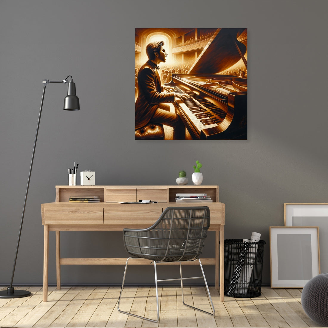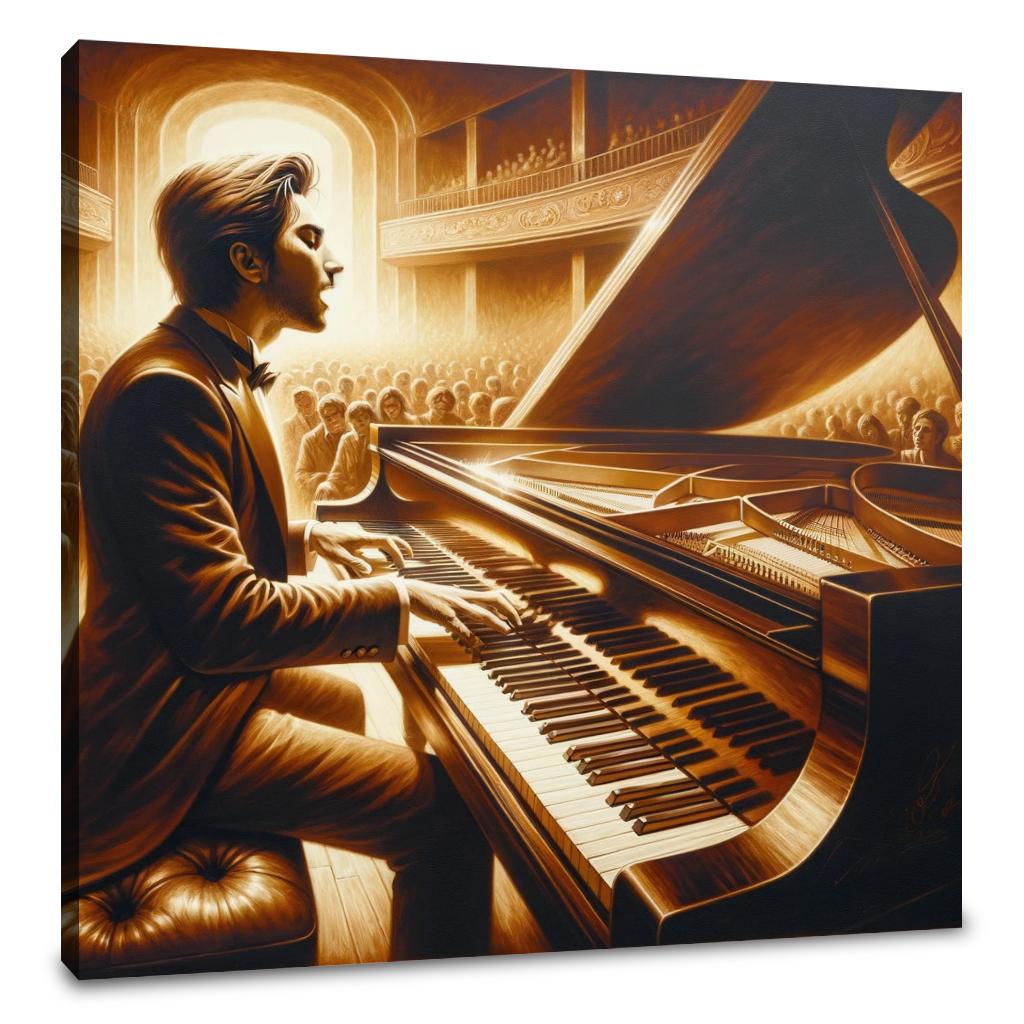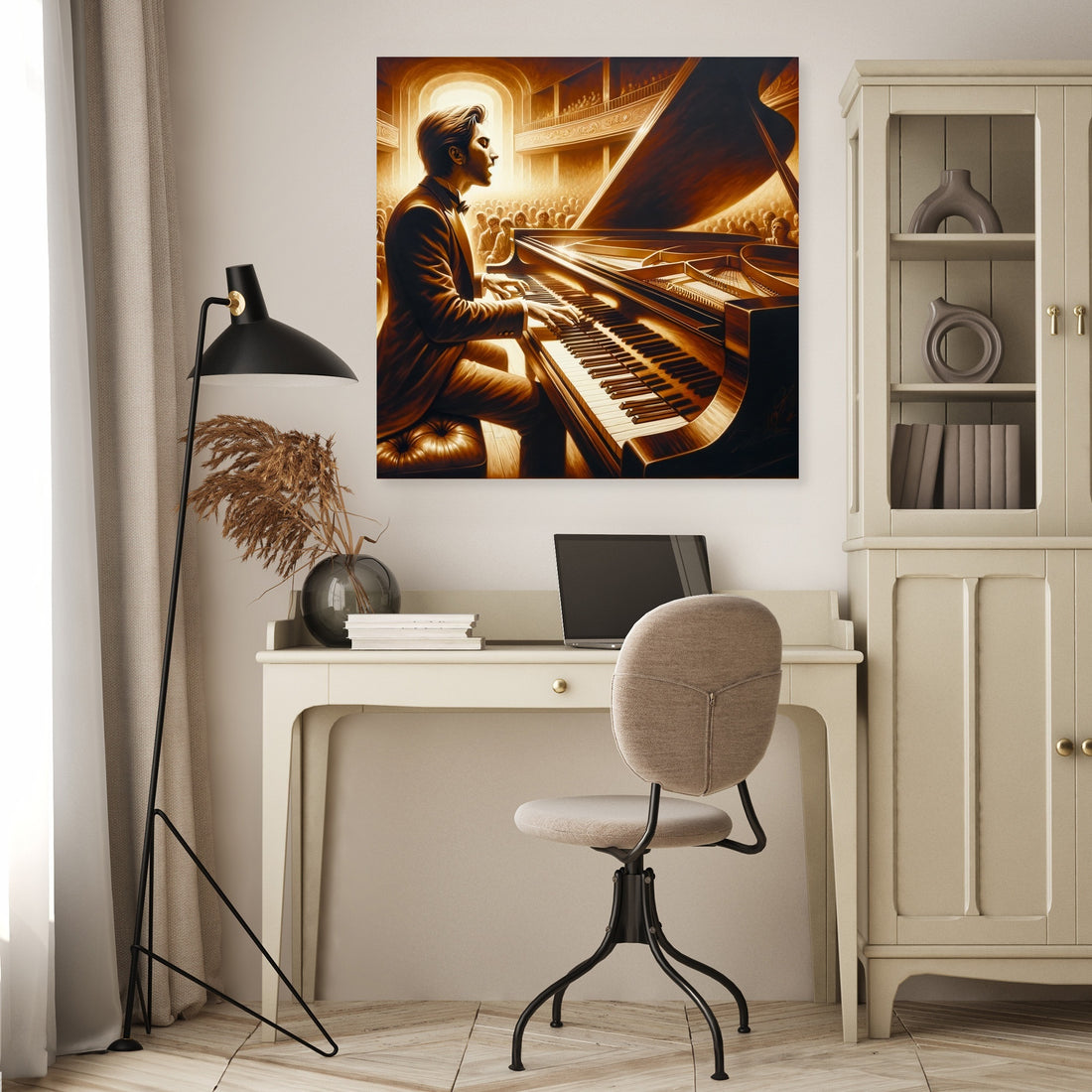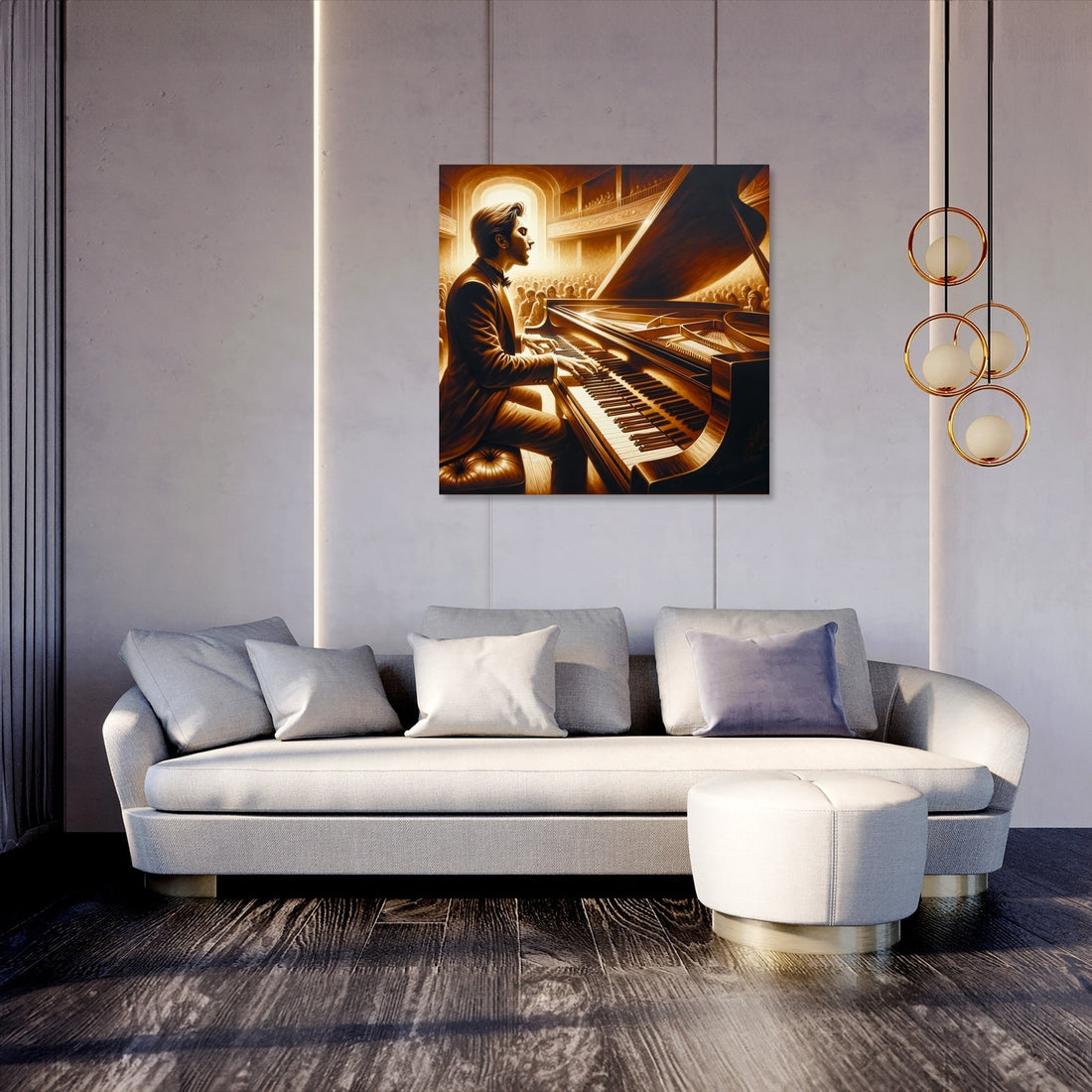 This elegant wall art captures a passionate pianist playing a grand piano in an opulent music hall. With fingers moving swiftly and confidently across the keys, the pianist's deep concentration and emotion are palpable. Warm, golden light fills the hall as the audience watches in rapt attention, celebrating the love for music and the power of performance.