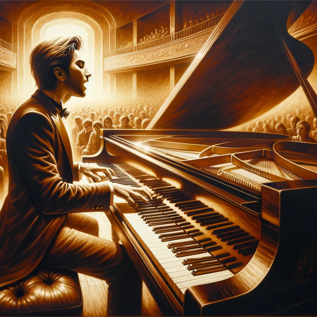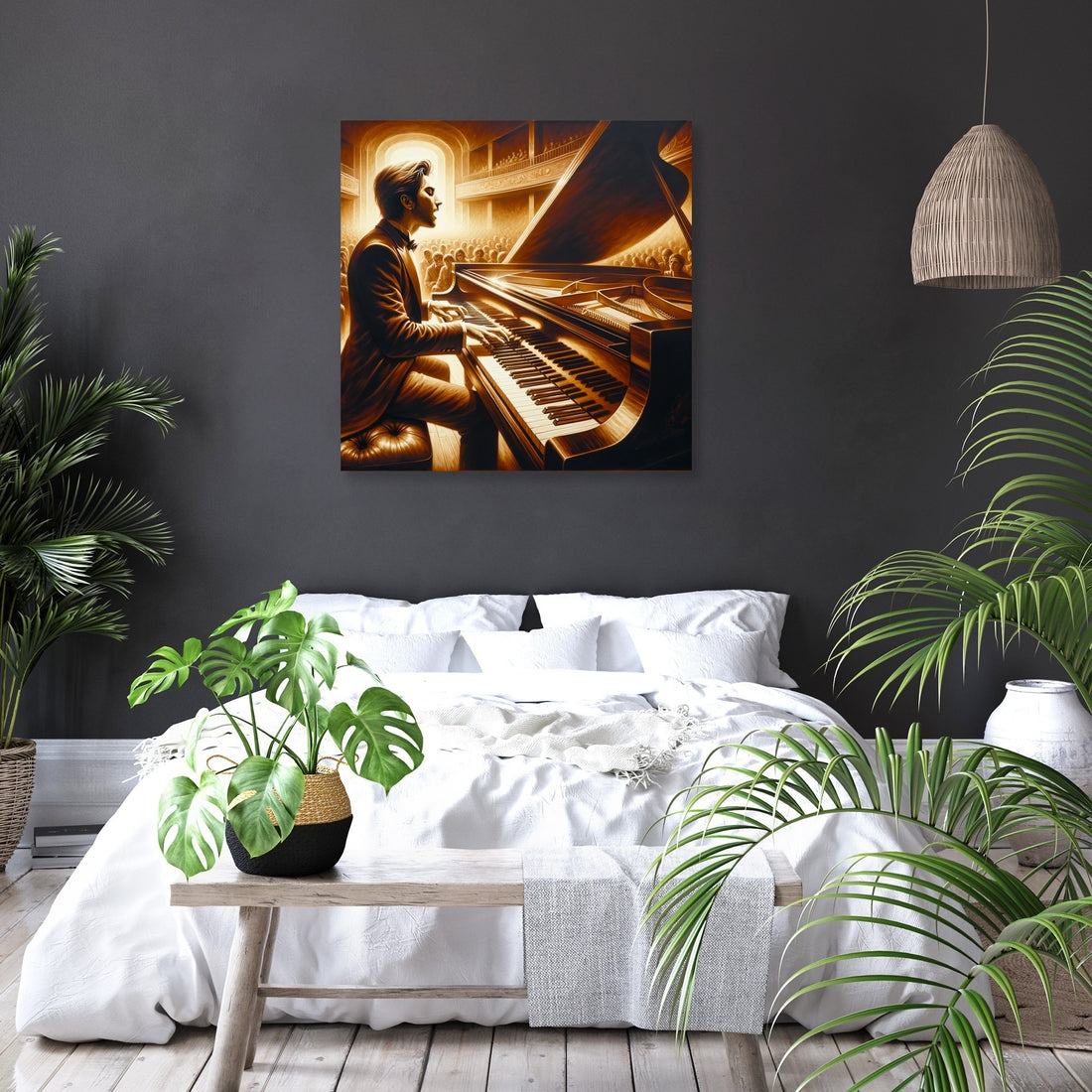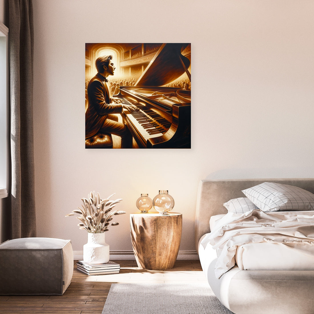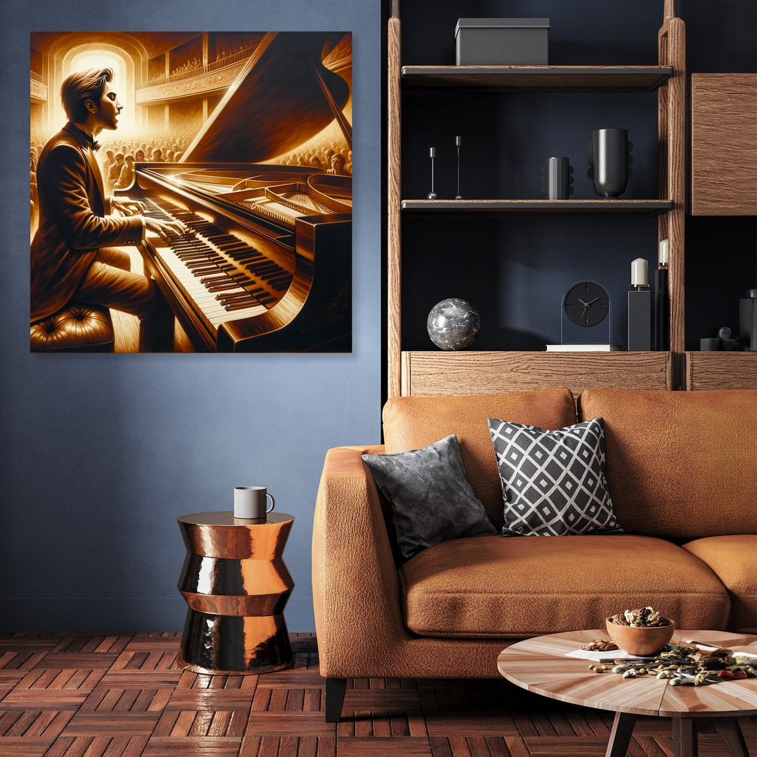 This elegant wall art captures a passionate pianist playing a grand piano in an opulent music hall. With fingers moving swiftly and confidently across the keys, the pianist's deep concentration and emotion are palpable. Warm, golden light fills the hall as the audience watches in rapt attention, celebrating the love for music and the power of performance.