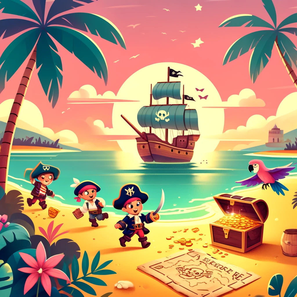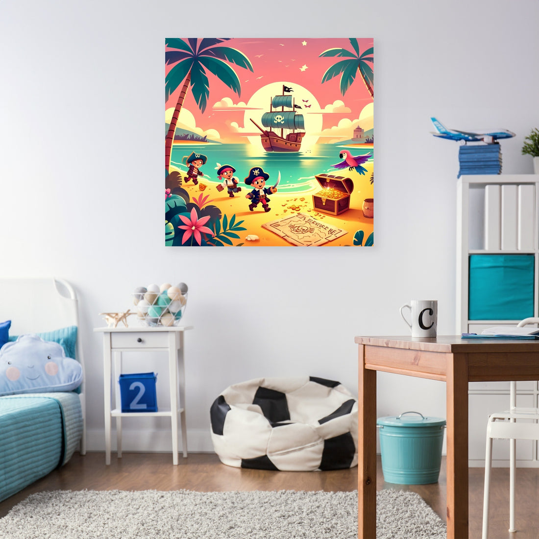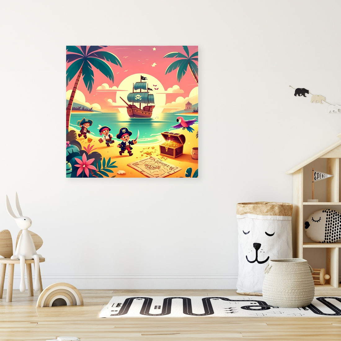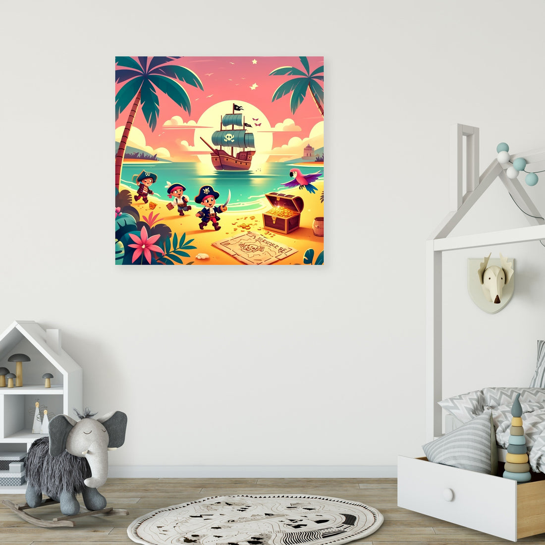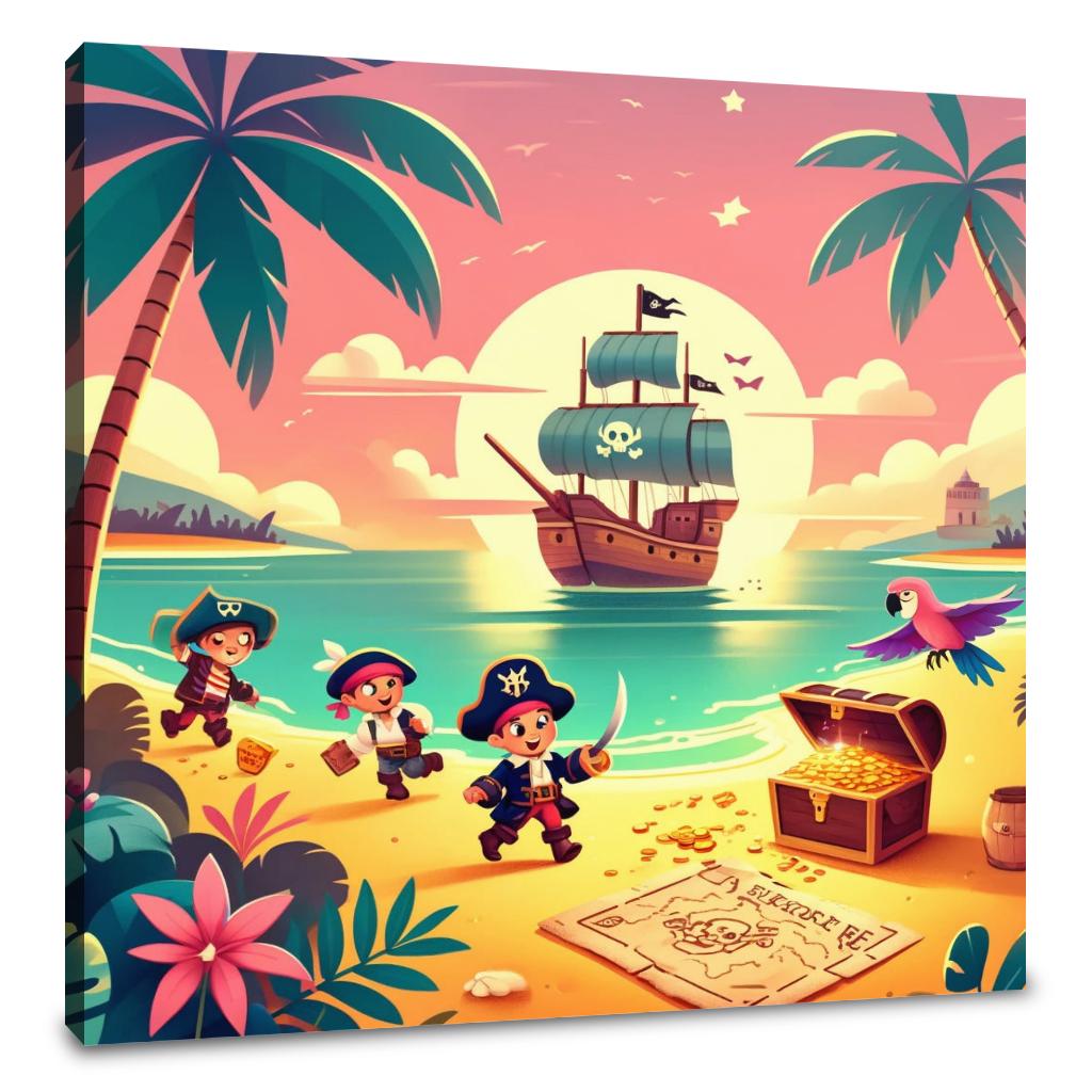 This playful wall art features an adventurous pirate scene with a ship sailing on a calm sea, a treasure map in hand, and a hidden treasure chest on a tropical island. The background showcases a soft sunset with hues of pink and orange. Pirates, including children dressed as pirates, joyfully search for the treasure. Palm trees, golden sands, and a parrot add to the excitement. Perfect for a child's room, nursery, or playroom, this artwork inspires a sense of fun and adventure.